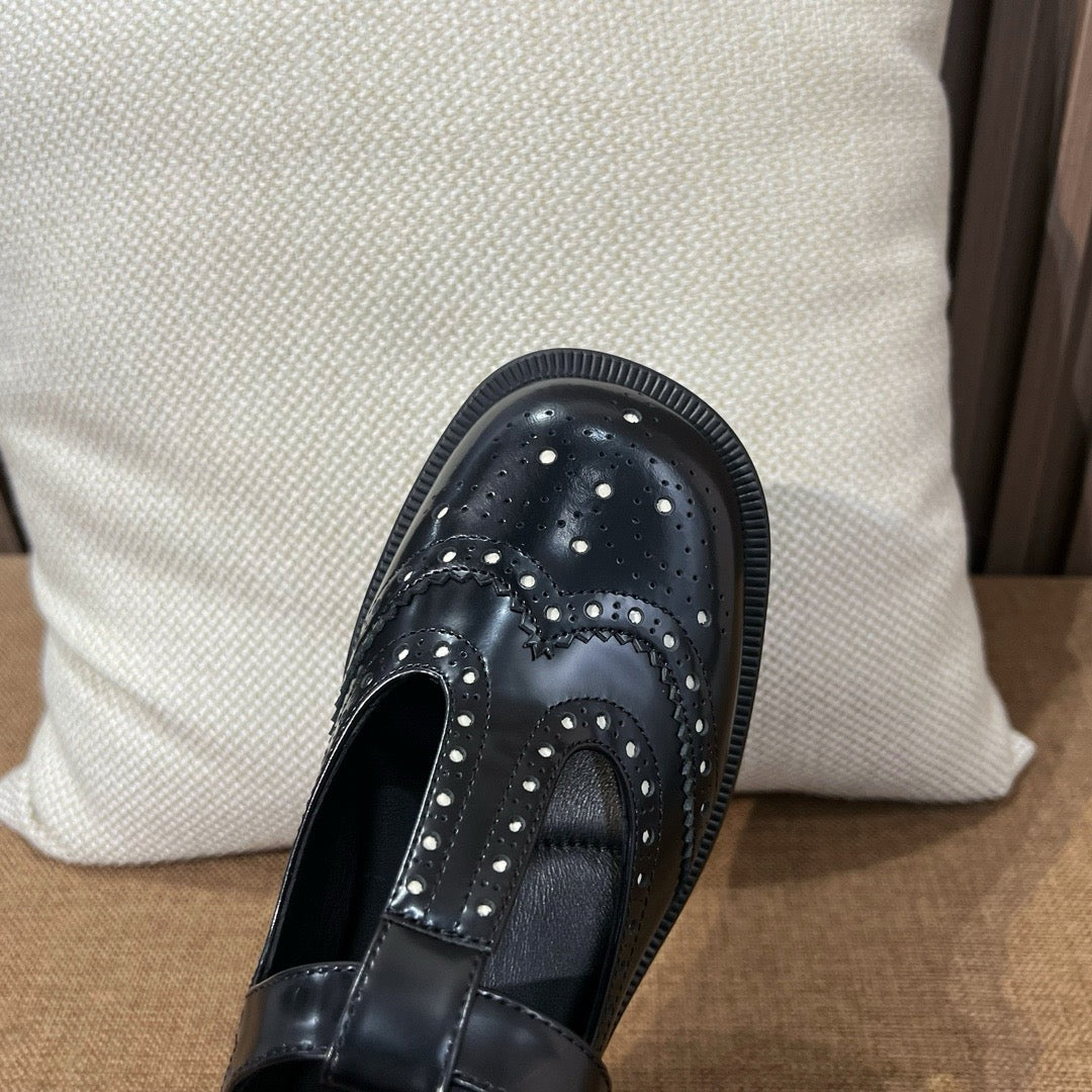 미우미우 브러쉬드 레더 티 스트랩 브로그 슈즈(Miu Miu Brushed Leather T-Strap Brogue Shoes) - 포멀과 캐주얼을 넘나드는 스타일링