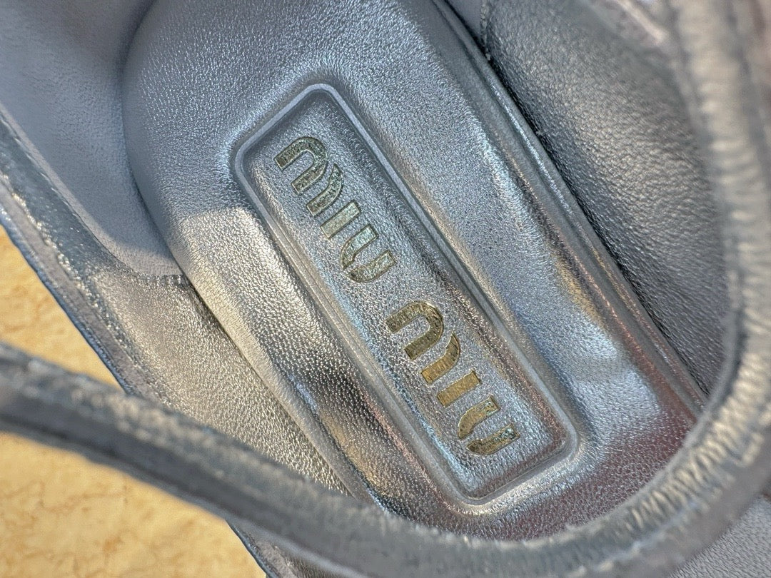 미우미우 사틴 샴브레이 크리스탈 슬링백 펌프스