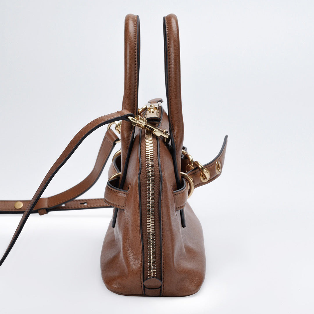 부드러운 램스킨 나파 가죽과 앤티크 골드 하드웨어, 탑핸들과 숄더 스트랩이 함께 구성된 실용적이고 세련된 스몰 사이즈 숄더백입니다.