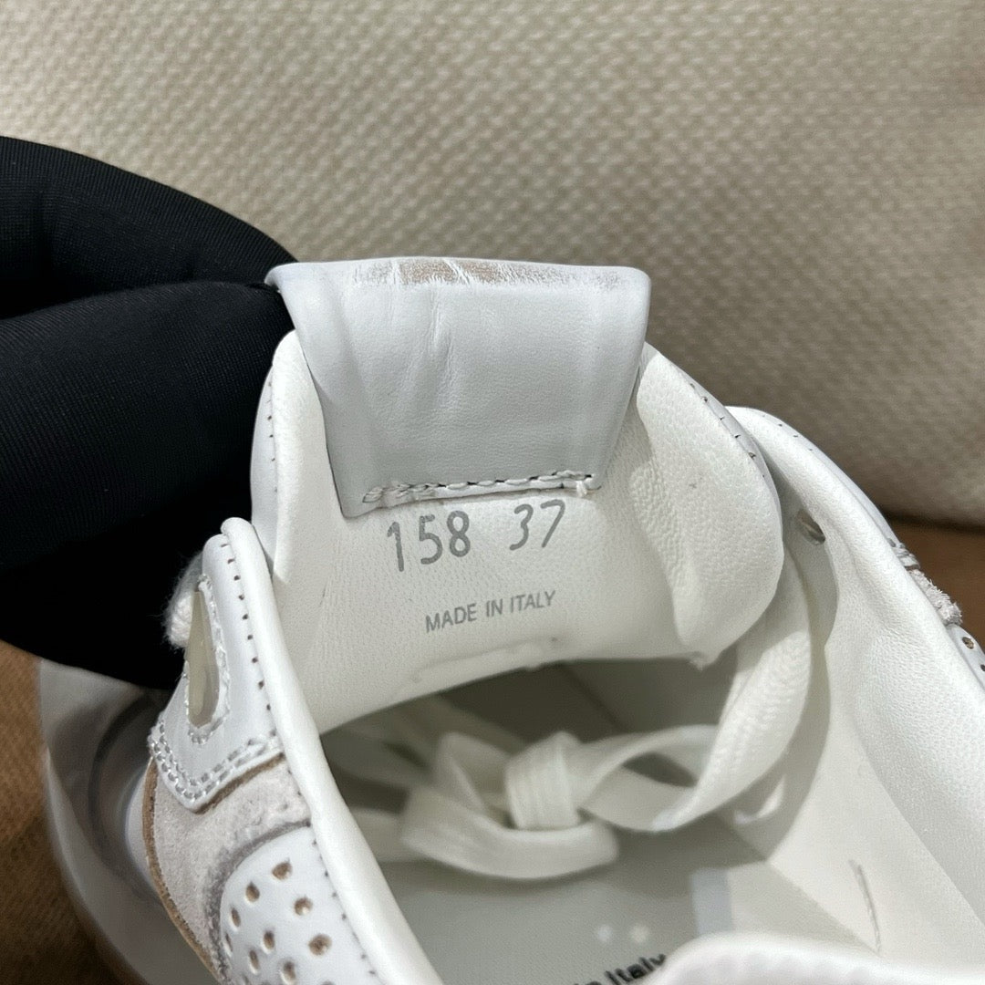 이 스니커즈는 고급 가죽 소재 위에 퍼퍼레이션(펀칭) 처리를 통해 시각적인 포인트와 함께 우수한 통기성을 제공합니다. 로우탑 스타일로 발목 라인을 자연스럽게 드러내며, 깔끔한 실루엣과 미우미우 특유의 로고 디테일이 세련미를 더해줍니다.