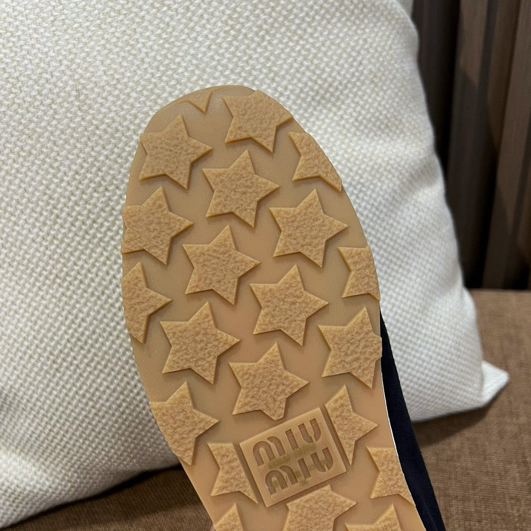 이 스니커즈는 미우미우 특유의 세련된 감성과 실용적인 디자인이 결합된 제품으로, 부드러운 스웨이드 어퍼와 플랫폼 스타일의 고무 밑창이 특징입니다. 신발 전체에 미묘한 텍스처감이 살아 있어 한층 고급스러운 인상을 주며, 발목을 안정감 있게 감싸는 실루엣으로 착용감을 높였습니다.