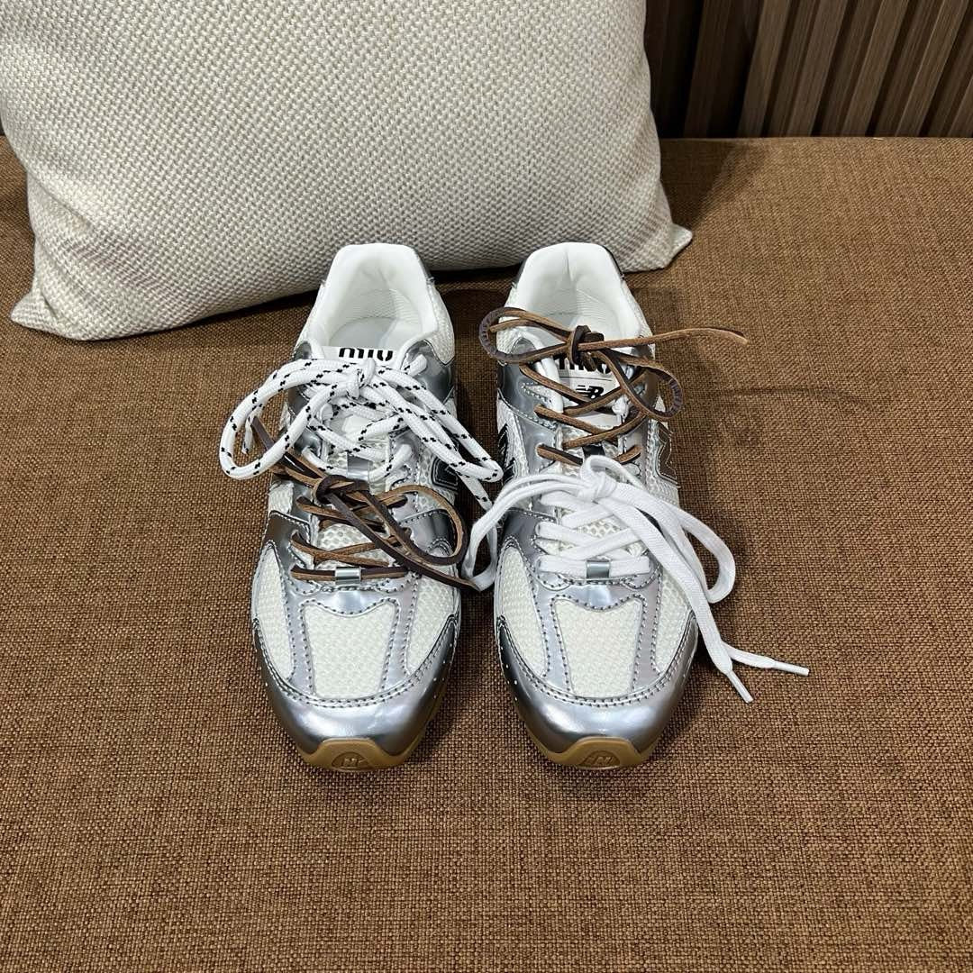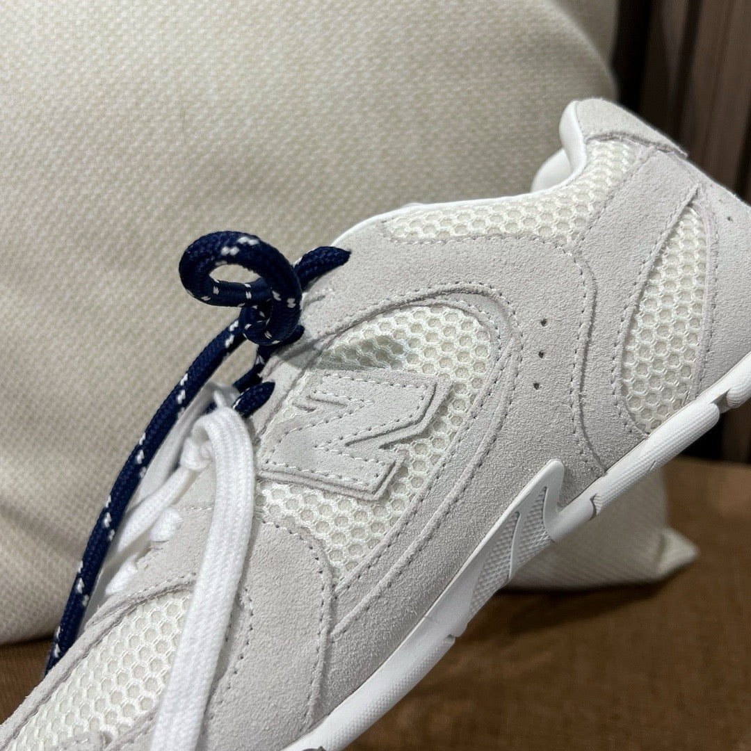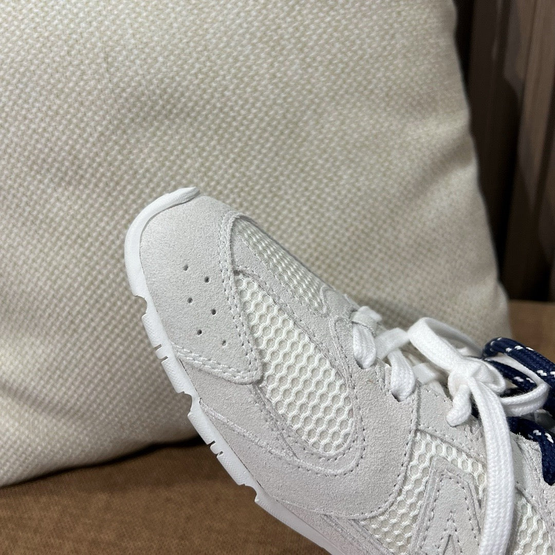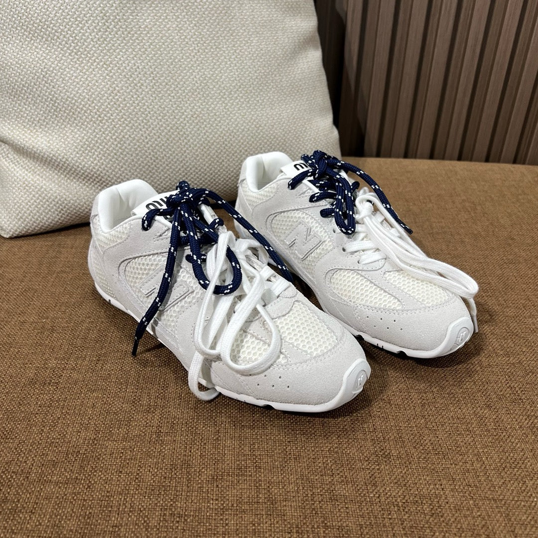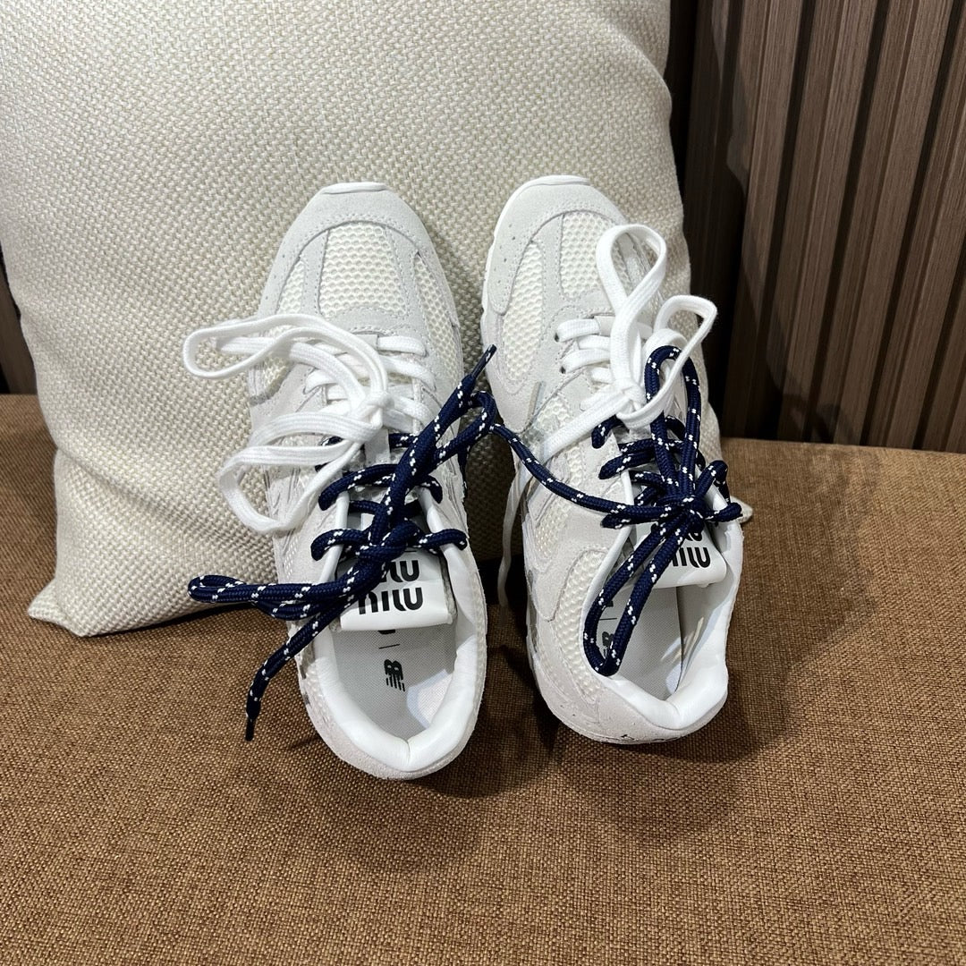 초경량 메쉬 소재를 중심으로 구성된 이 스니커즈는 통기성과 경량성을 극대화하여 장시간 착용에도 발의 피로를 줄여줍니다. 뉴발란스의 러닝화 실루엣을 기반으로 하되, 미우미우 특유의 미니멀하고 고급스러운 터치를 더해 하이패션 무드를 완성했습니다. 사이드에는 상징적인 'N' 로고와 함께 미우미우 브랜딩이 정교하게 적용되어 브랜드 정체성을 동시에 전달합니다.