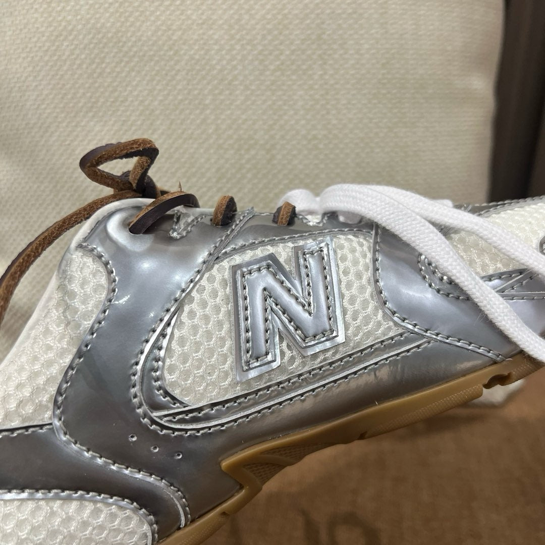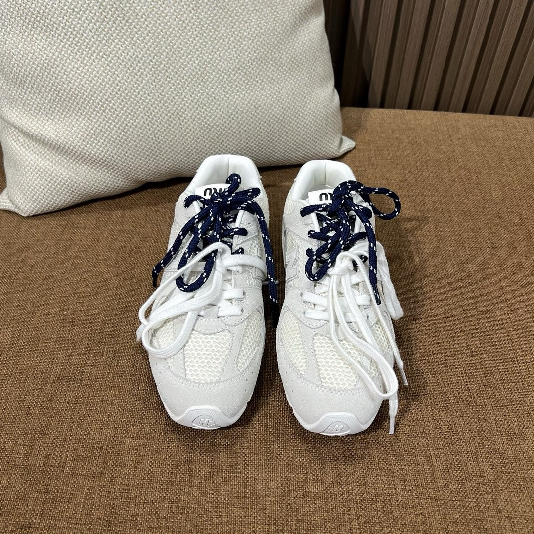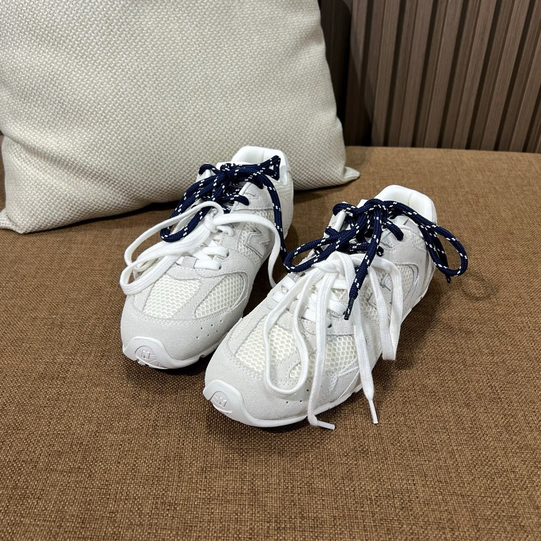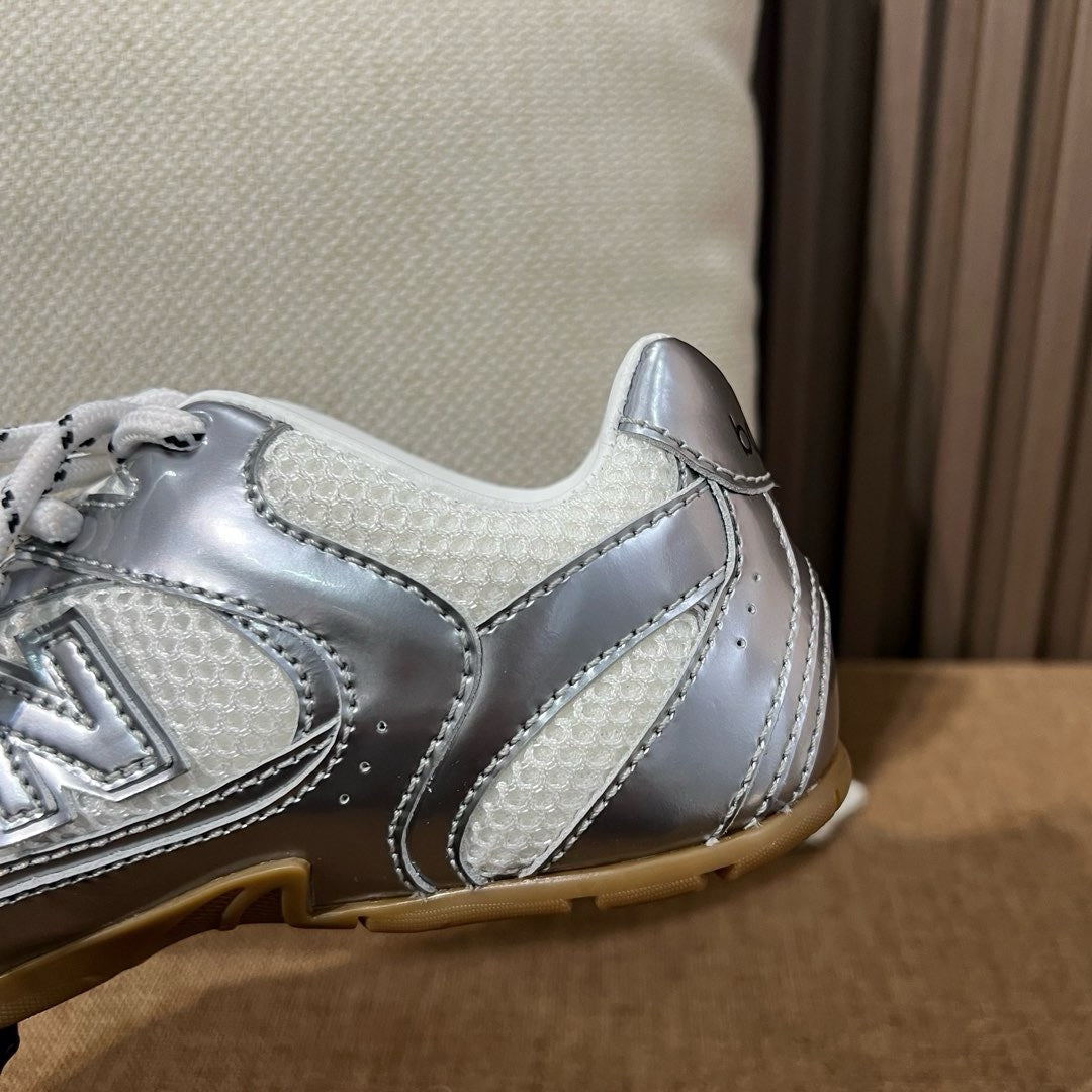 초경량 메쉬 소재를 중심으로 구성된 이 스니커즈는 통기성과 경량성을 극대화하여 장시간 착용에도 발의 피로를 줄여줍니다. 뉴발란스의 러닝화 실루엣을 기반으로 하되, 미우미우 특유의 미니멀하고 고급스러운 터치를 더해 하이패션 무드를 완성했습니다. 사이드에는 상징적인 'N' 로고와 함께 미우미우 브랜딩이 정교하게 적용되어 브랜드 정체성을 동시에 전달합니다.