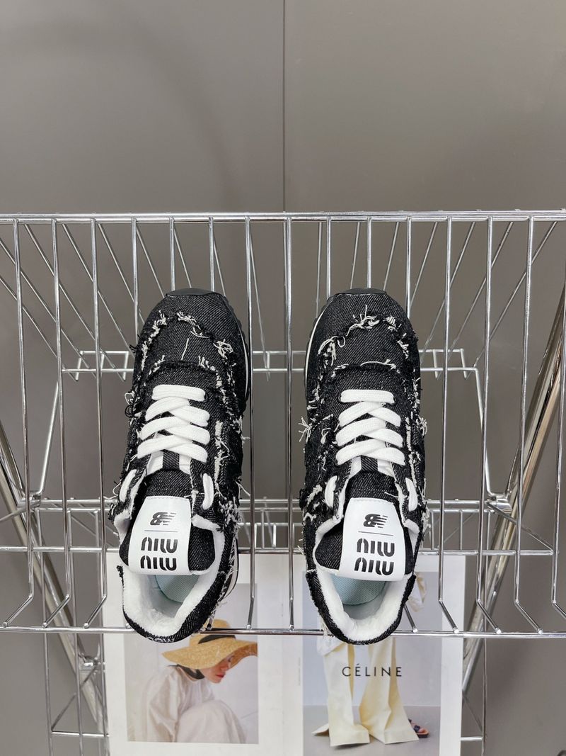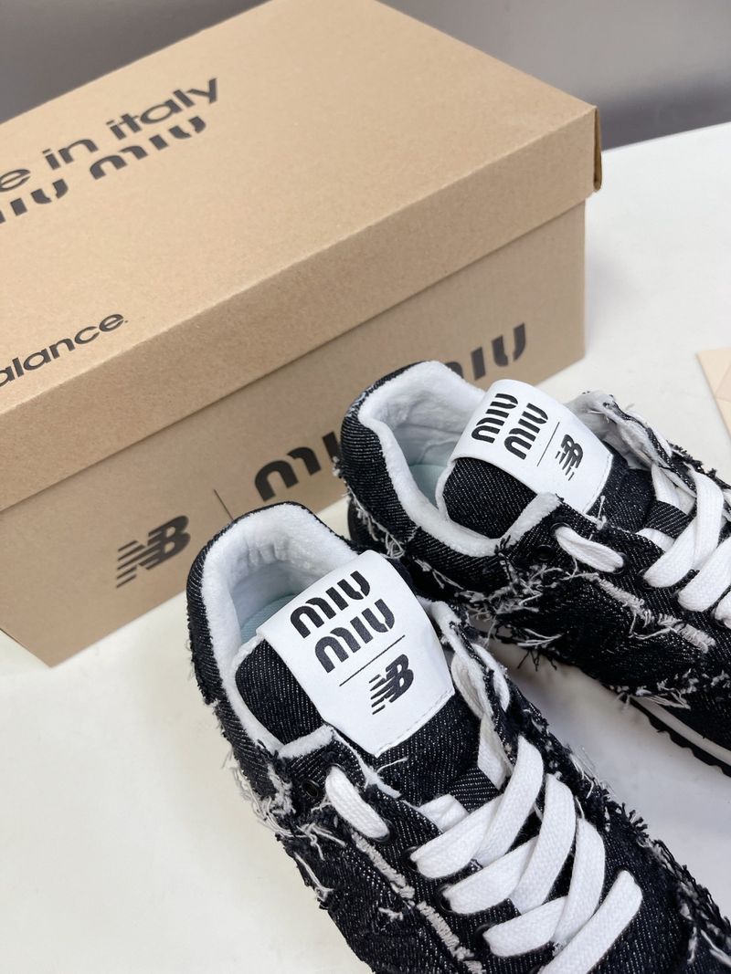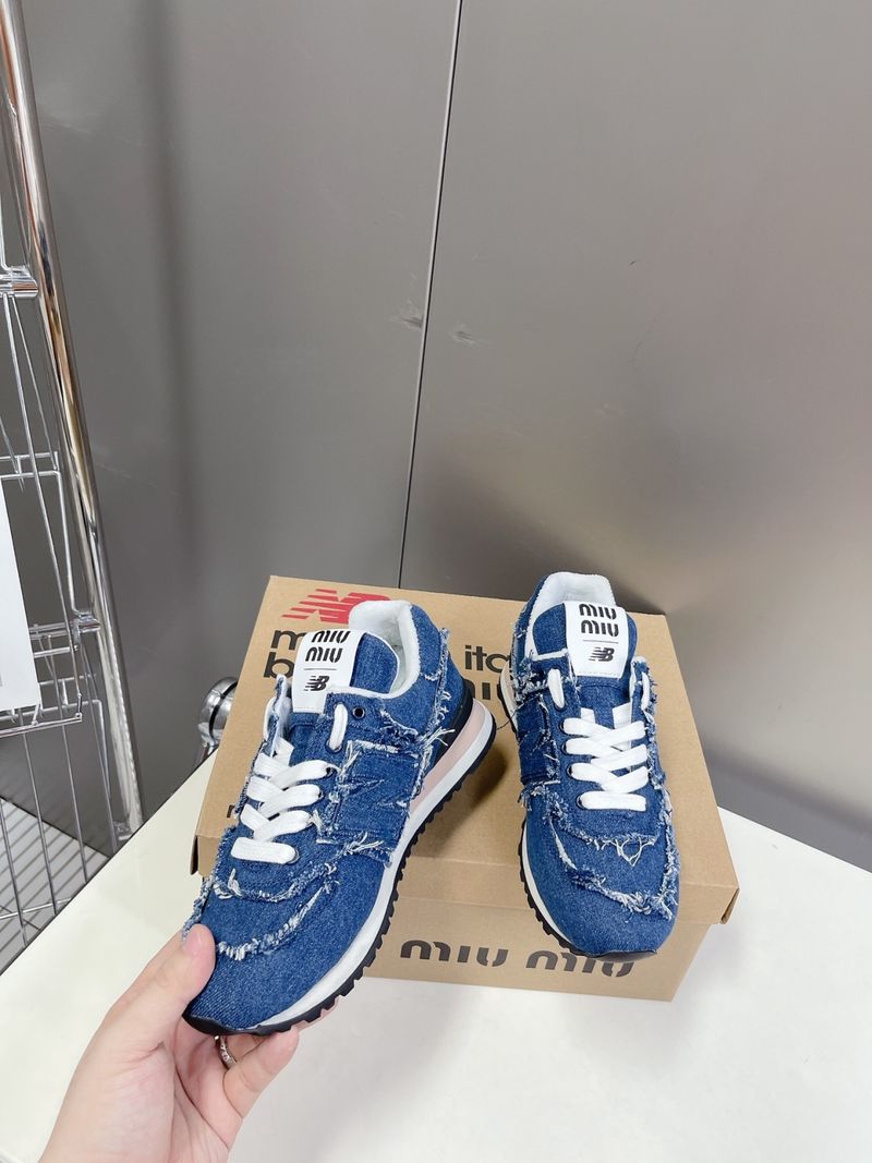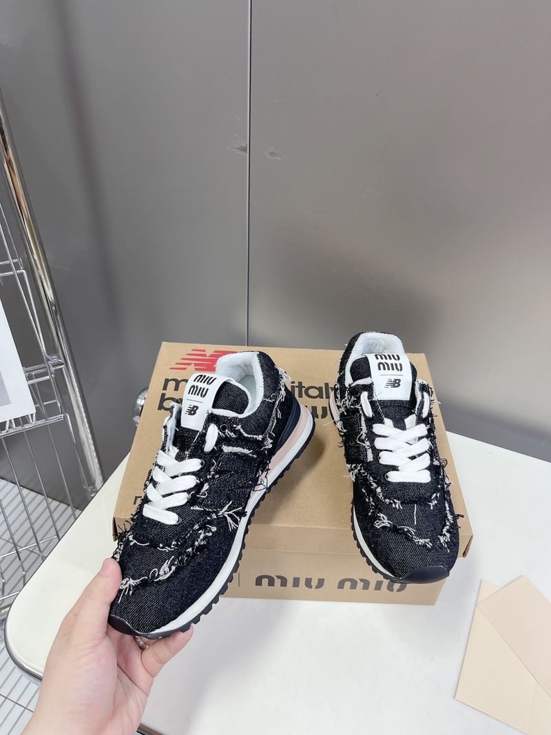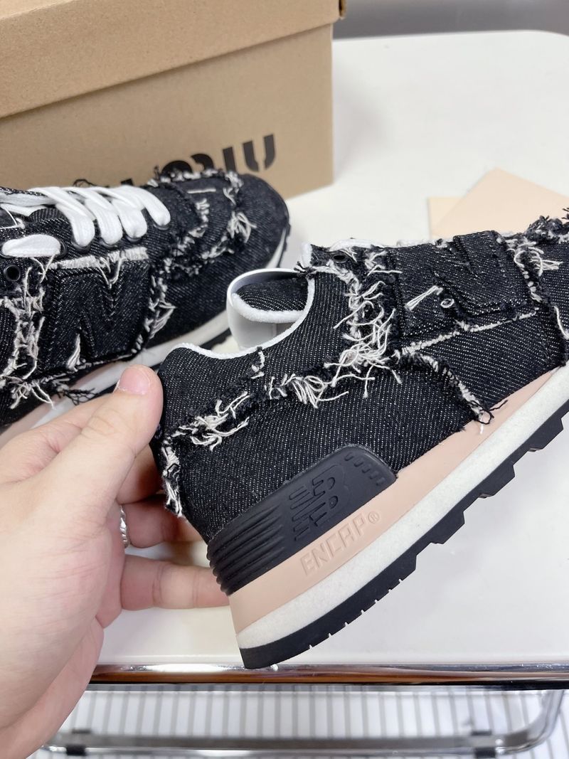 이 스니커즈는 뉴발란스의 아이코닉한 574 모델을 기반으로 미우미우 특유의 해체적이고 실험적인 디자인이 가미된 것이 특징입니다. 컷오프 디테일, 프레이 진 소재, 데님 또는 가죽 마감 등으로 고급스럽고 개성 있는 무드를 연출합니다.