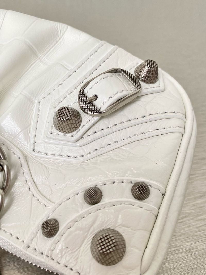 르 카골 미니는 과거 2000년대 바이커 백에서 영감을 받아 재해석된 디자인으로, 주름진 듯한 부드러운 가죽, 메탈 하드웨어, 태슬, 미러 참 등 독특한 요소들이 조화를 이룹니다. 곡선형 구조와 구조감 있는 실루엣이 세련된 빈티지 감성을 전달하며, 발렌시아가의 감각적인 로고가 디테일을 완성합니다.