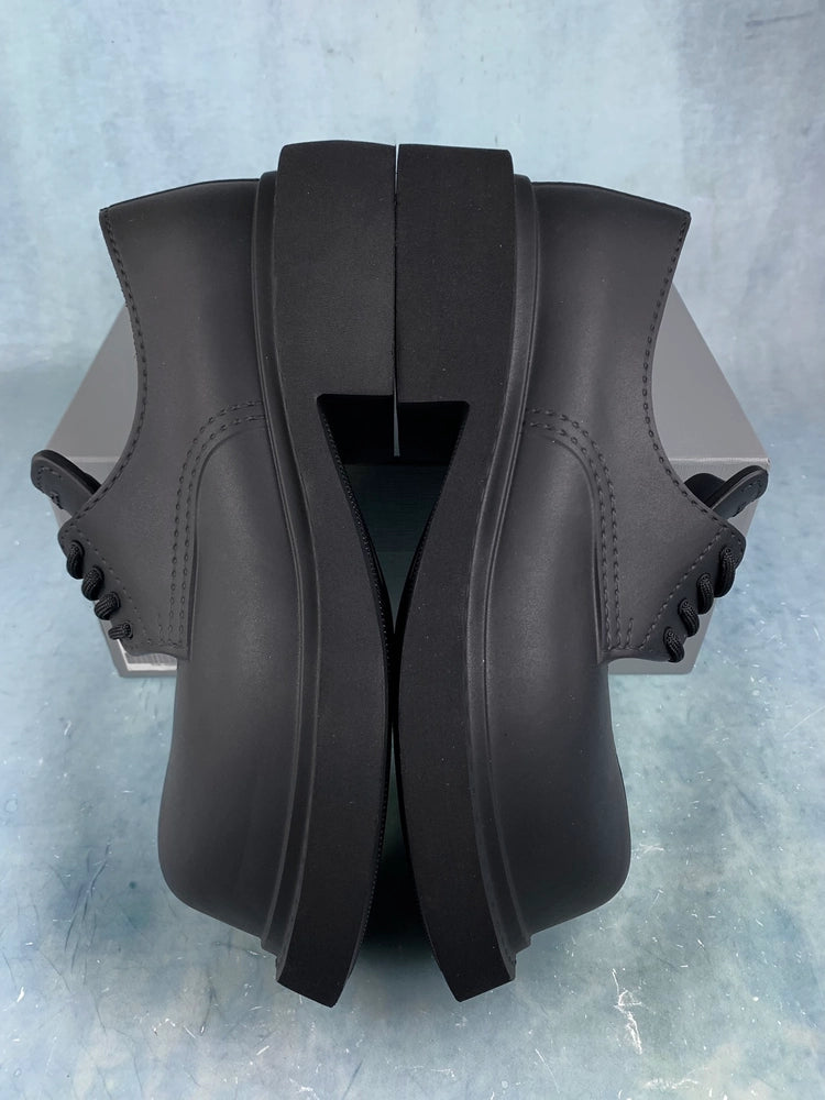 스테로이드 더비는 전통적인 더비 슈즈 디자인을 베이스로 하면서도, 고무를 주입한 듯한 극단적인 아웃솔과 볼드한 실루엣으로 새로운 감각을 선보입니다. 블랙 색상의 유광 가죽은 고급스러움을 더하며, 발등을 감싸는 구조는 포멀한 룩에도 완벽히 어우러집니다.