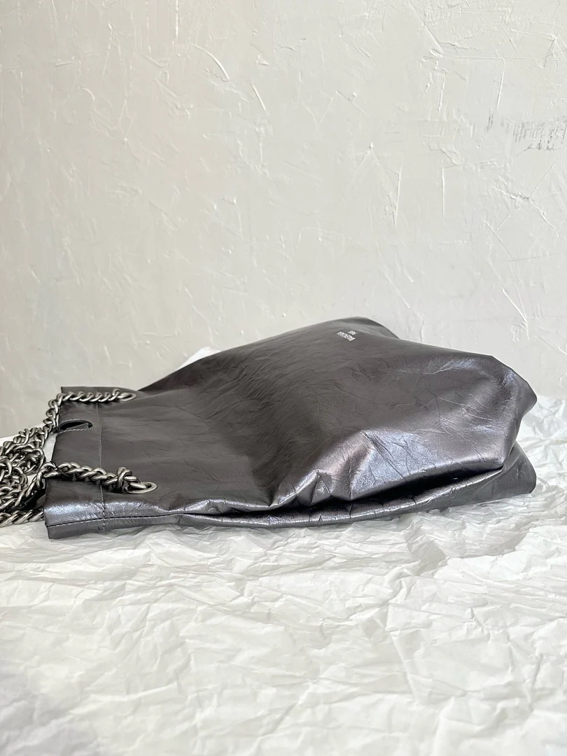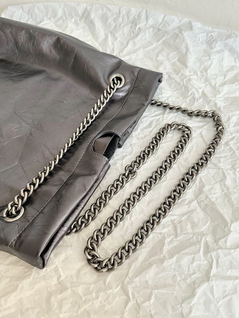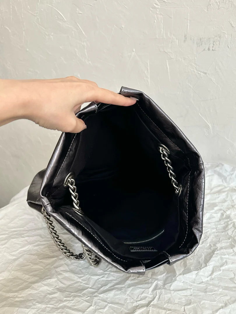여유로운 내부 공간과 지퍼 포켓 구성으로 노트북, 파우치, 다이어리 등 다양한 소지품을 정리하기에 용이합니다. 체인 스트랩은 숄더 또는 크로스백으로도 활용할 수 있습니다.