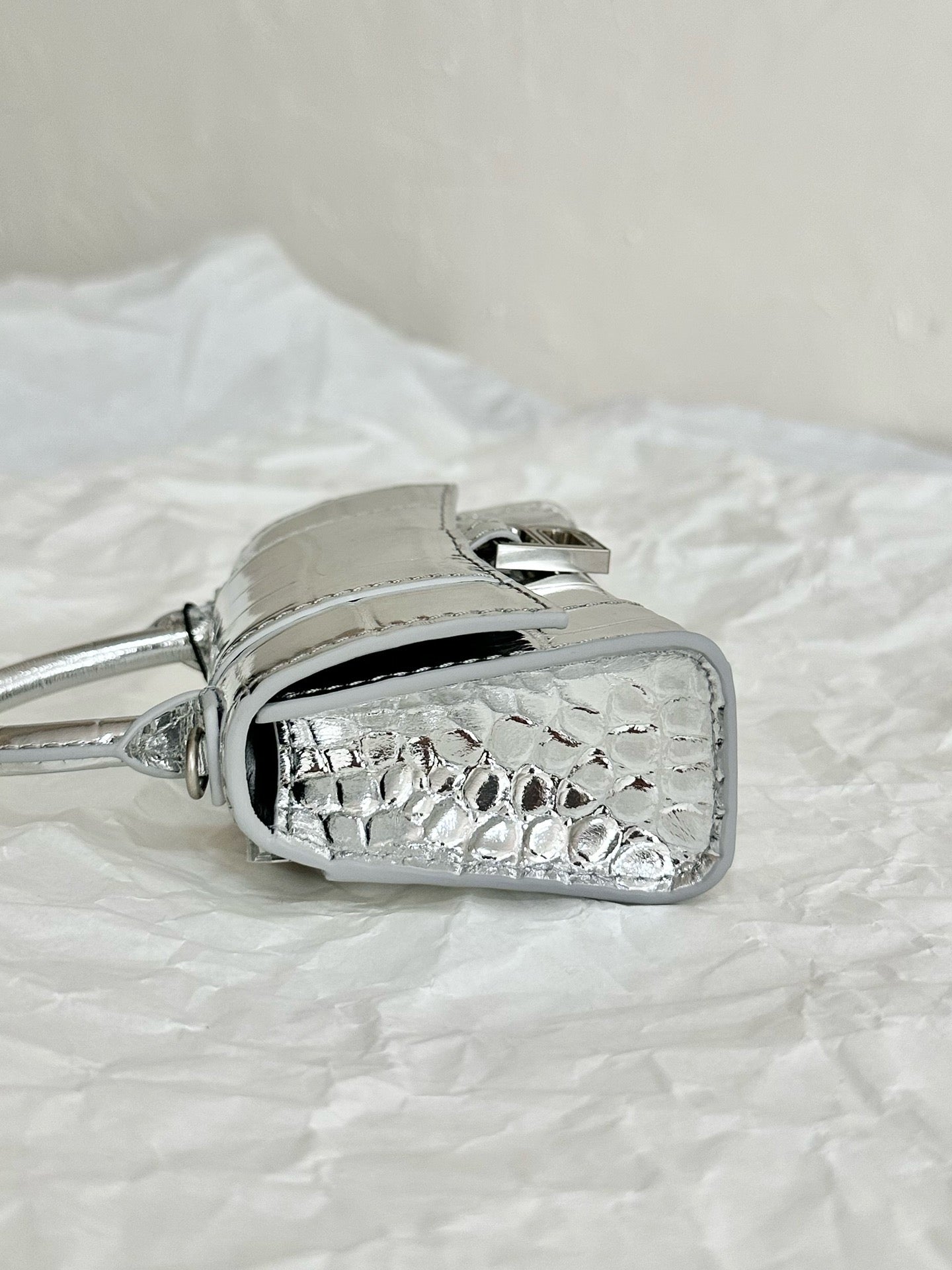 이 제품은 이름 그대로 모래시계(Hourglass) 형태에서 영감을 받은 곡선형 실루엣이 특징입니다. 크로커 엠보싱 처리된 고급 송아지 가죽이 우아함을 더하며, 구조적인 디자인은 어떤 룩에도 존재감을 부여합니다. XS 사이즈는 작지만 시선을 끄는 포인트 아이템으로, 미니멀한 스타일링에 적합합니다.