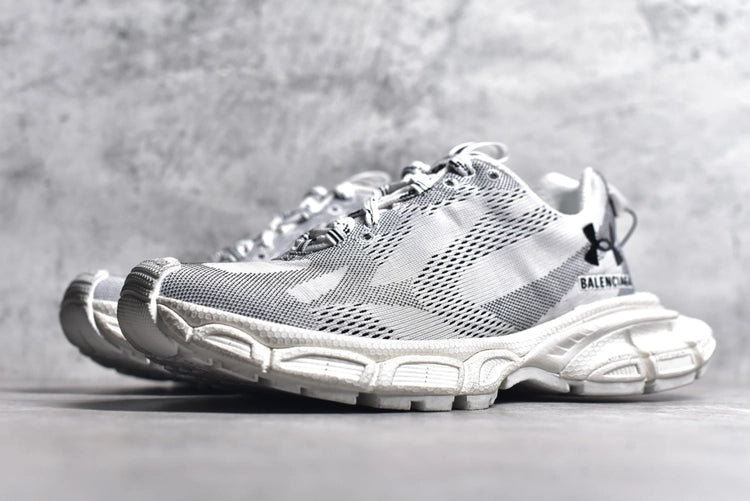 올화이트와 블랙 포인트가 조화를 이루는 이 모델은 니트 어퍼 특유의 유연성과 통기성이 뛰어나며, 언더아머의 퍼포먼스 기술이 반영된 고기능 구조와 발렌시아가의 볼드한 디자인 감각이 어우러져 독창적인 인상을 전달합니다. 외부의 레이어 구조와 과장된 아웃솔은 미래지향적인 미학을 상징합니다.