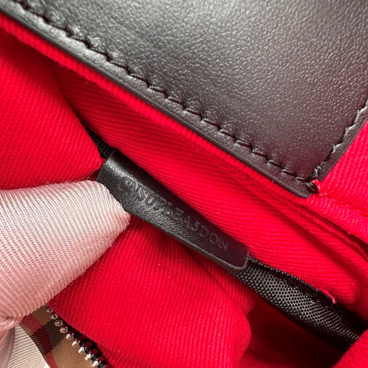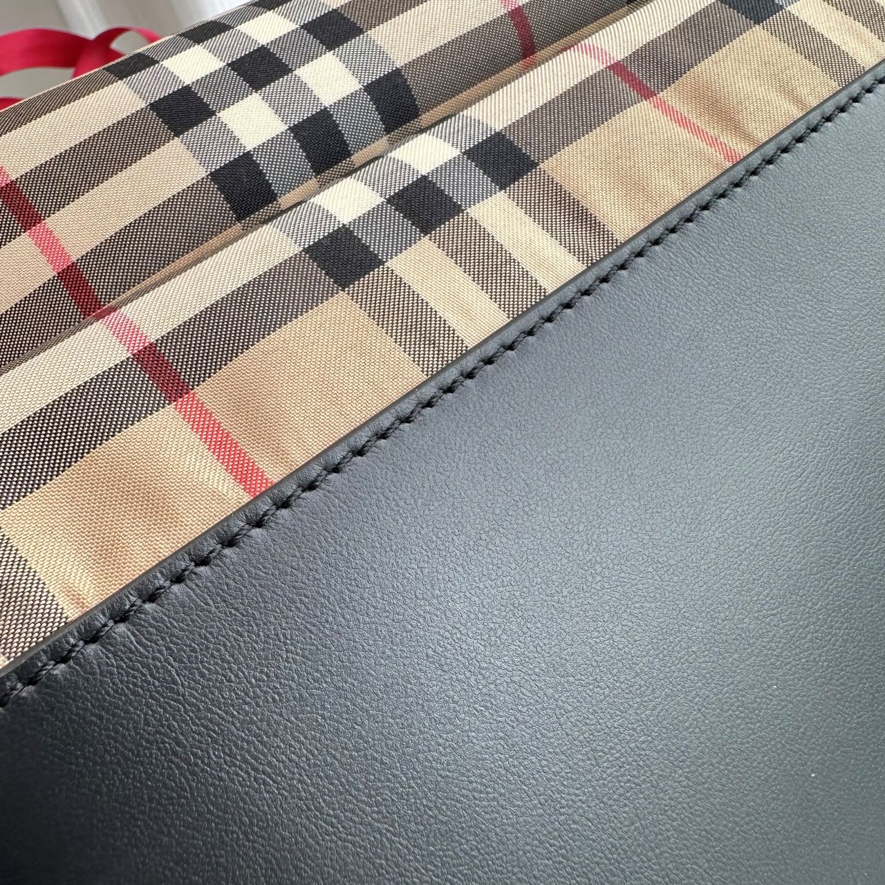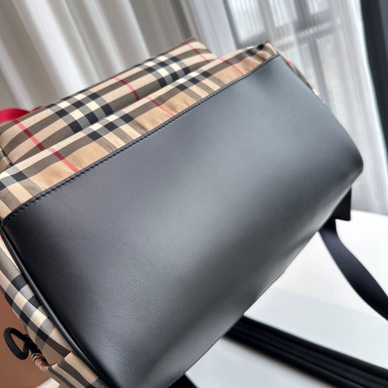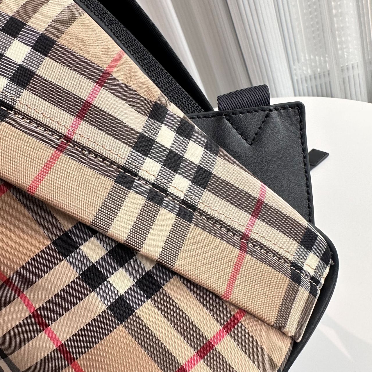 버버리의 아이코닉한 빈티지 체크 패턴이 전면에 적용되어 클래식하면서도 모던한 분위기를 자아냅니다. 가볍고 튼튼한 코튼 캔버스 또는 테크니컬 나일론 소재와 가죽 트리밍이 조화를 이루며, 구조적인 실루엣이 고급스러운 인상을 완성합니다.