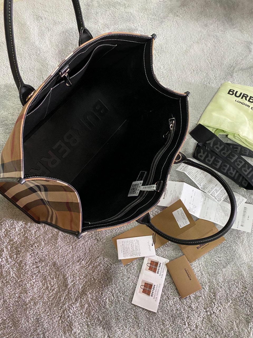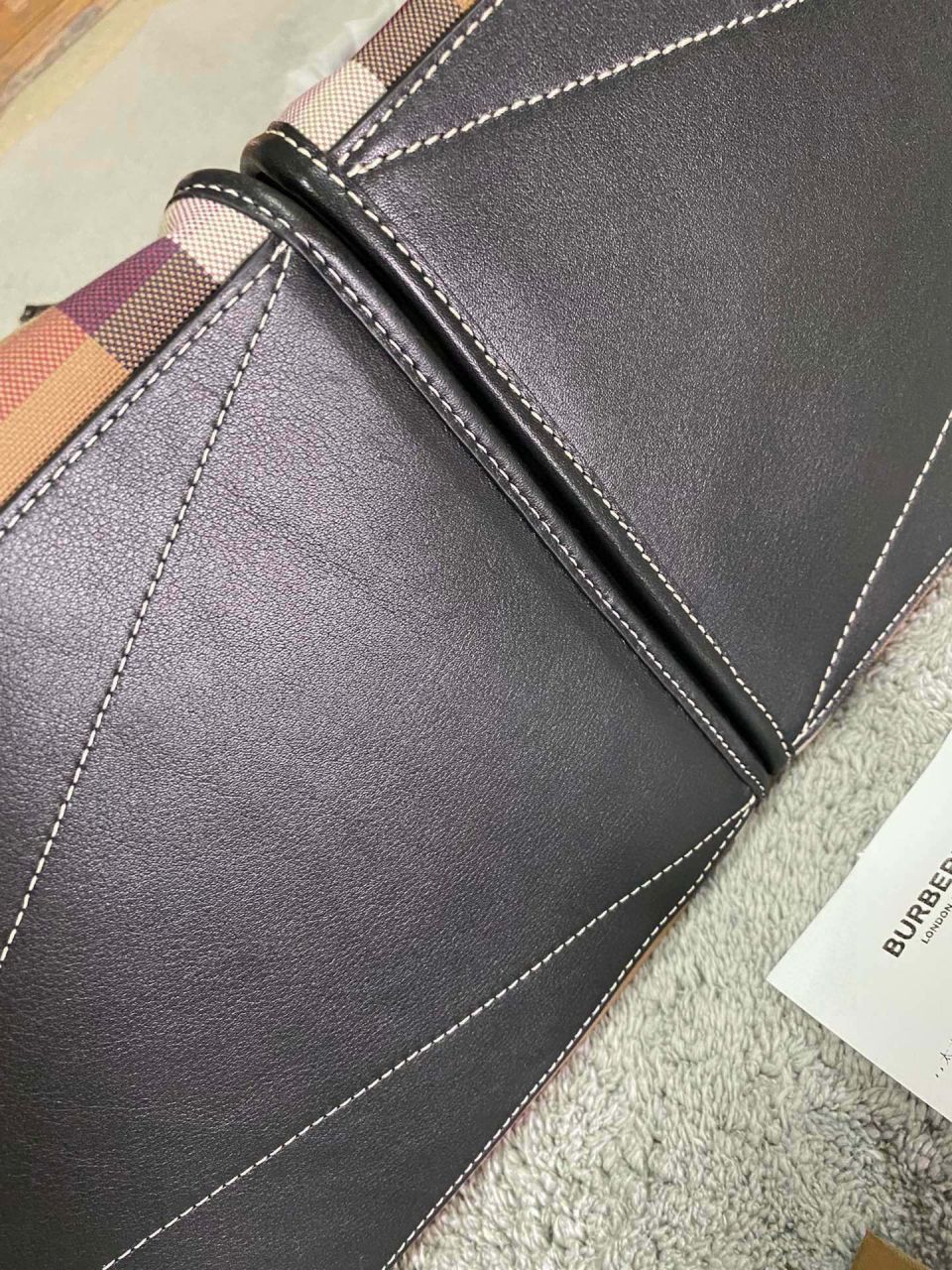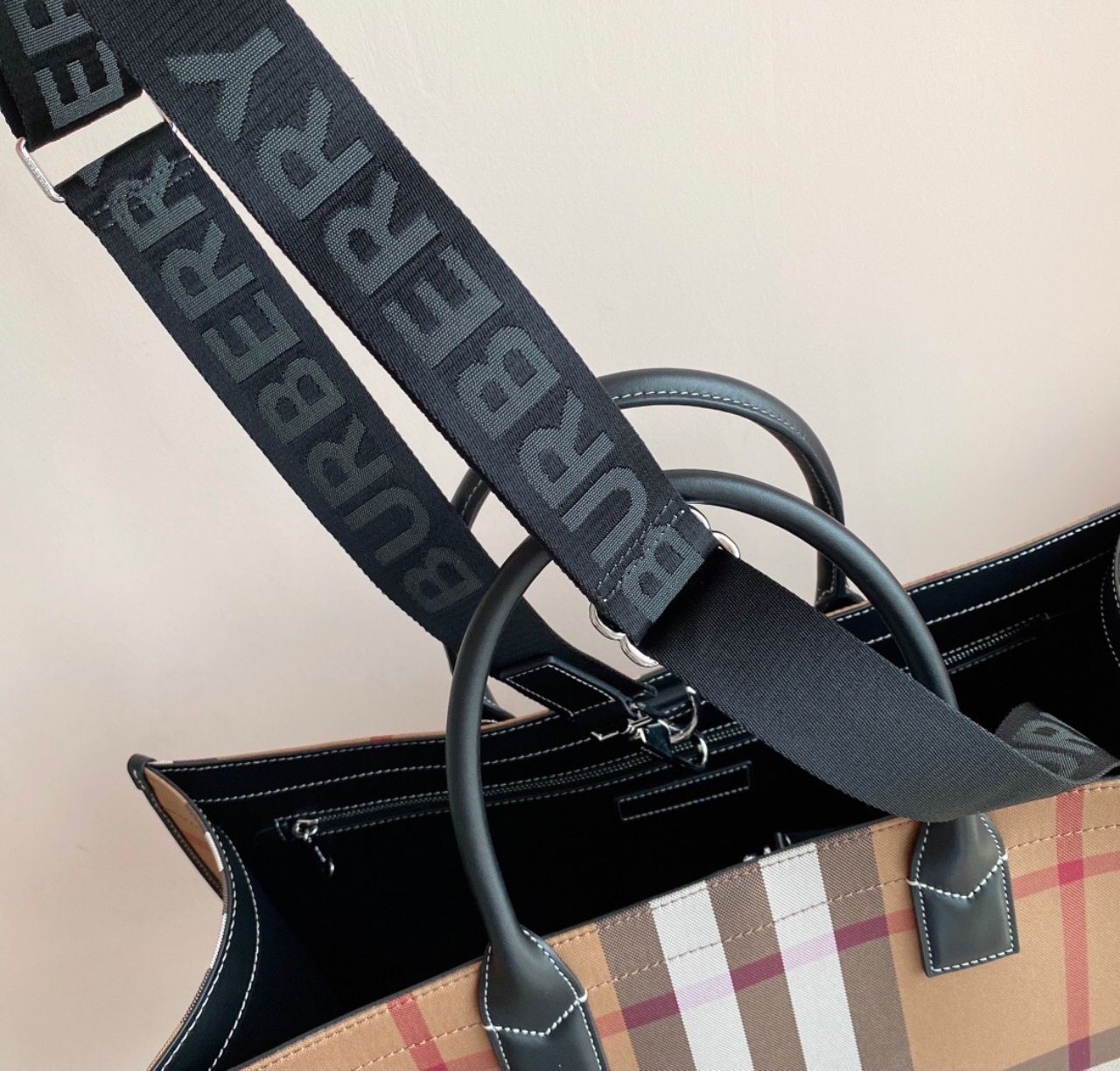 이 제품은 전면에 버버리의 아카이브 베이지 체크가 적용된 면 캔버스 소재로 제작되었으며, 가벼운 무게감과 부드러운 촉감이 특징입니다. 상단 핸들 디테일과 내부 수납 공간이 실용성을 더하며, 자연스러운 주름과 라인이 내추럴한 멋을 더해줍니다.