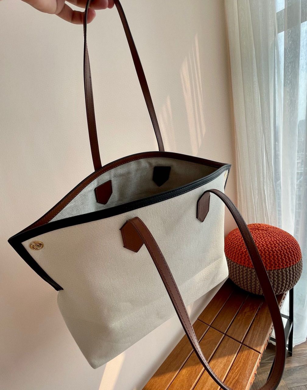 이 토트백은 천연 코튼 캔버스를 베이스로 송아지 가죽 트리밍을 더해 견고하면서도 고급스러운 질감을 선사합니다. 내부는 넉넉한 메인 공간과 정돈된 포켓 구성으로 효율적인 수납이 가능하며, 자석 여밈 방식의 탑 클로저로 간편하게 여닫을 수 있습니다.