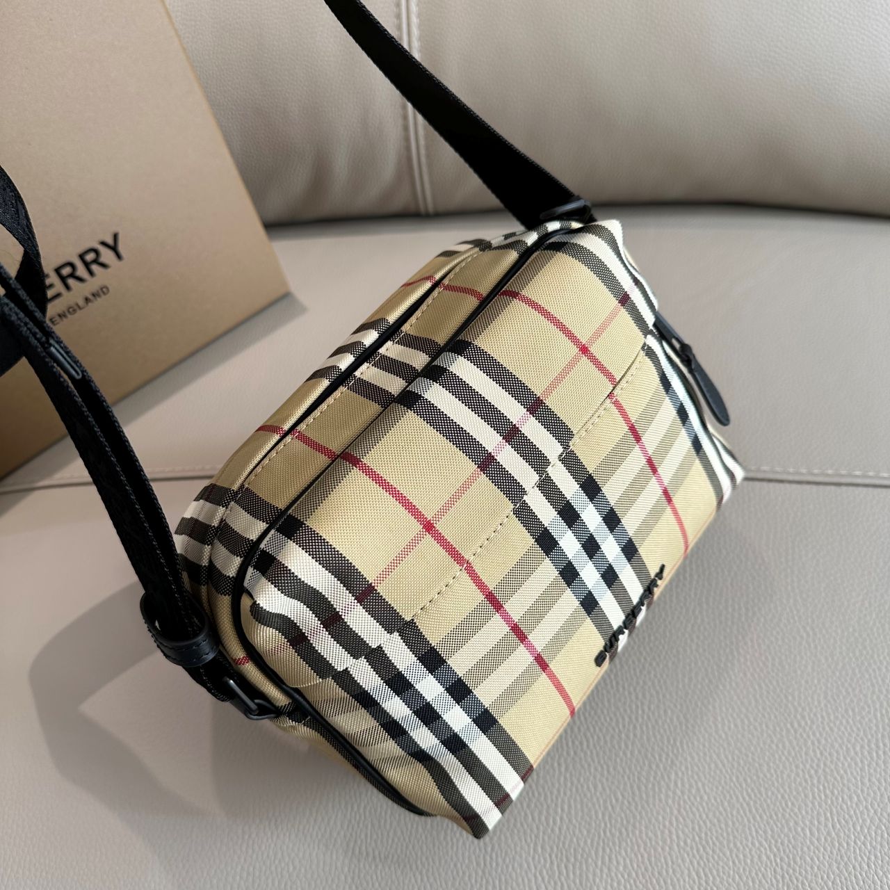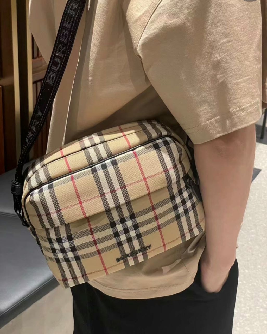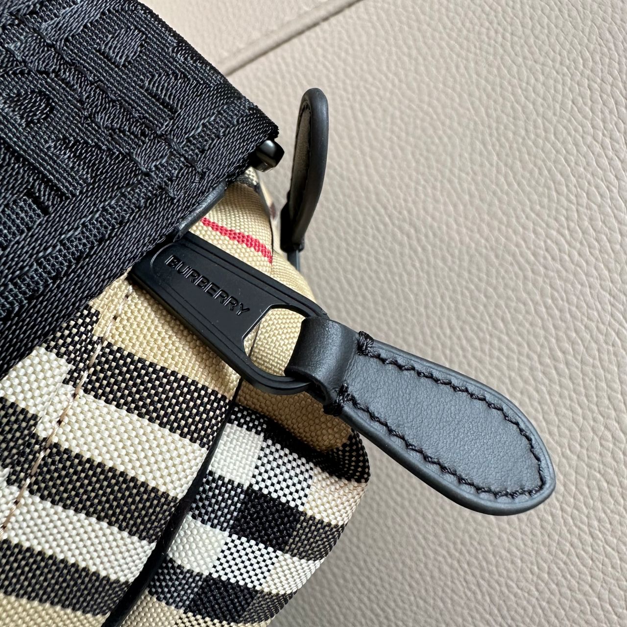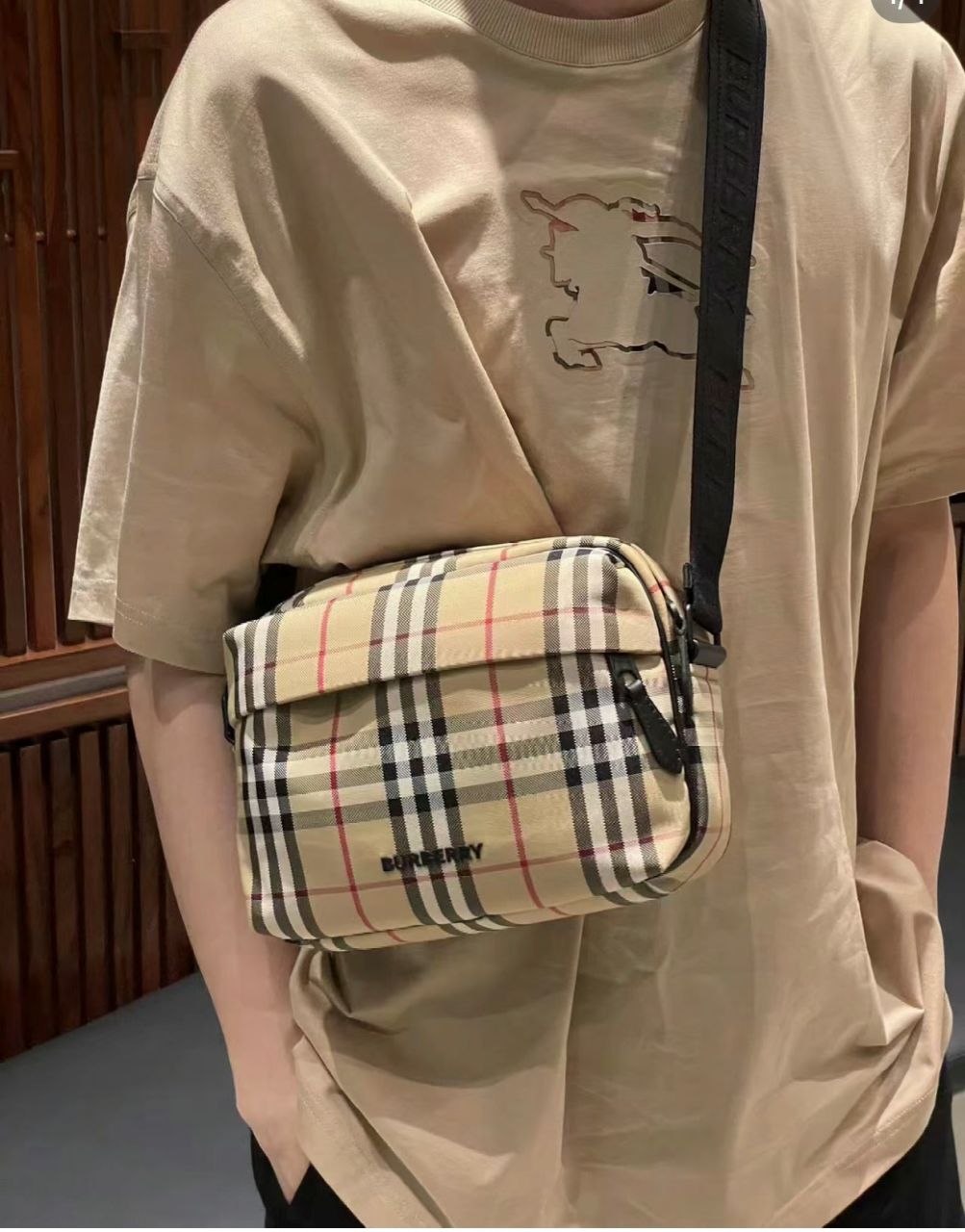 이 제품은 부드럽게 휘어진 바디 라인과 유려한 쉐입이 특징이며, 송아지 가죽 또는 나일론 혼방 소재로 제작되어 내구성과 스타일을 모두 갖추었습니다. 플랩 클로저에는 버버리 로고가 정교하게 새겨져 있으며, 자석 여밈 구조로 간편하게 오픈·클로징이 가능합니다.