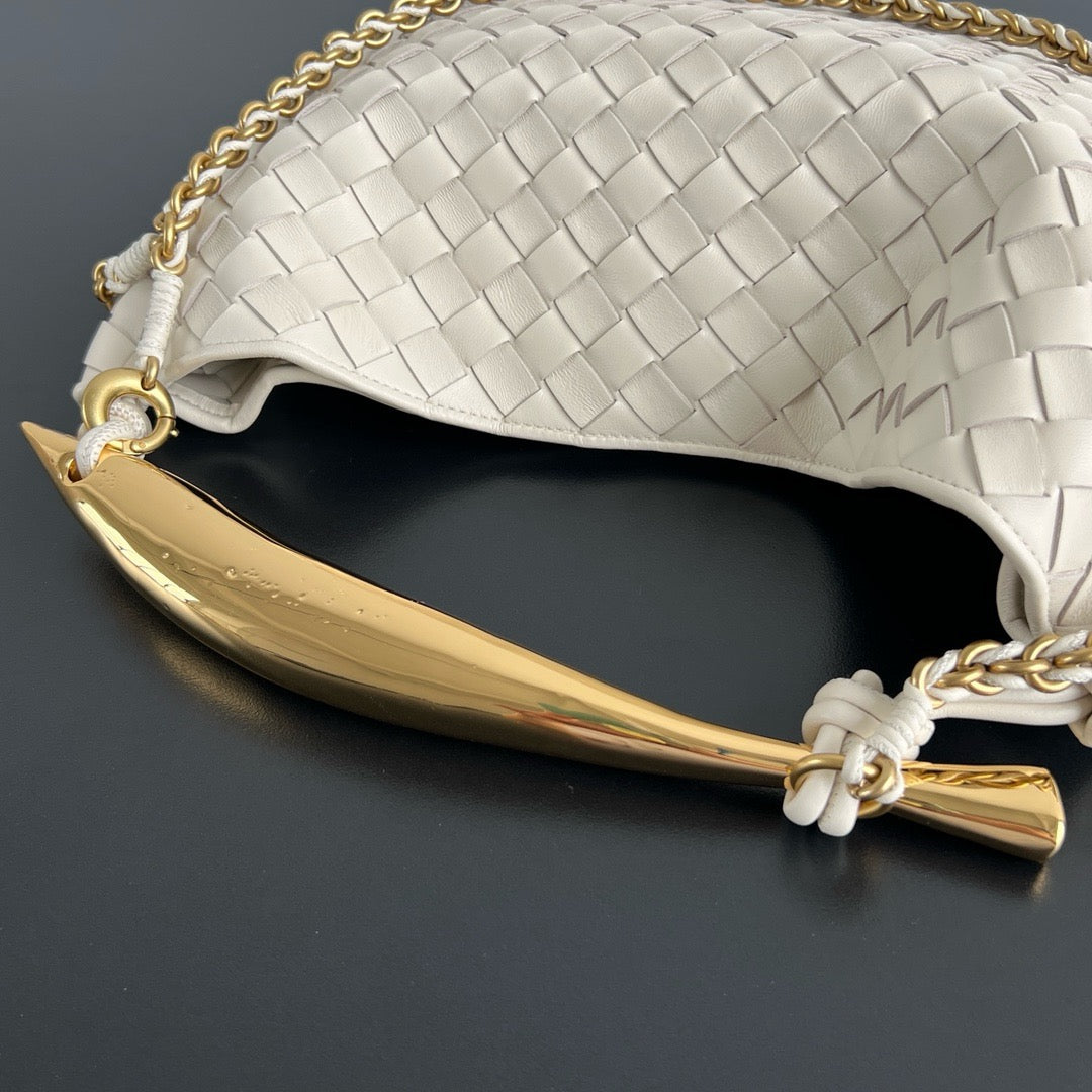 보테가 베네타 사르딘 체인백(Bottega Veneta Sardine Chain Bag)은 곡선형 금속 핸들과 체인 스트랩, 그리고 부드러운 나파 가죽의 조화가 돋보이는 유니크한 숄더백입니다. 예술적인 디테일과 실용적인 구조를 갖추어 다양한 스타일에 고급스럽게 어우러집니다.