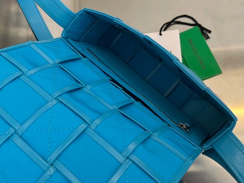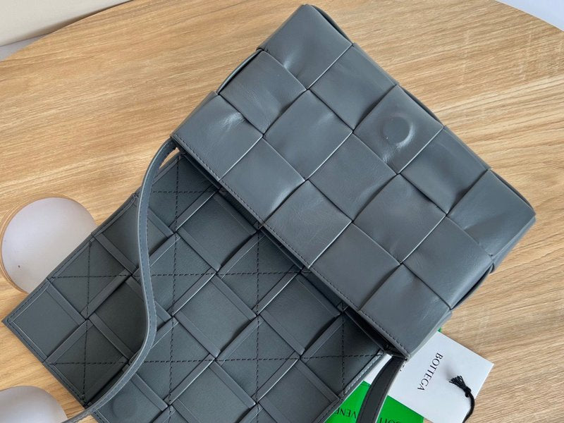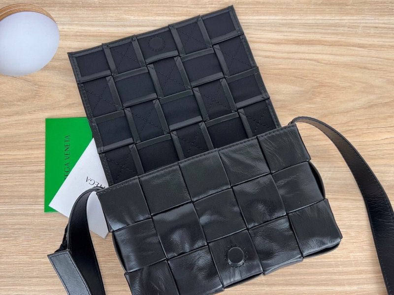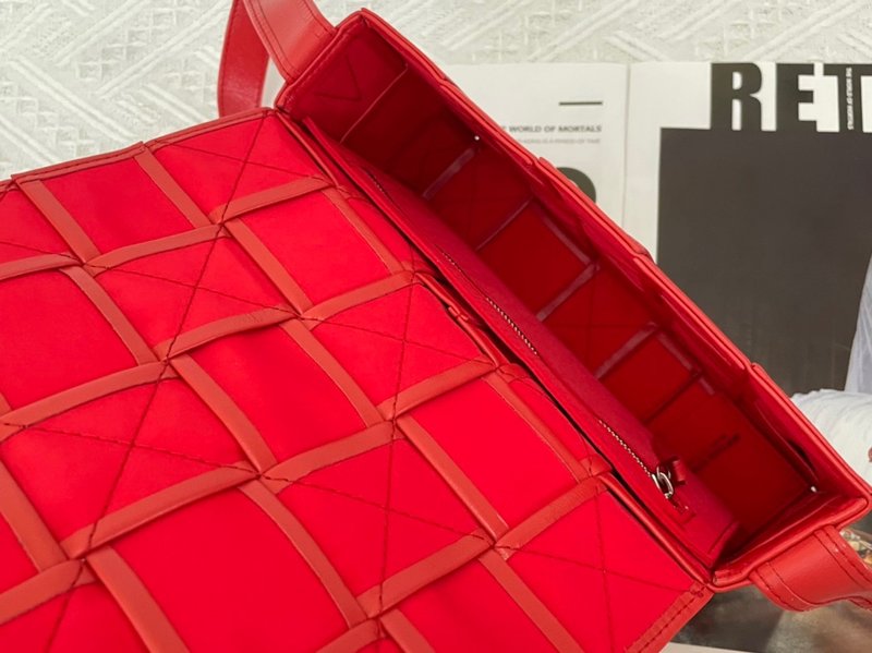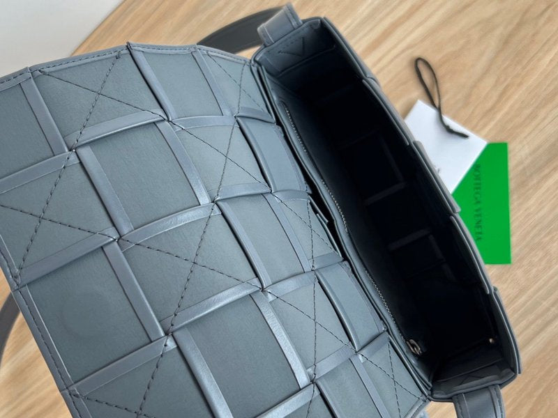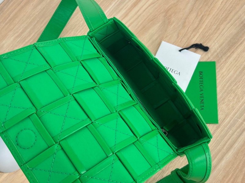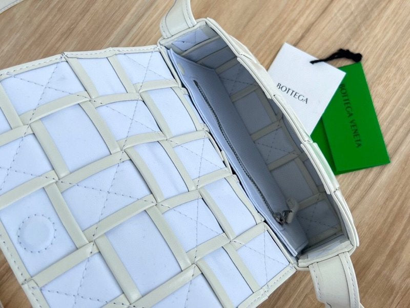 이 가방은 부드러운 송아지 가죽을 큼직한 인트레치아토 패턴으로 직조하고, 조절 가능한 스트랩에 메탈 삼각 버클을 적용해 브랜드의 감각적인 아이덴티티를 드러냅니다. 플랩 구조와 마그네틱 클로저, 내부의 지퍼 포켓이 포함되어 있어 간단한 소지품을 안정적으로 수납할 수 있습니다.