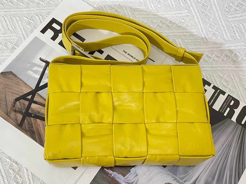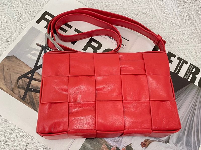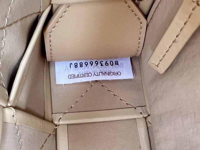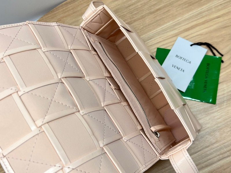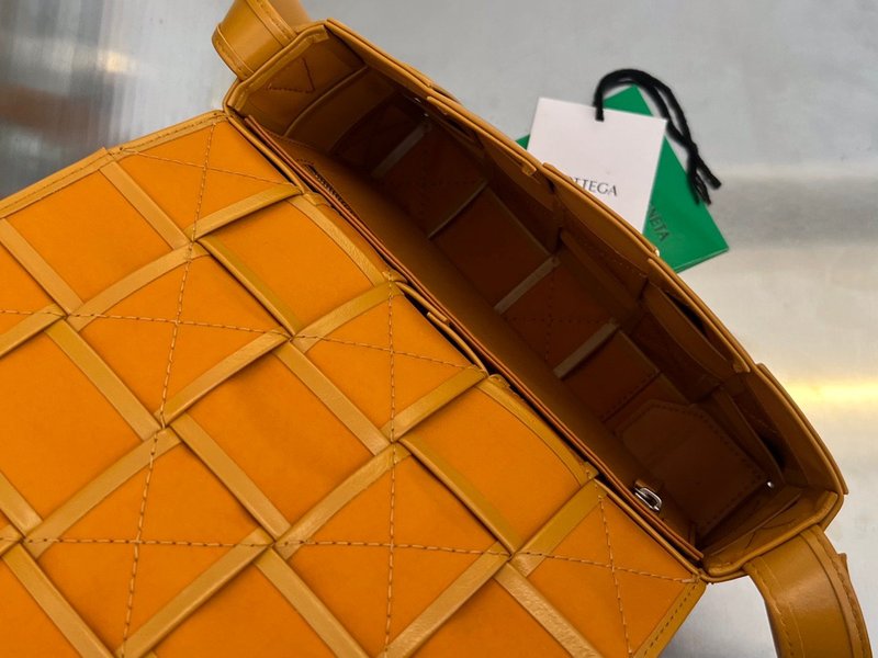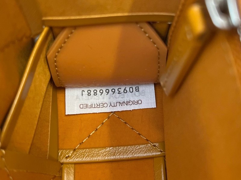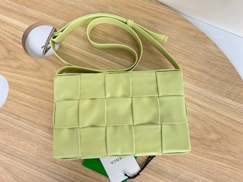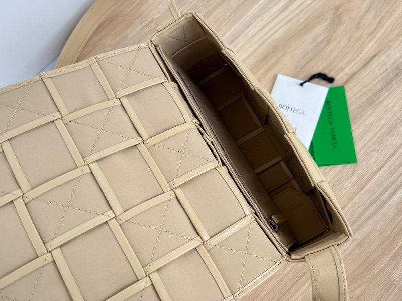 이 가방은 부드러운 송아지 가죽을 큼직한 인트레치아토 패턴으로 직조하고, 조절 가능한 스트랩에 메탈 삼각 버클을 적용해 브랜드의 감각적인 아이덴티티를 드러냅니다. 플랩 구조와 마그네틱 클로저, 내부의 지퍼 포켓이 포함되어 있어 간단한 소지품을 안정적으로 수납할 수 있습니다.