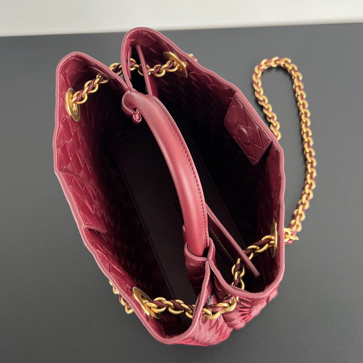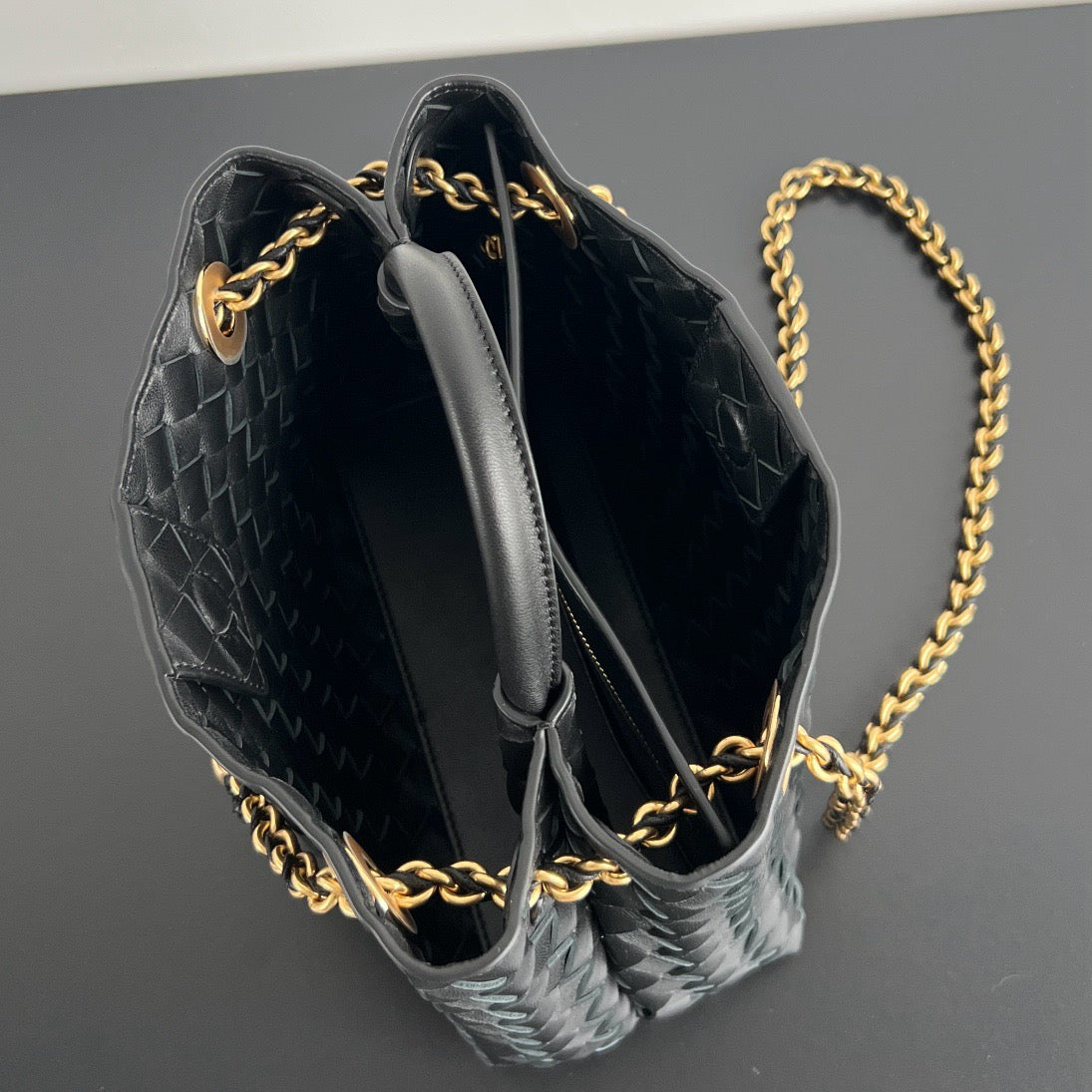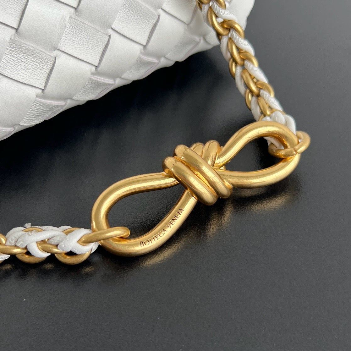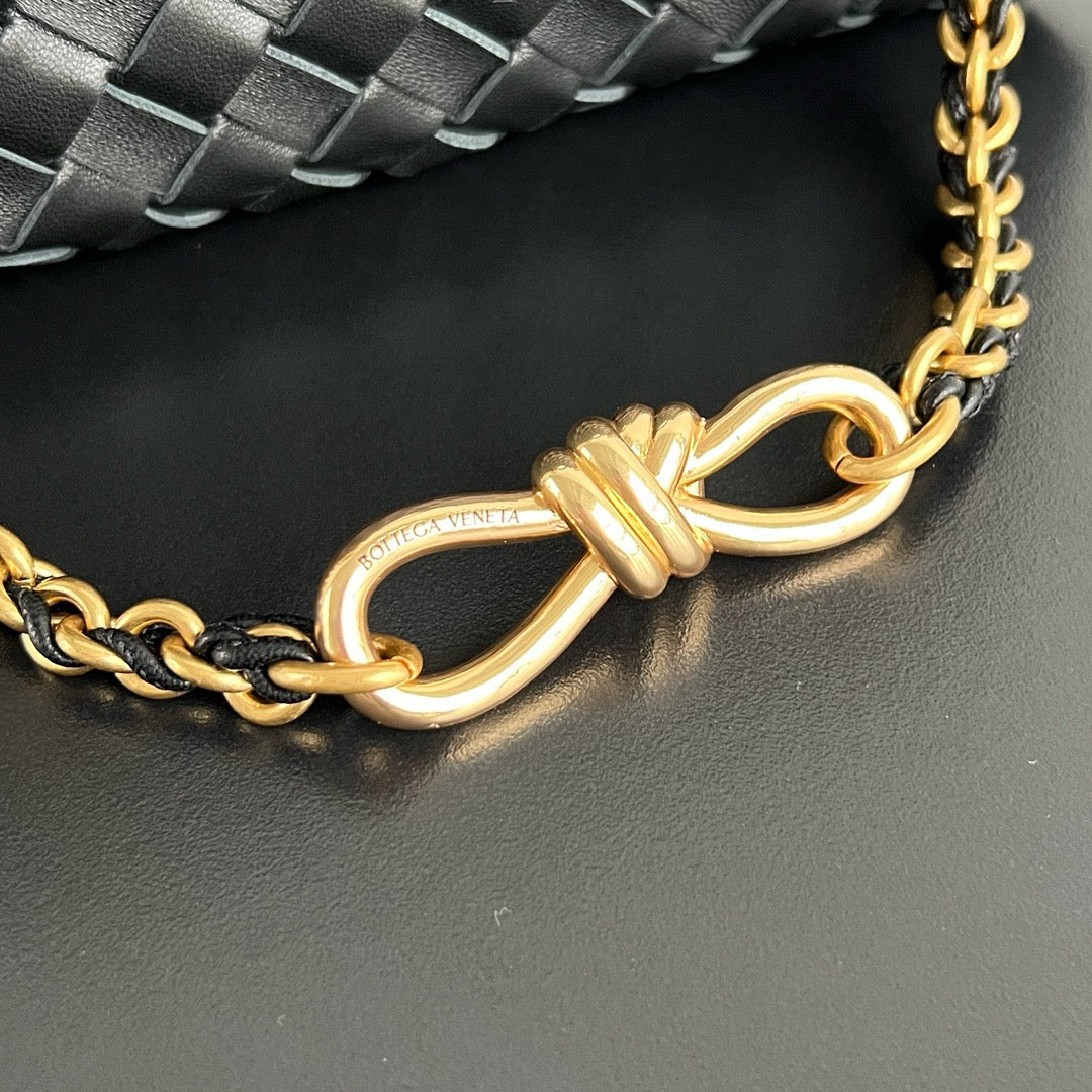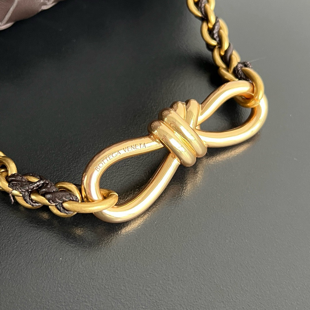 인트레치아토 가죽과 매듭 디테일, 골드 체인 스트랩이 조화를 이루어 고급스러운 스타일링이 가능합니다.