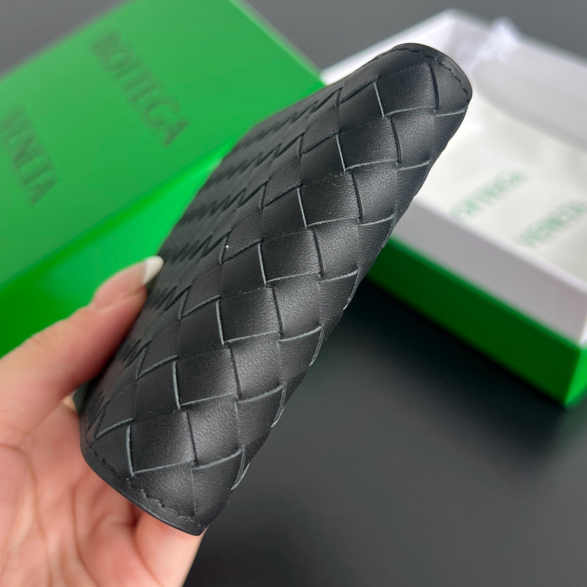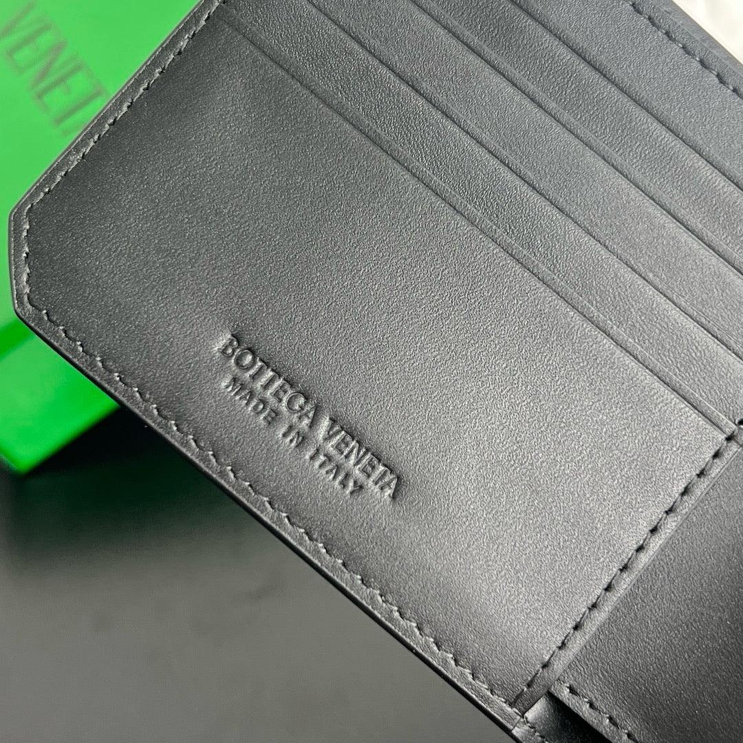 클래식한 반지갑 디자인에 동전 포켓까지 포함되어 실용성이 높으며, 인트레치아토 위빙으로 브랜드의 정체성을 잘 드러냅니다.