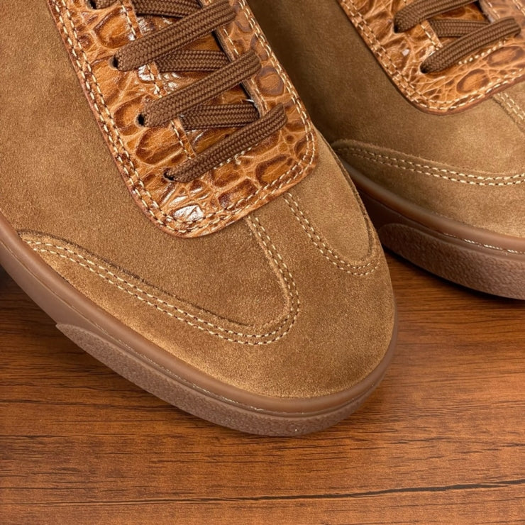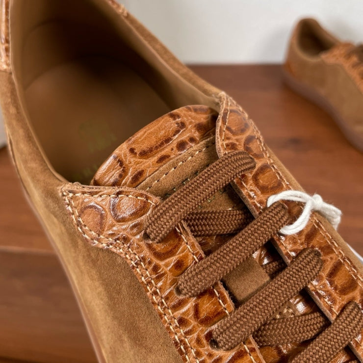 이 스니커즈는 부드러운 스웨이드 소재를 기반으로 악어 텍스처의 포인트 디테일을 가미해 독창적인 디자인을 구현했습니다. 차분한 브라운 컬러는 다양한 룩에 쉽게 매치되며, 디테일이 주는 고급감으로 일상에서도 품격 있는 스타일을 연출할 수 있습니다.