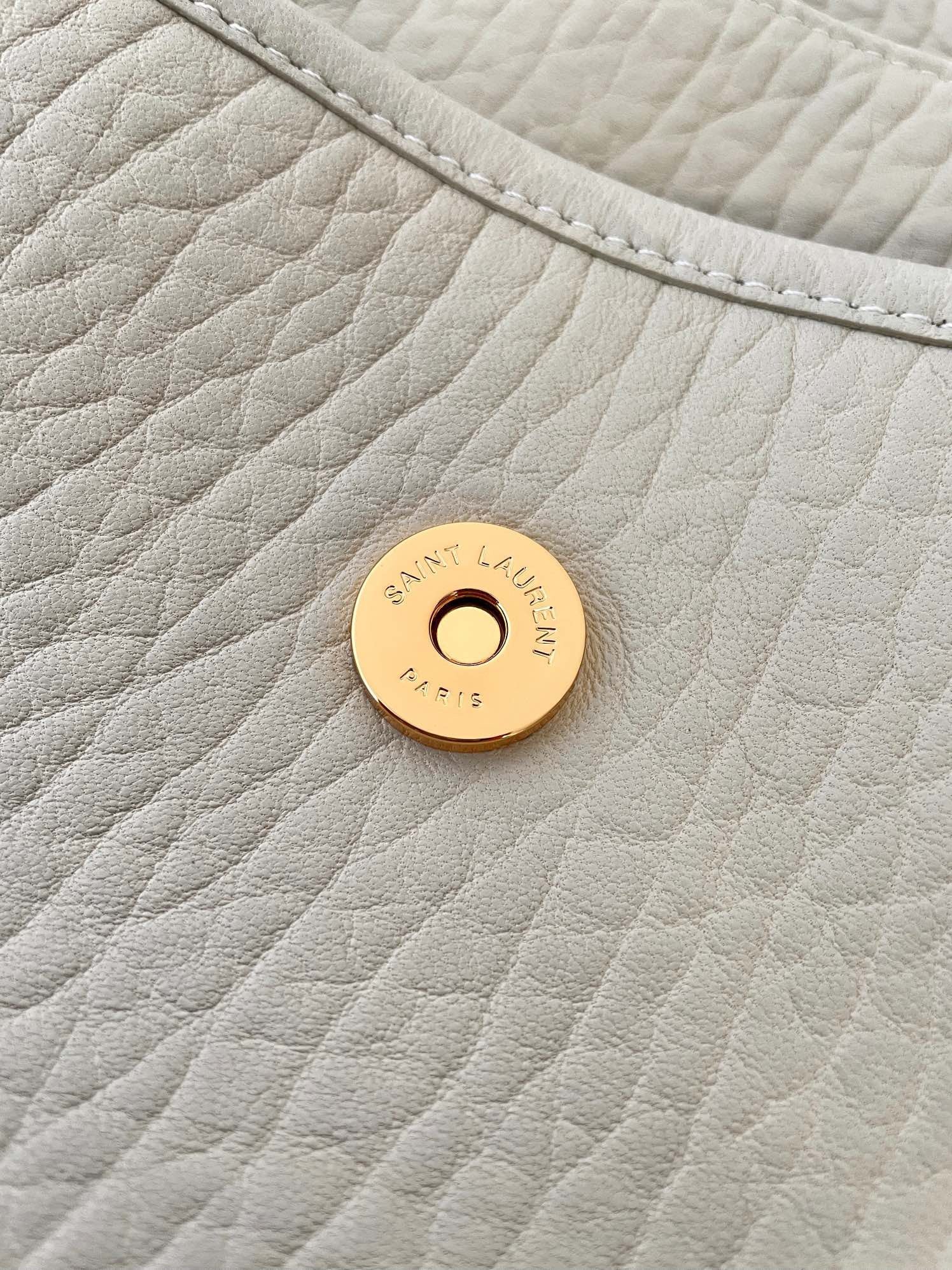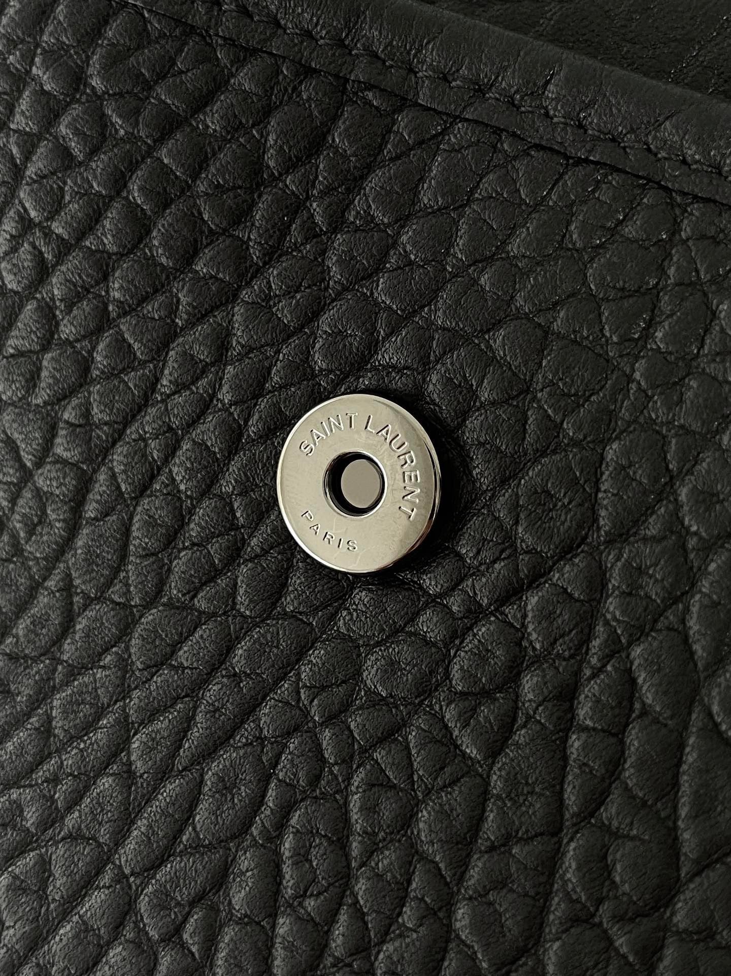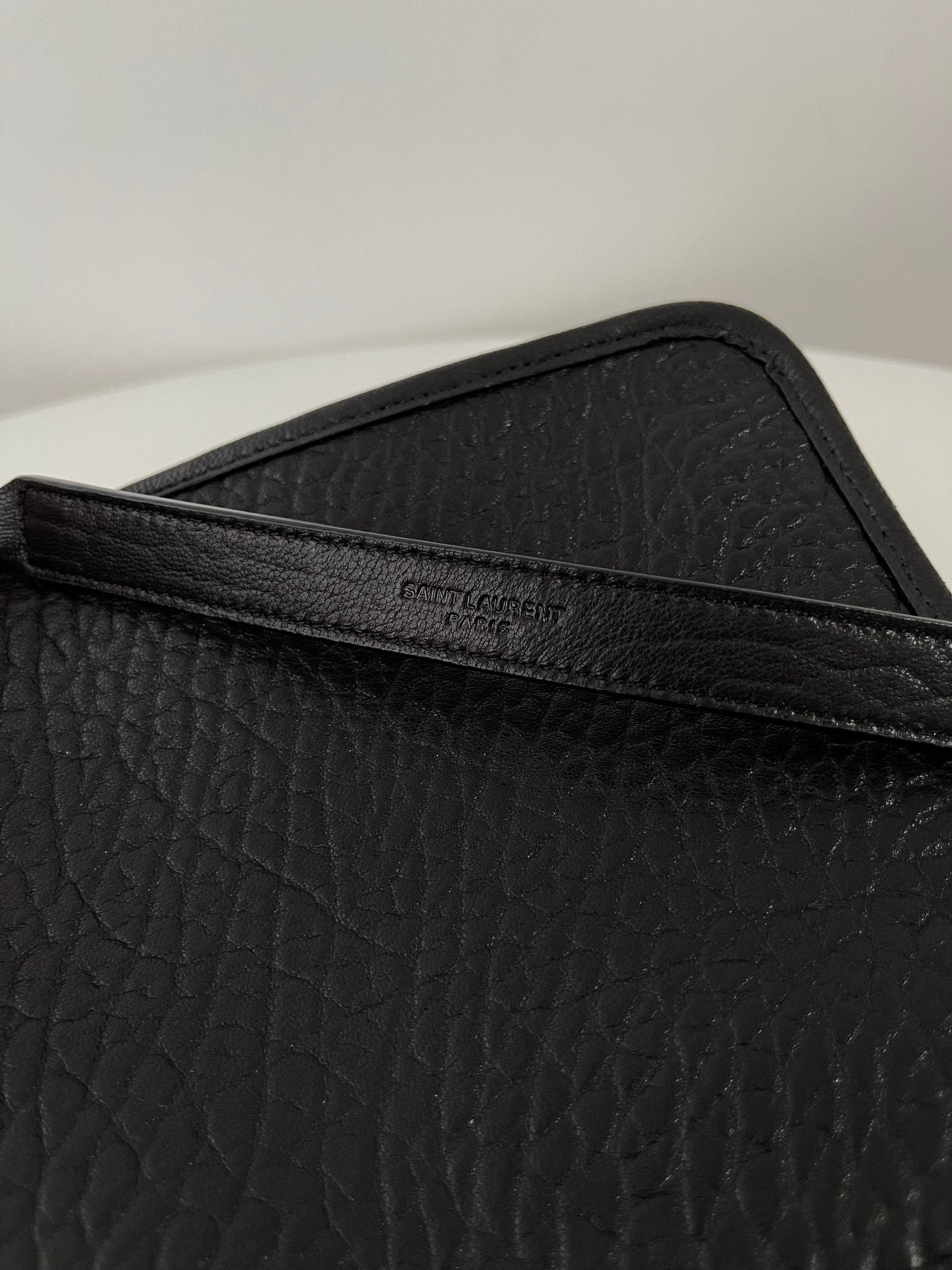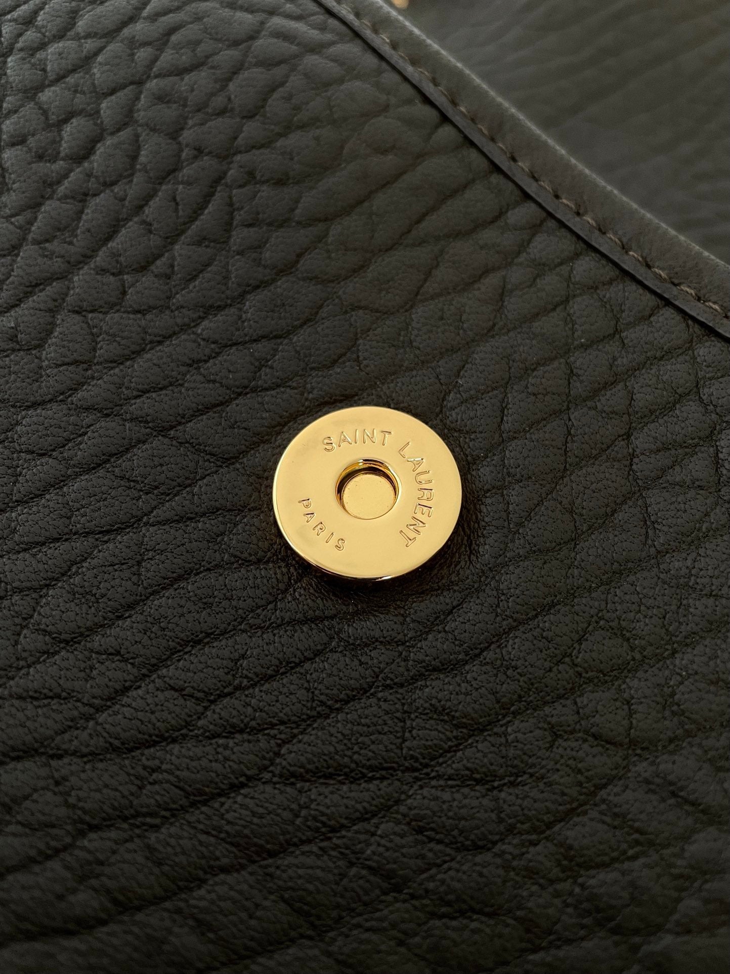 매끄럽게 그레인 처리된 램스킨은 부드러우면서도 견고한 질감을 제공하며, 플랩 전면에는 톤온톤 YSL 로고 메탈 장식이 절제된 포인트 역할을 합니다. 정제된 스티치 디테일이 전반적인 미니멀한 디자인과 조화를 이룹니다.