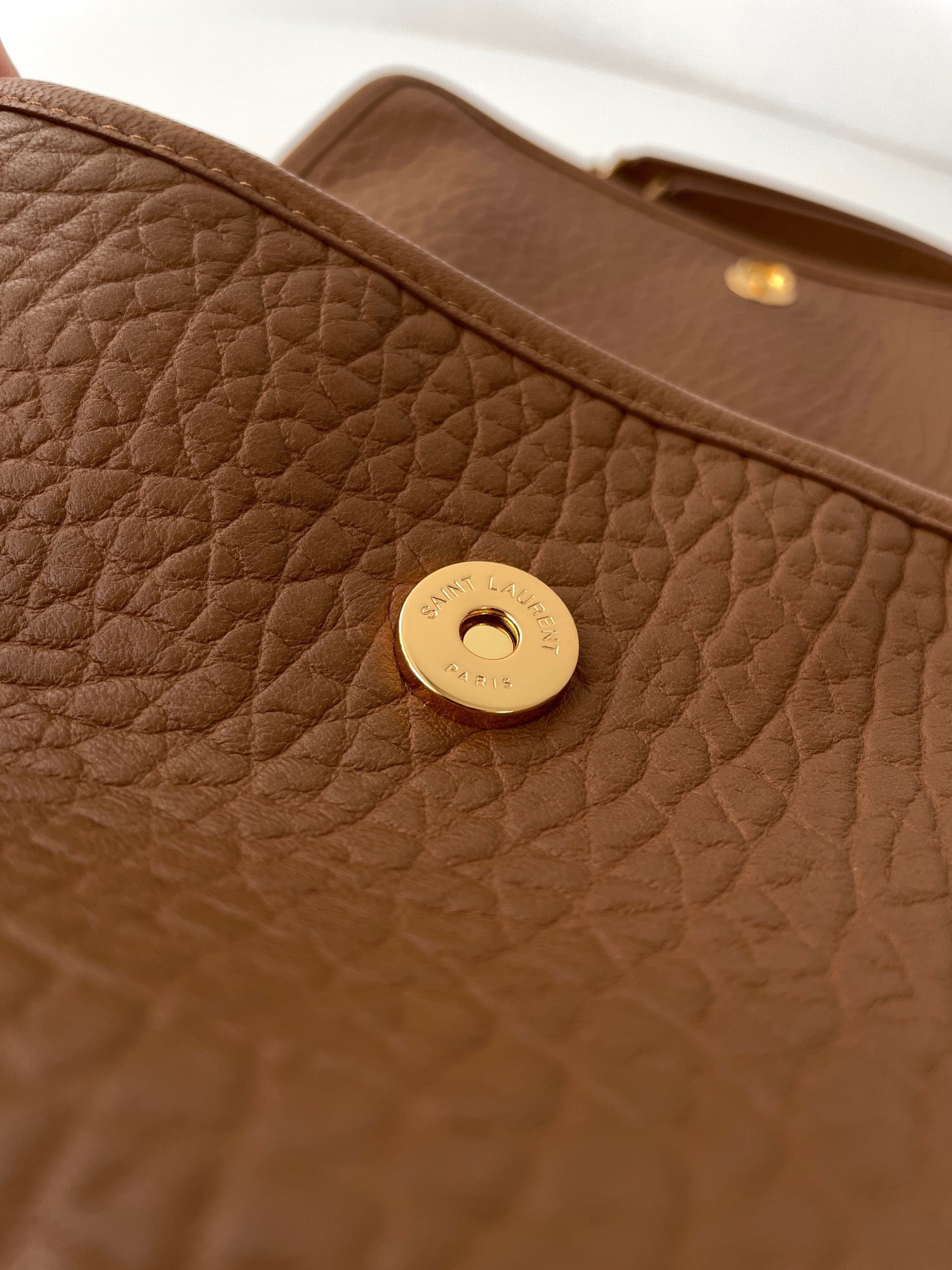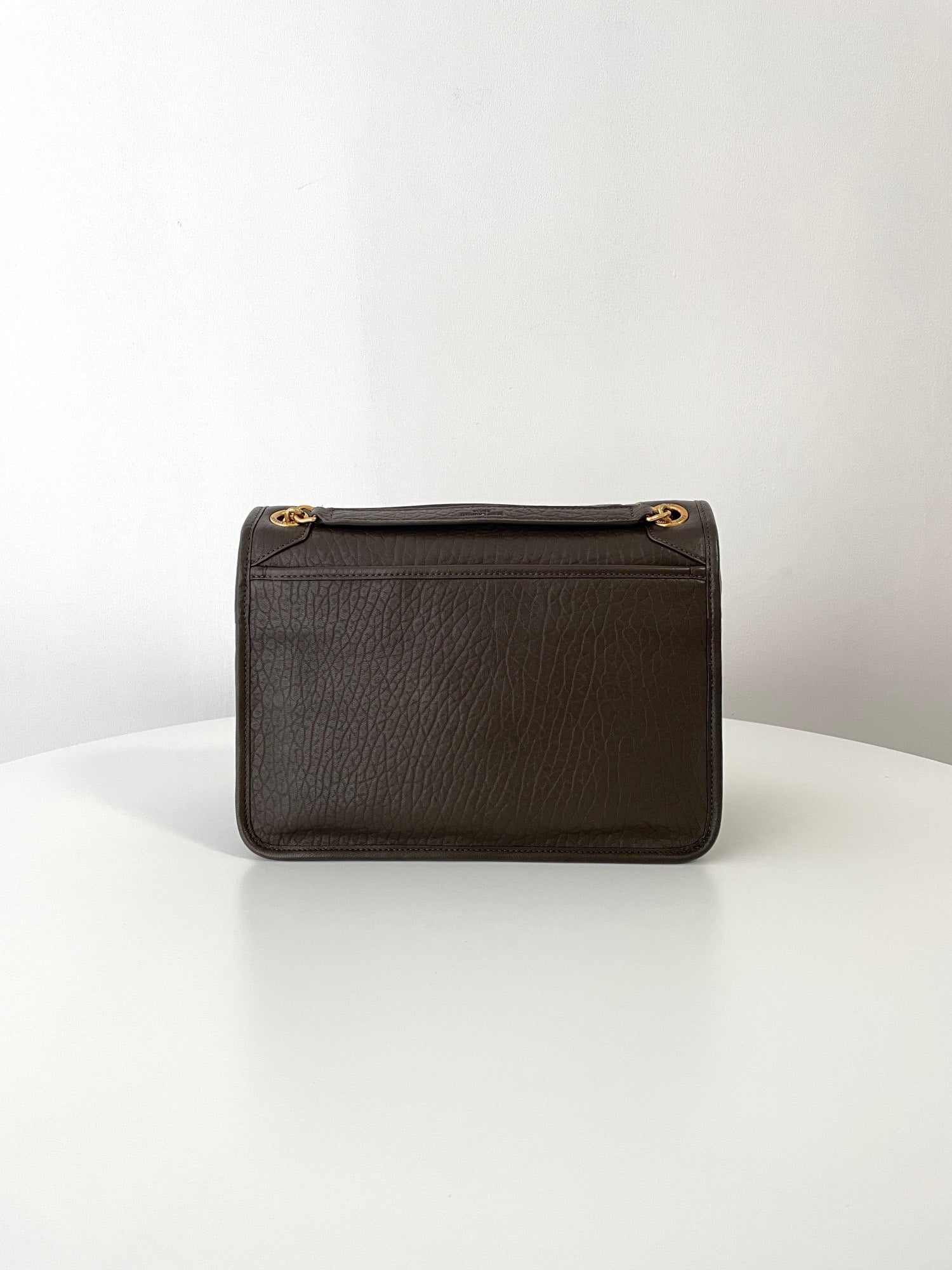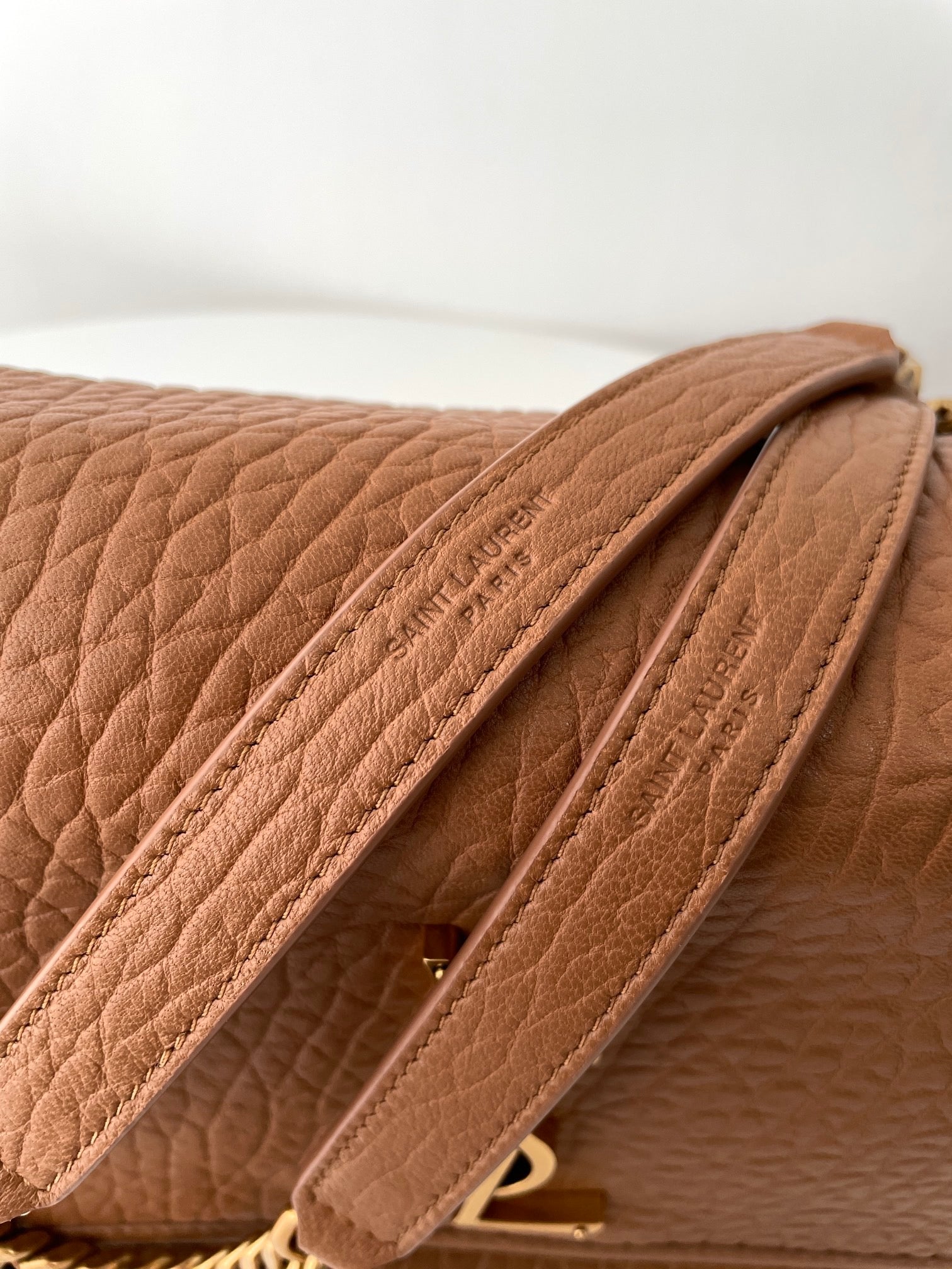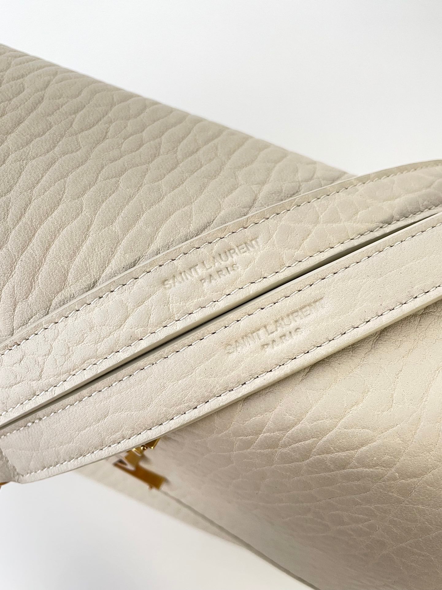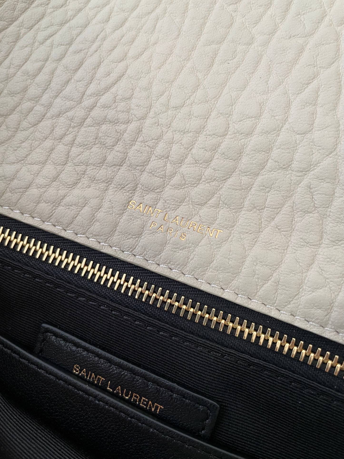 매끄럽게 그레인 처리된 램스킨은 부드러우면서도 견고한 질감을 제공하며, 플랩 전면에는 톤온톤 YSL 로고 메탈 장식이 절제된 포인트 역할을 합니다. 정제된 스티치 디테일이 전반적인 미니멀한 디자인과 조화를 이룹니다.