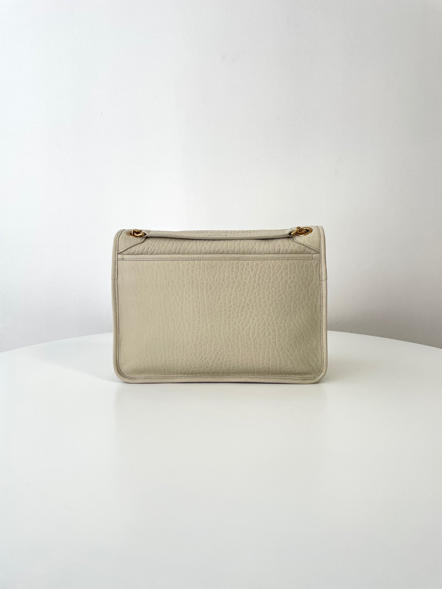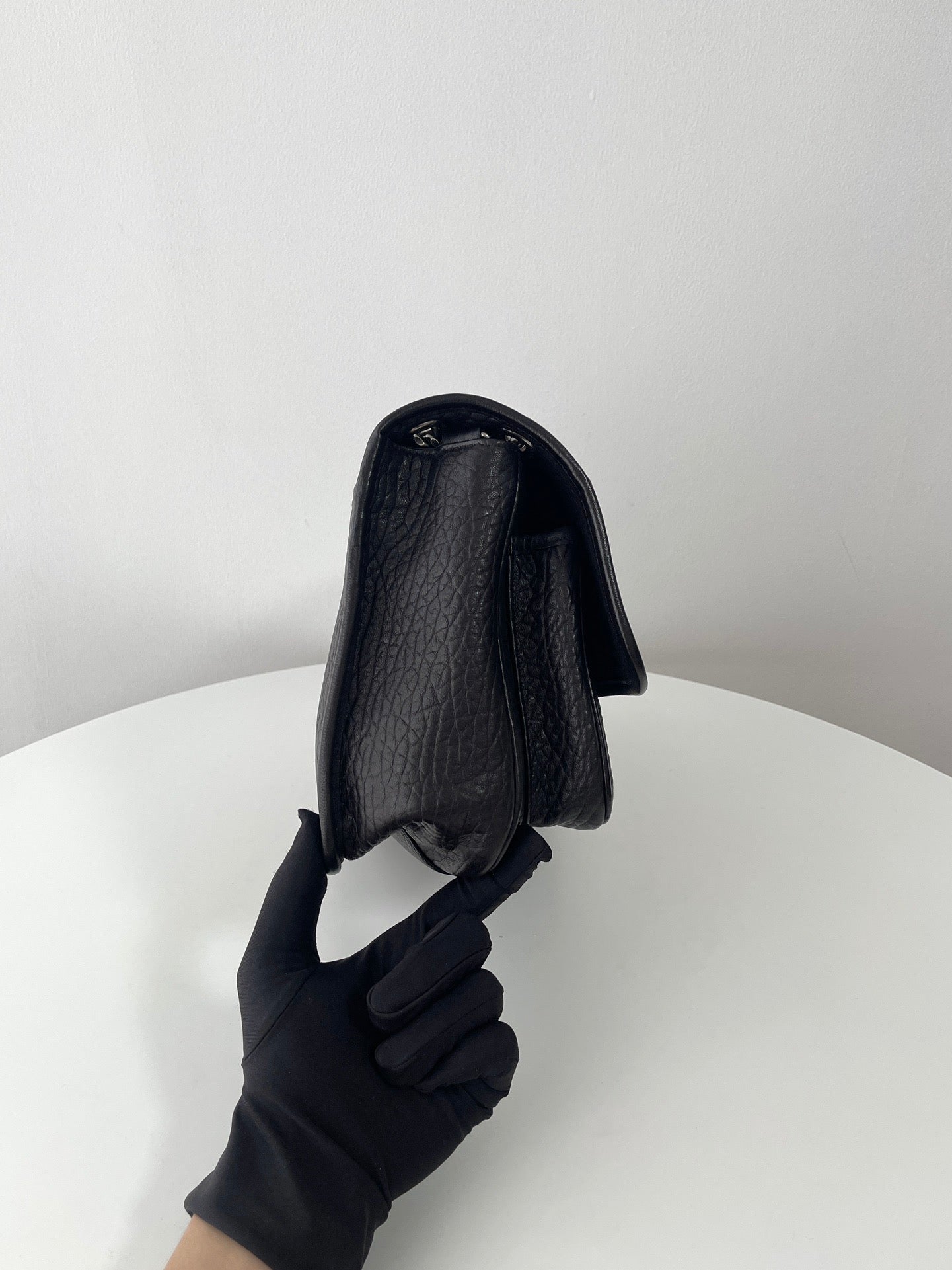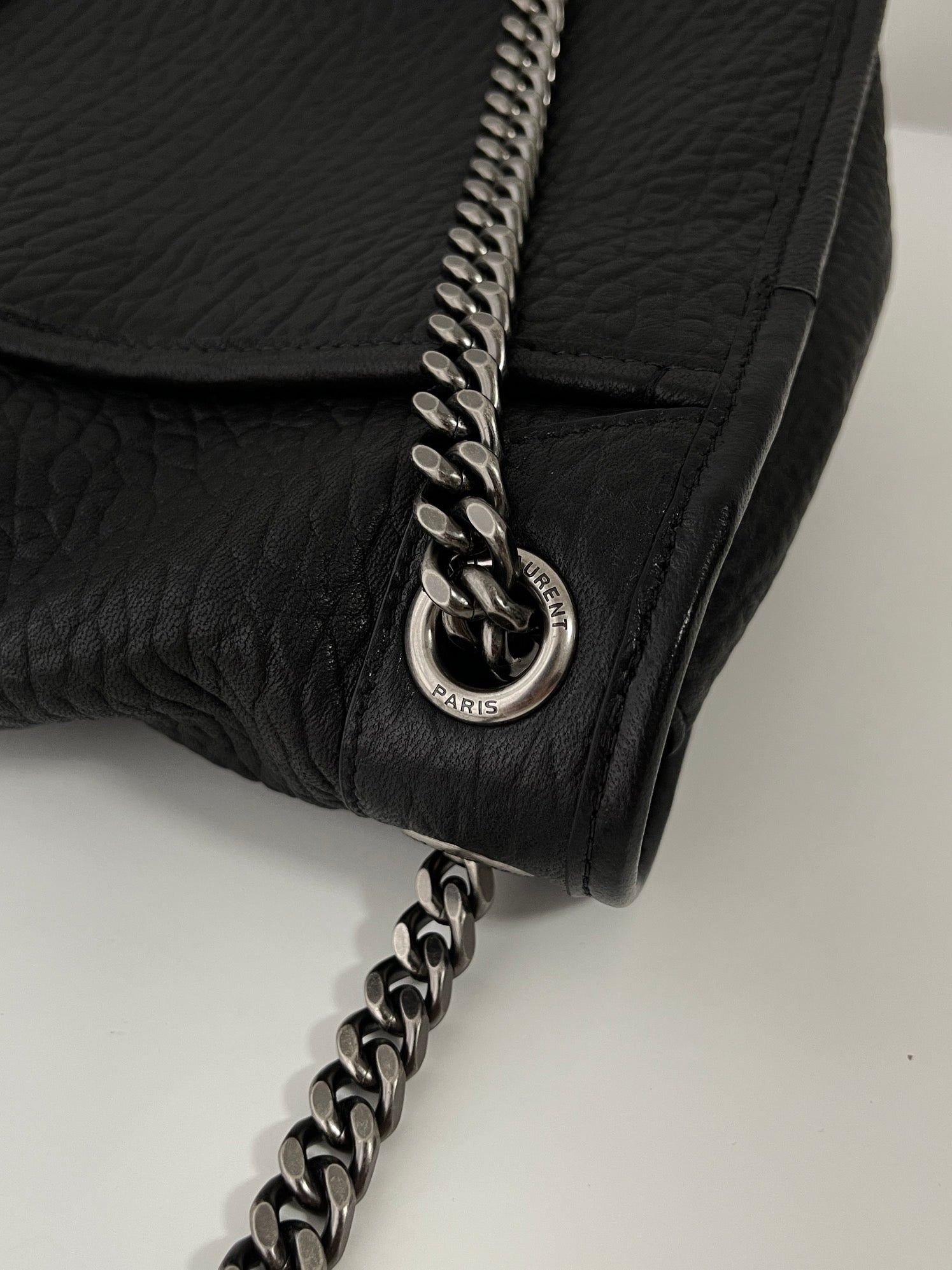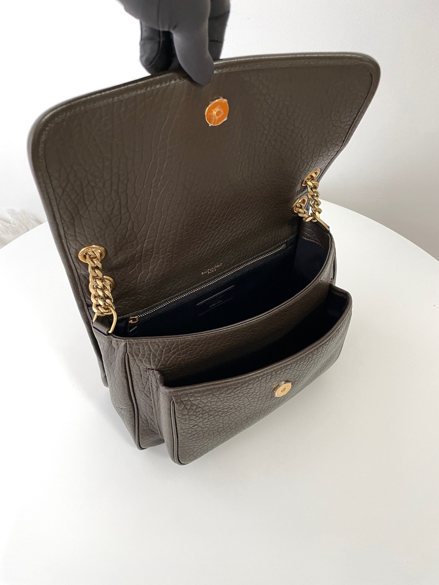 매끄럽게 그레인 처리된 램스킨은 부드러우면서도 견고한 질감을 제공하며, 플랩 전면에는 톤온톤 YSL 로고 메탈 장식이 절제된 포인트 역할을 합니다. 정제된 스티치 디테일이 전반적인 미니멀한 디자인과 조화를 이룹니다.