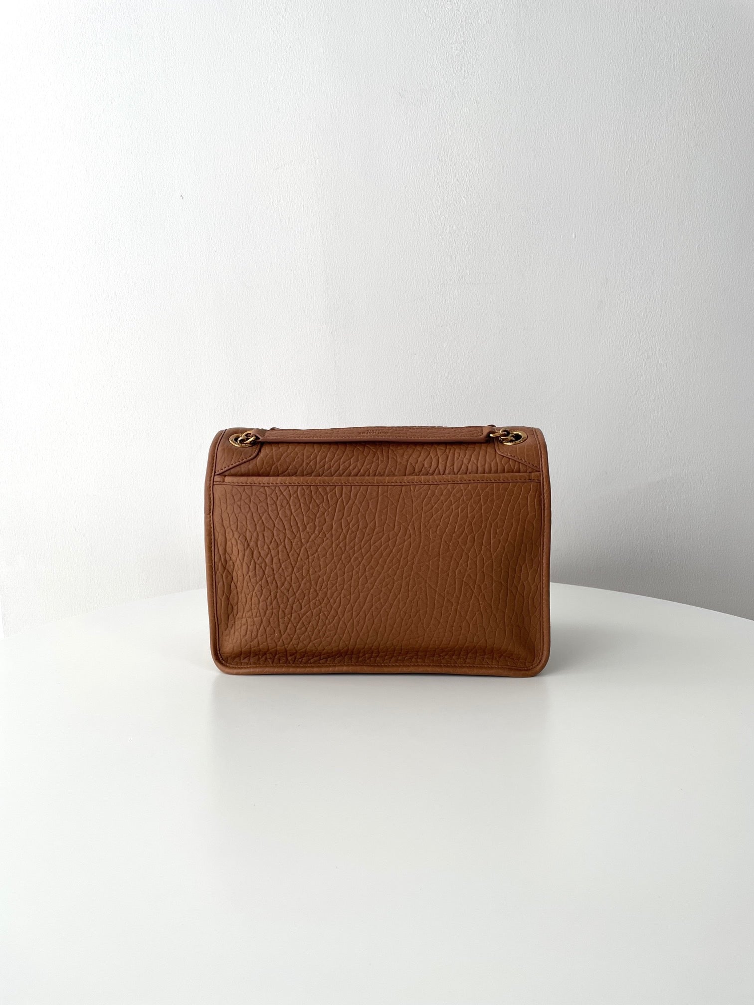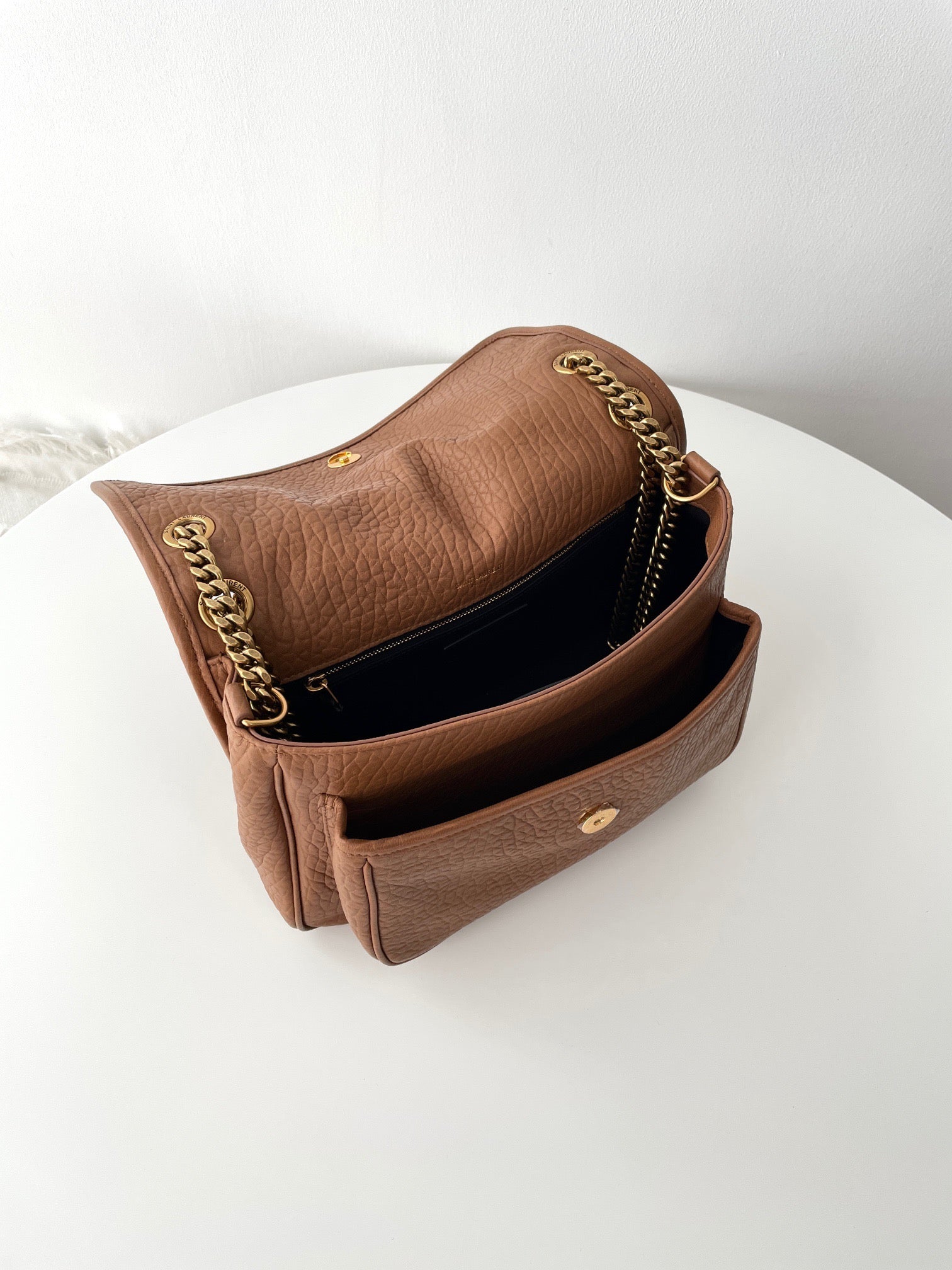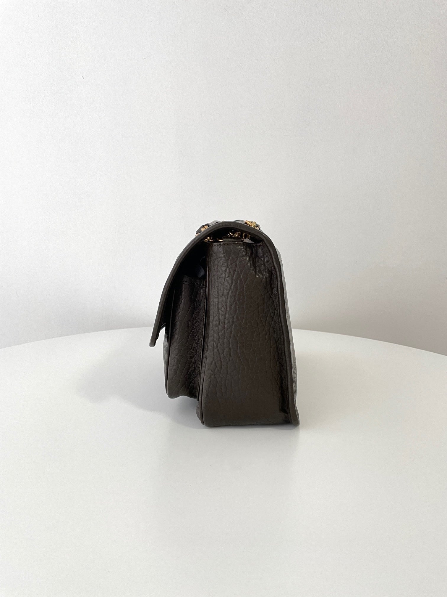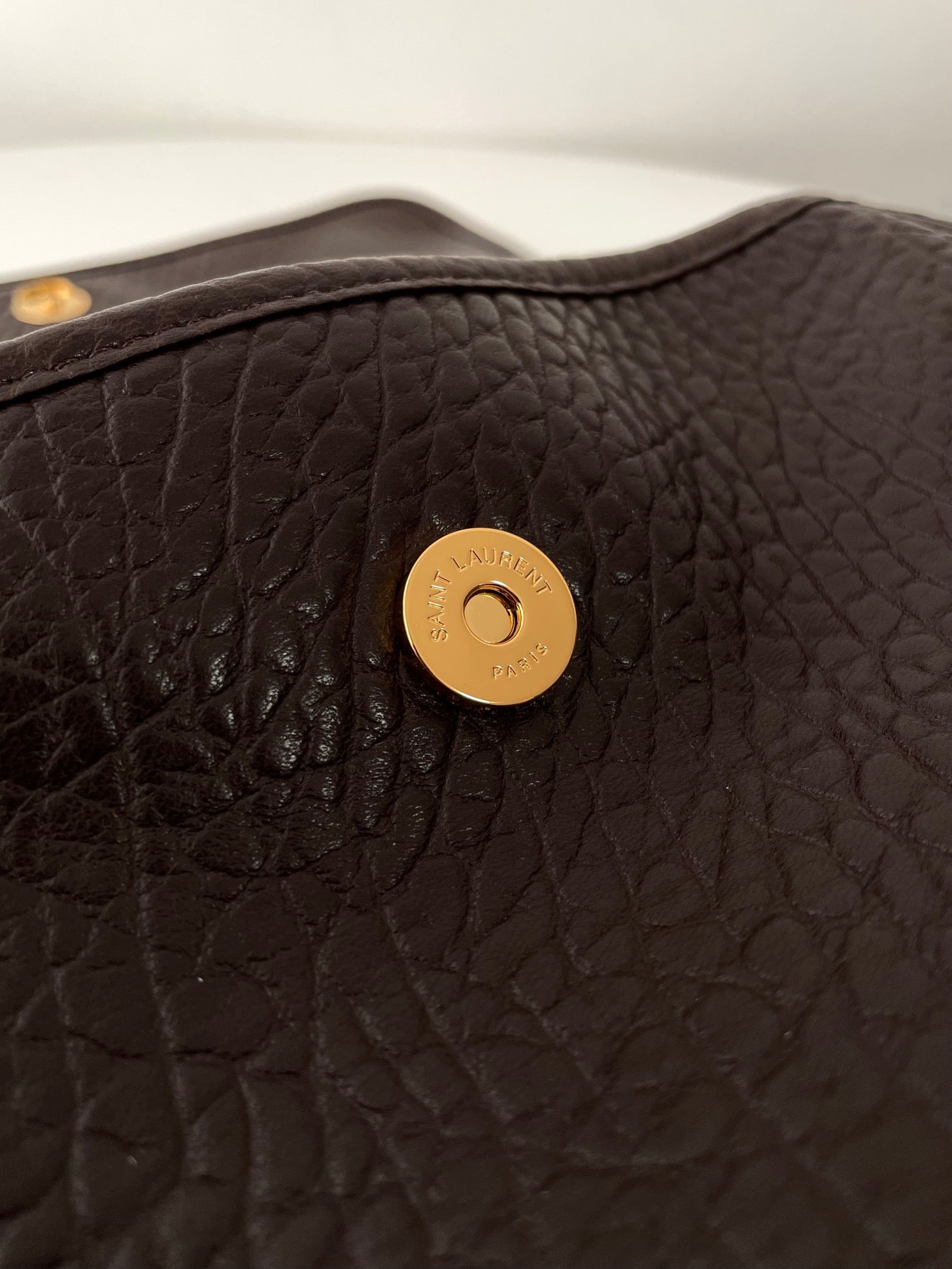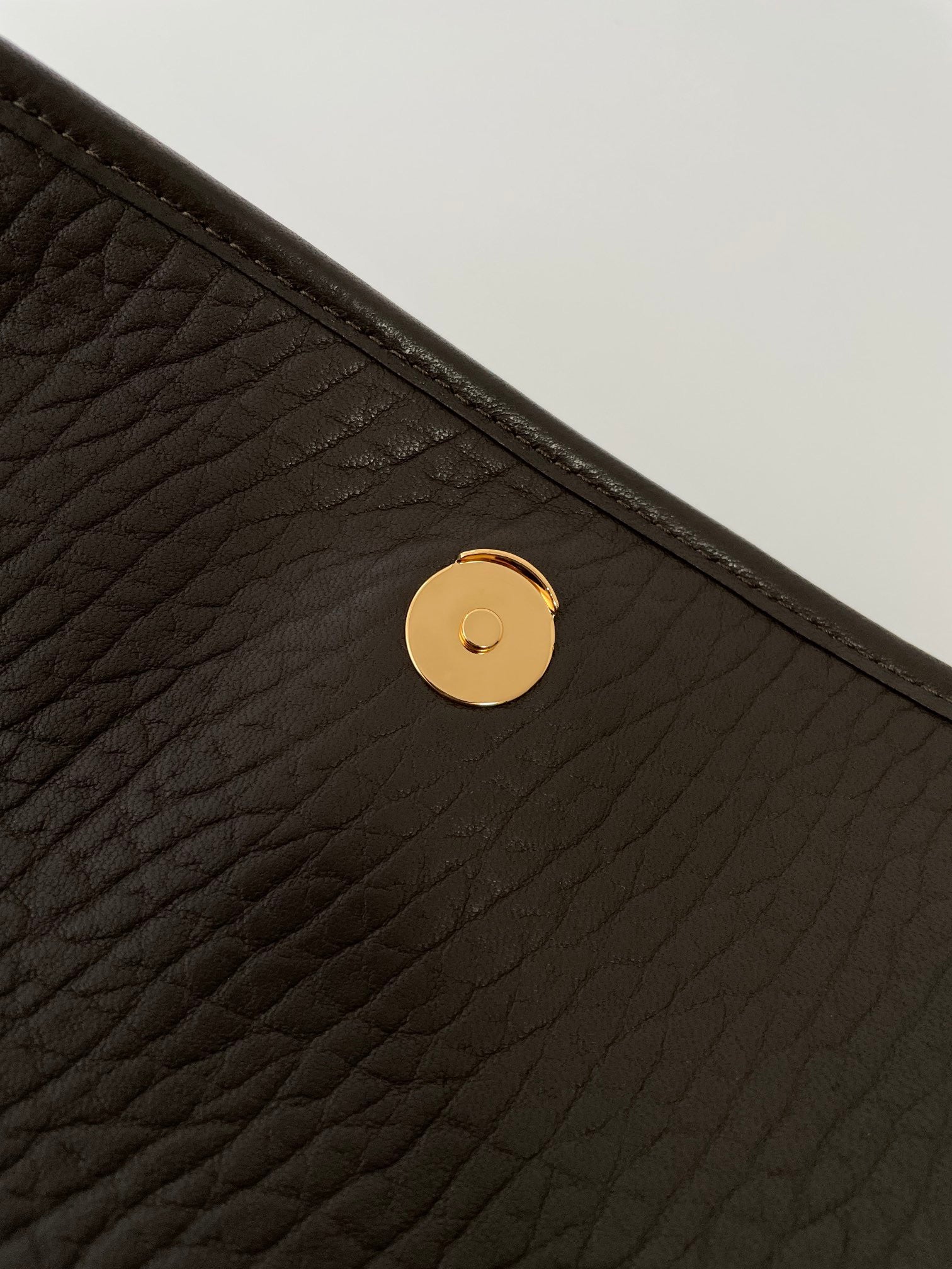 매끄럽게 그레인 처리된 램스킨은 부드러우면서도 견고한 질감을 제공하며, 플랩 전면에는 톤온톤 YSL 로고 메탈 장식이 절제된 포인트 역할을 합니다. 정제된 스티치 디테일이 전반적인 미니멀한 디자인과 조화를 이룹니다.