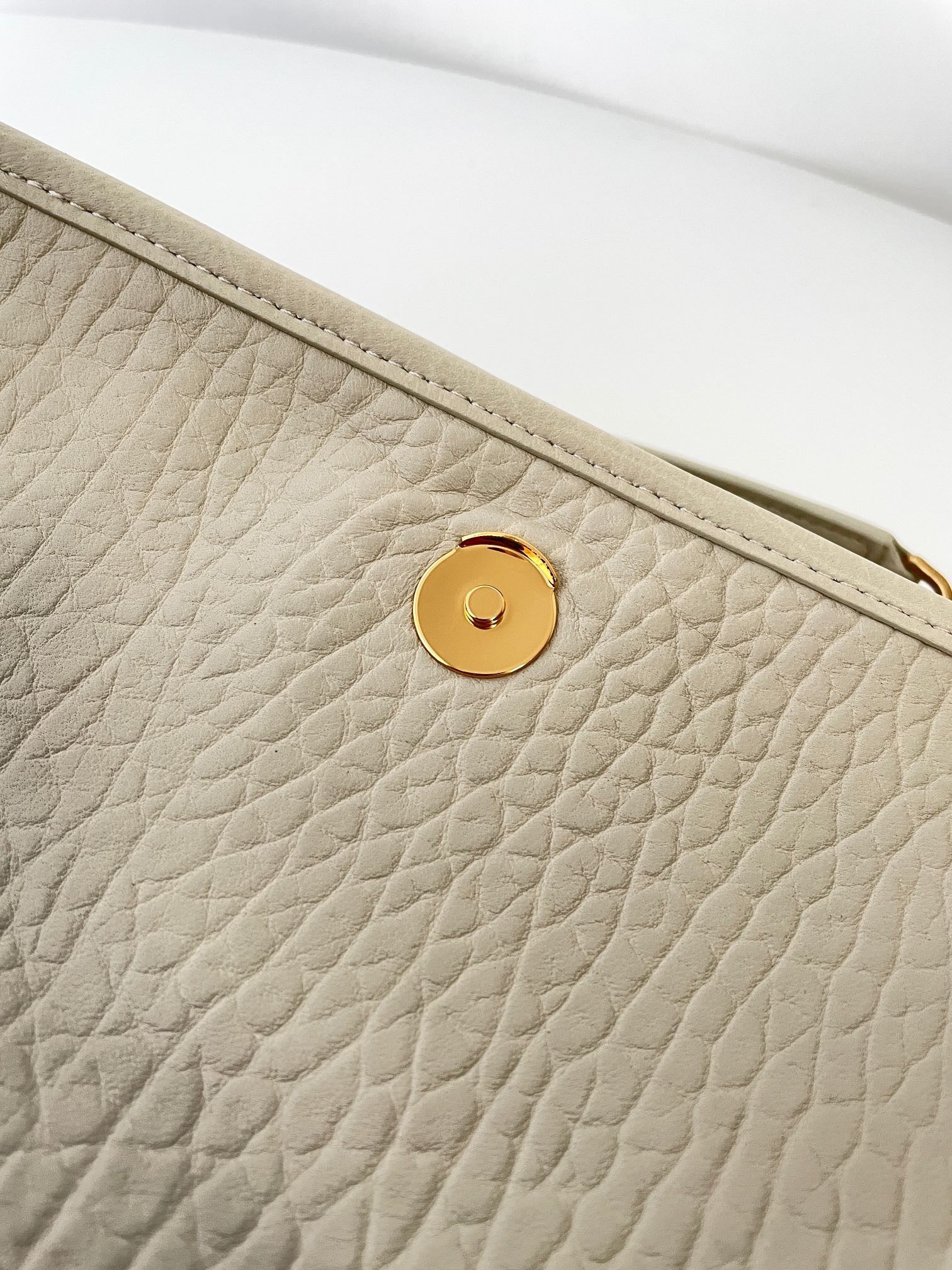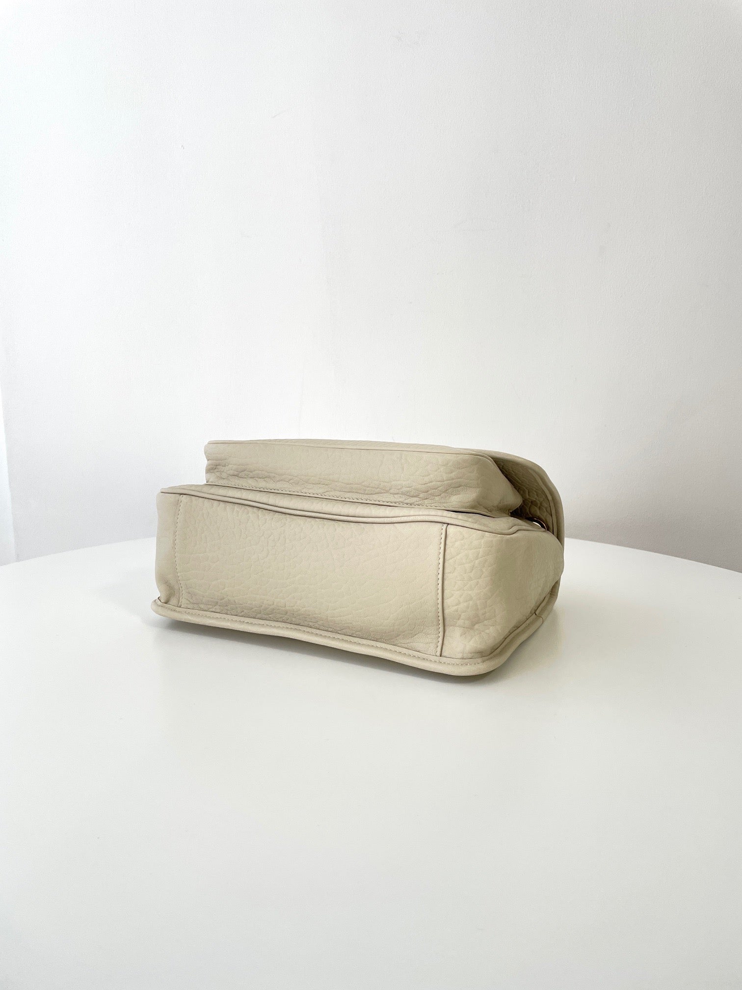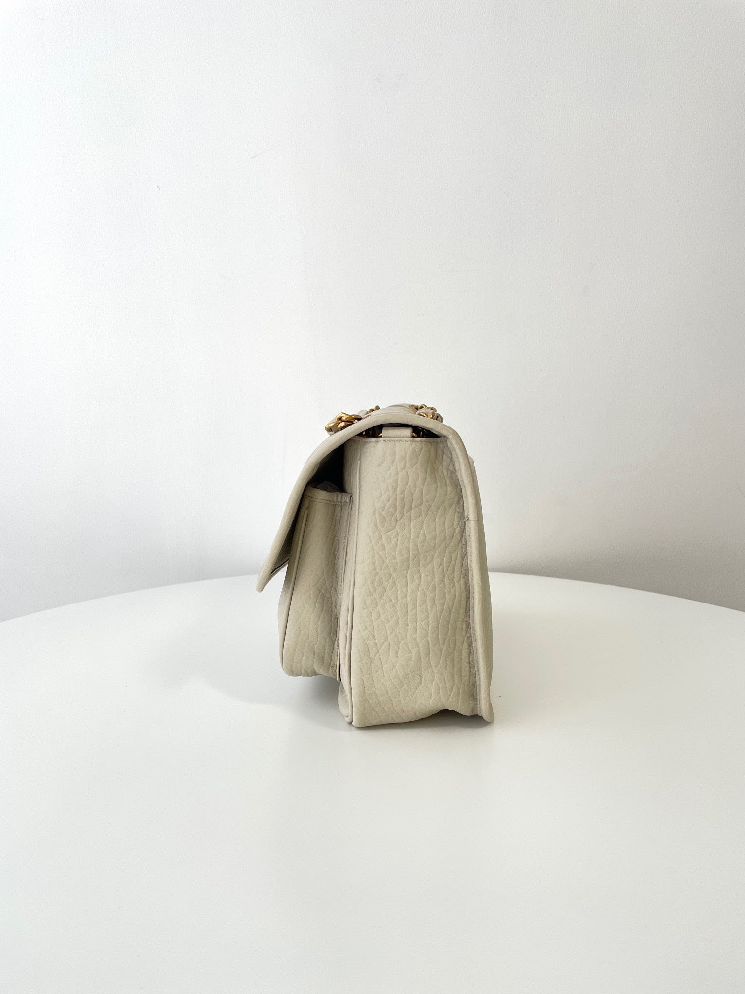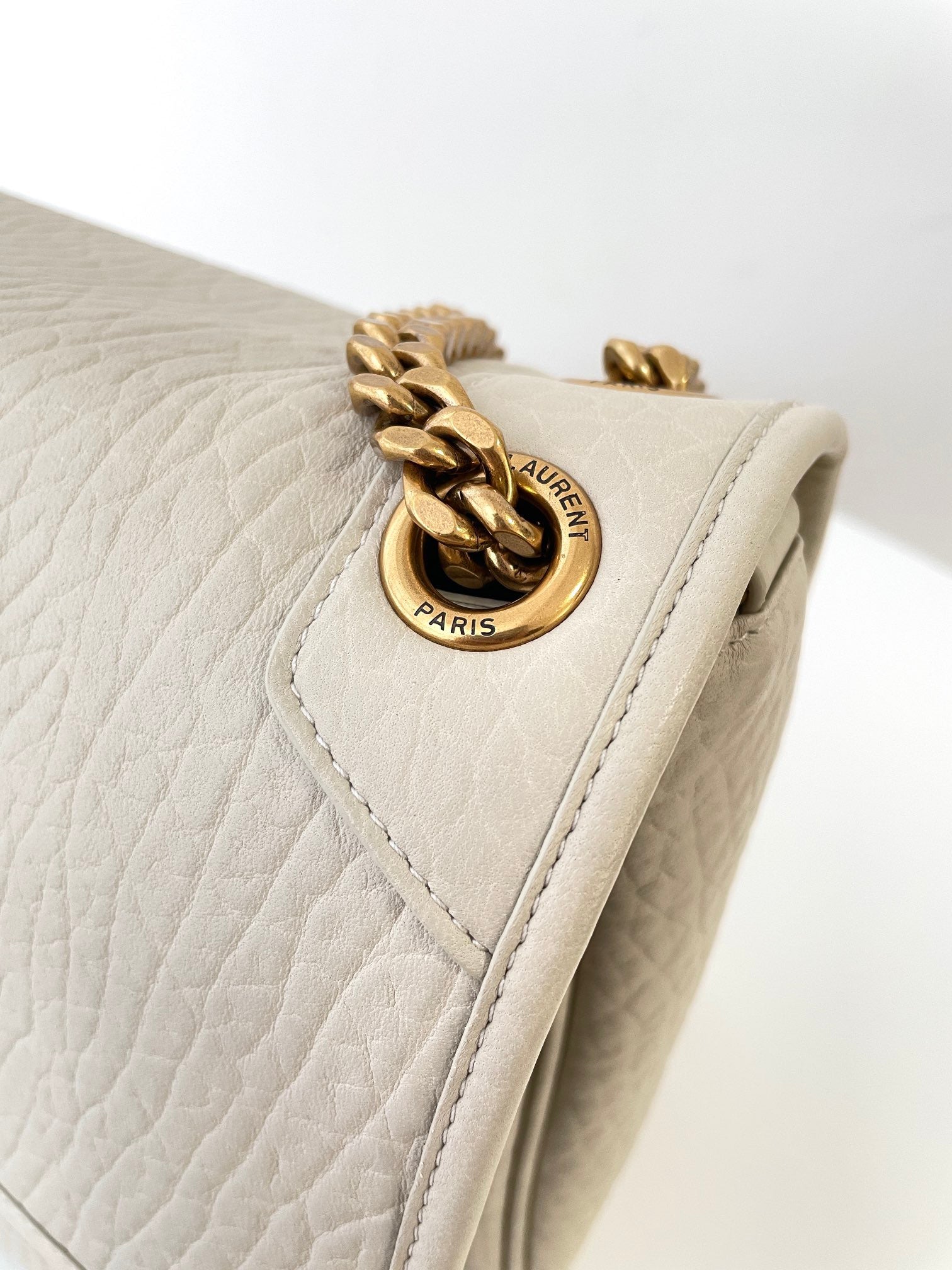 매끄럽게 그레인 처리된 램스킨은 부드러우면서도 견고한 질감을 제공하며, 플랩 전면에는 톤온톤 YSL 로고 메탈 장식이 절제된 포인트 역할을 합니다. 정제된 스티치 디테일이 전반적인 미니멀한 디자인과 조화를 이룹니다.