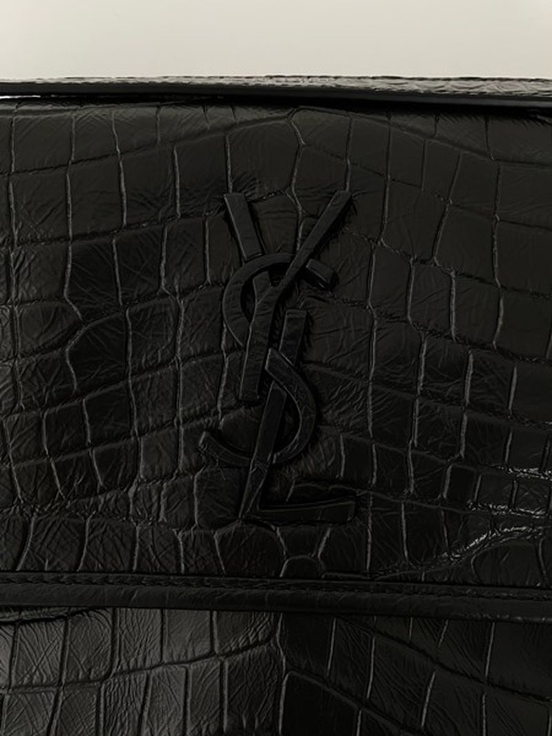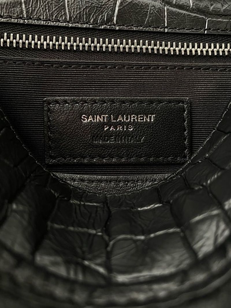 빈티지한 텍스처, 크로커다일 엠보스드 가죽, 톤온톤 YSL 로고, 다양한 수납공간이 주요 특징입니다.