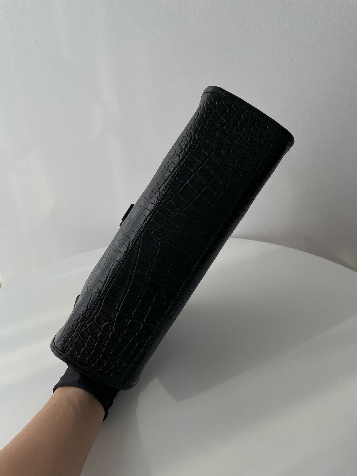 악어 엠보싱 가죽은 입체감 있는 텍스처로 시선을 사로잡으며, 은은한 광택이 세련된 느낌을 더합니다. 직선적이고 넉넉한 실루엣이 실용성과 격식을 모두 갖춘 디자인으로, 다양한 착장에 고급스러운 포인트가 되어줍니다.