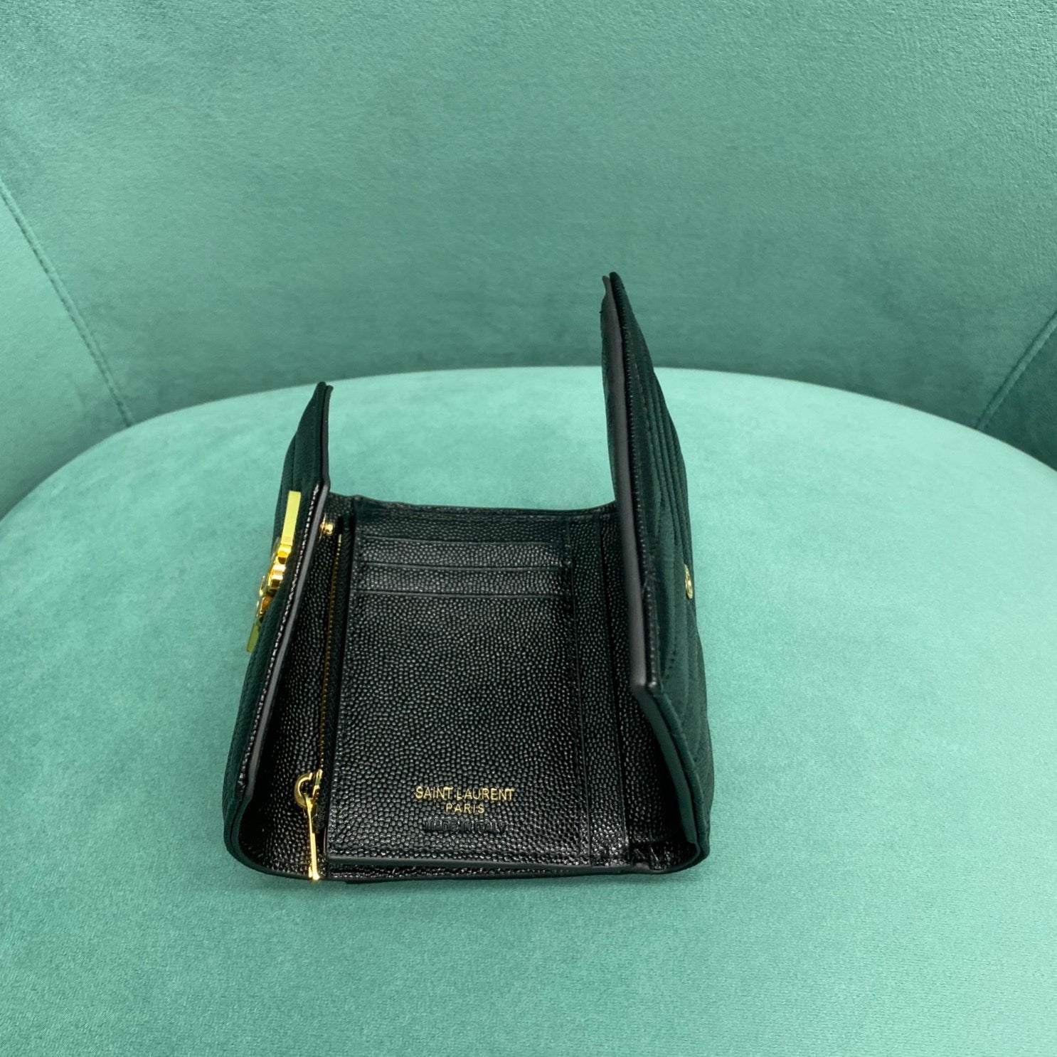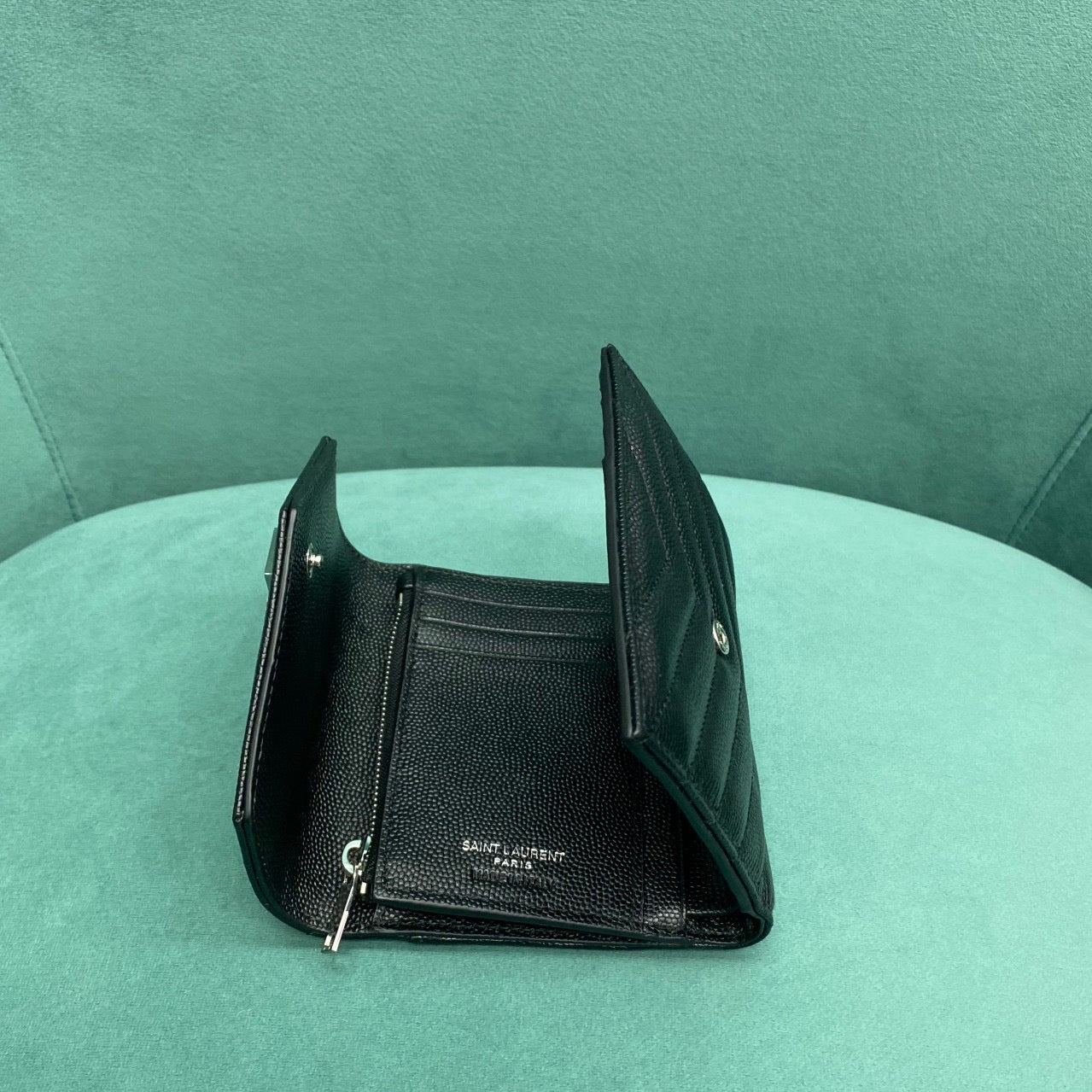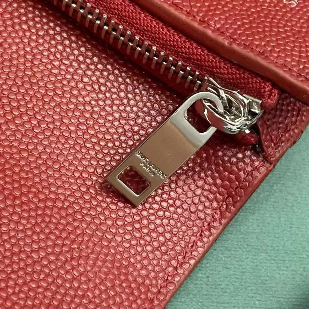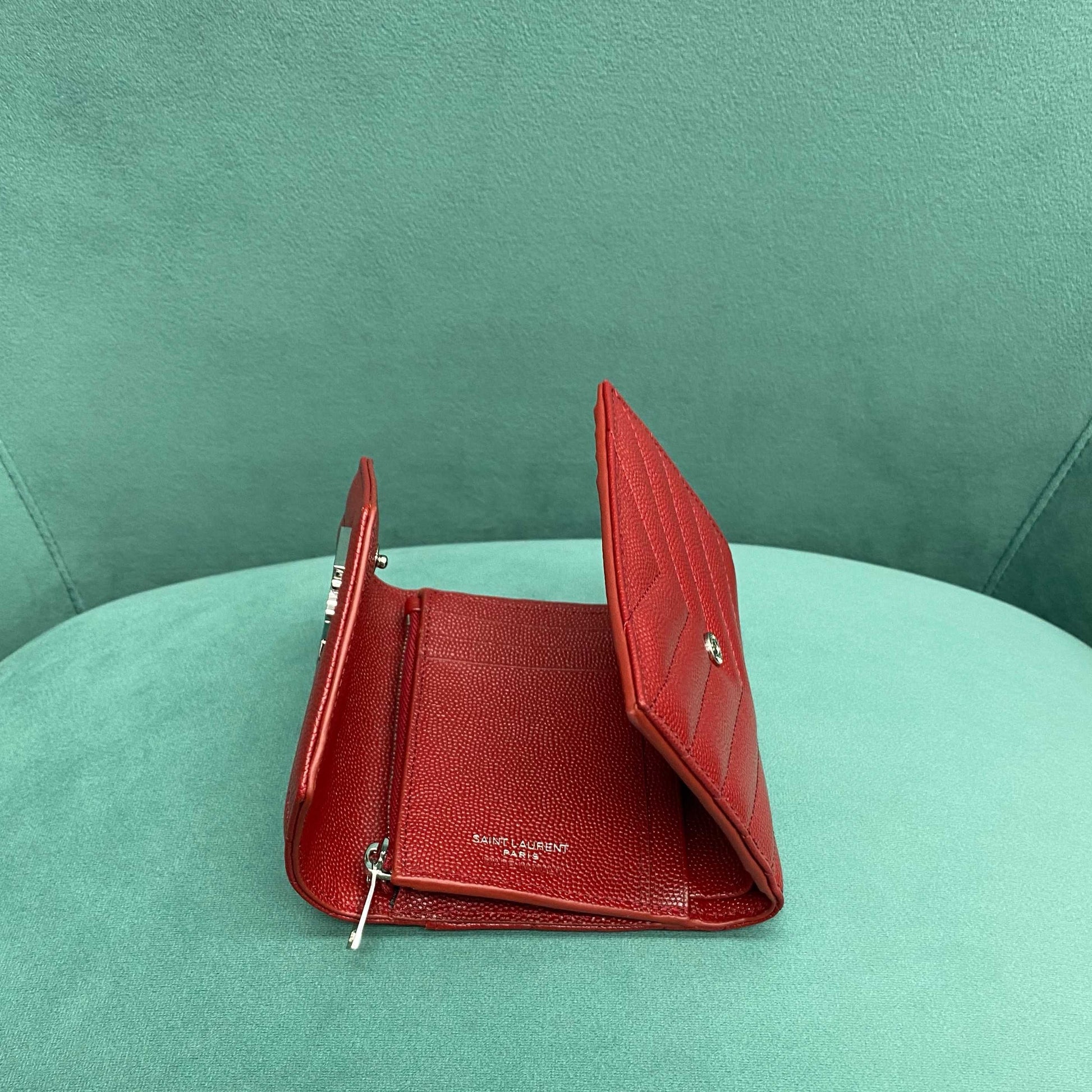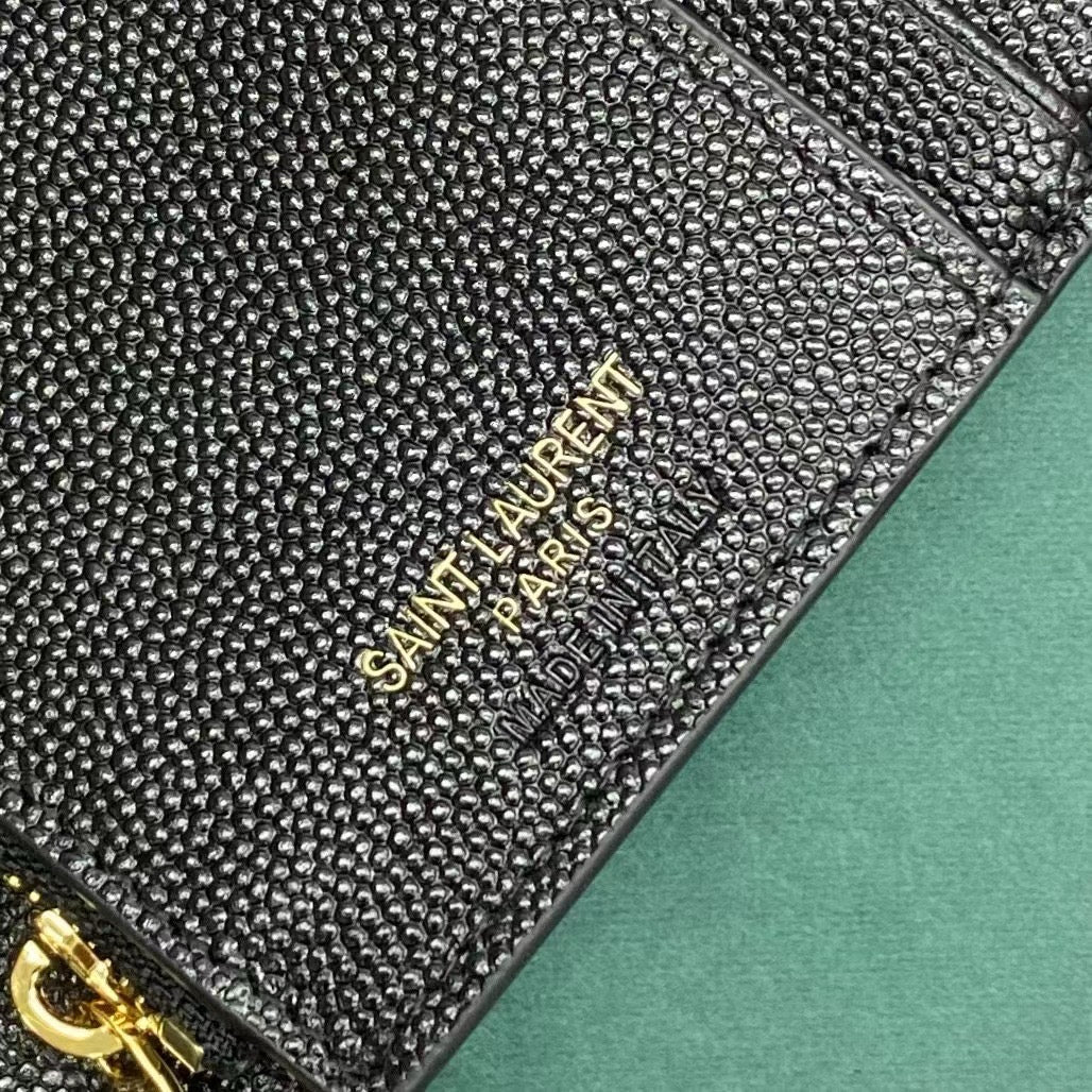이 지갑은 마테라쎄 퀼팅 가죽 위에 메탈 YSL 로고가 정중앙에 장식되어 있으며, 세 번 접히는 트라이폴드(3단) 구조로 되어 있어 컴팩트한 외형에 비해 넉넉한 수납 공간을 제공합니다. 부드럽고 견고한 송아지 가죽이 사용되어 뛰어난 내구성과 감촉을 자랑합니다.