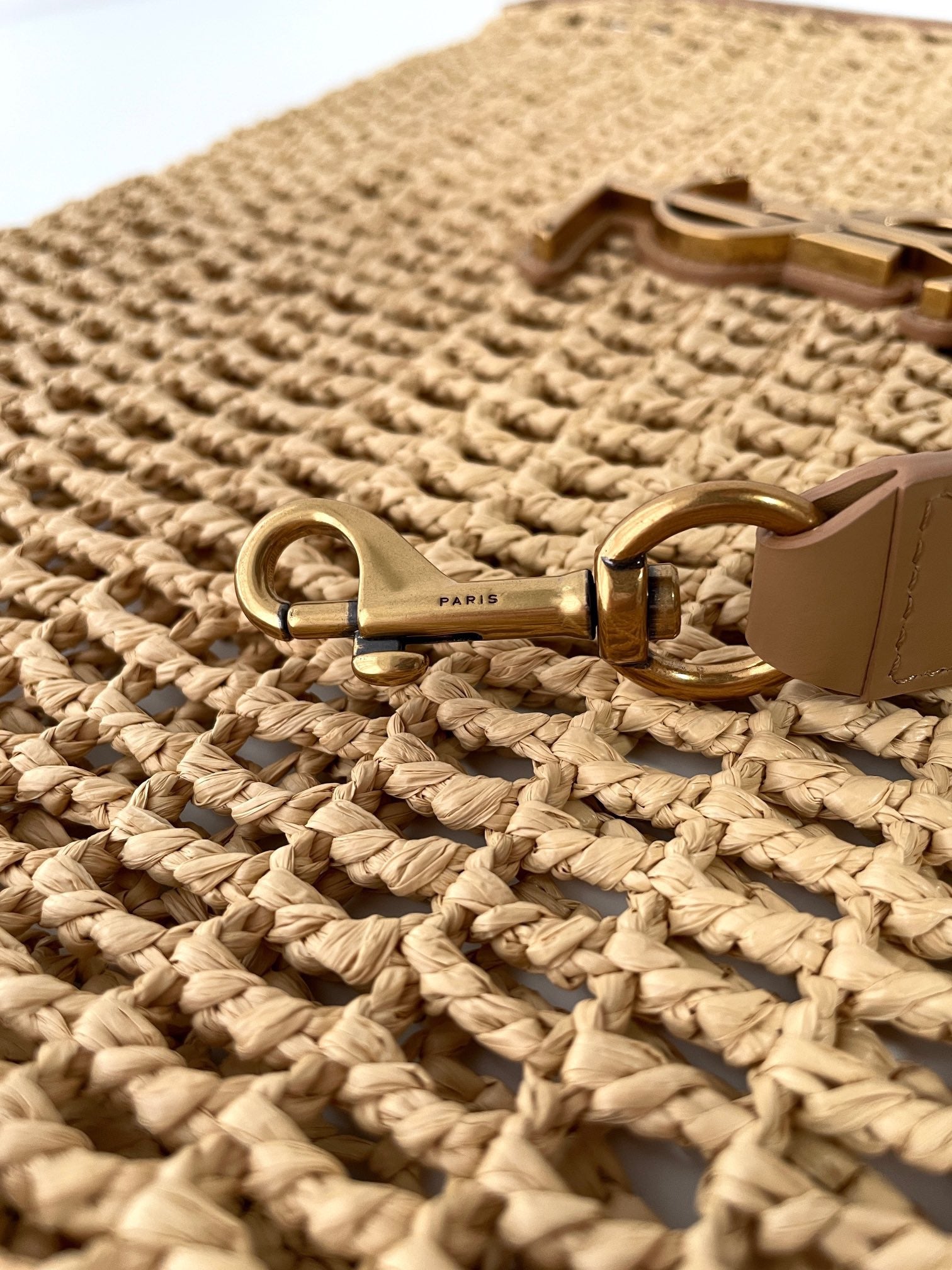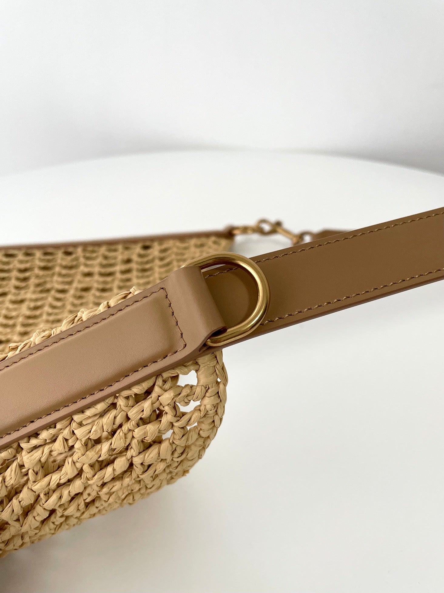 생로랑 옥살리스 라피아 마크라메 숄더 백은 부드러운 곡선 형태의 실루엣과 핸드메이드 느낌의 마크라메 짜임이 특징입니다. 가벼운 라피아 소재가 시원한 인상을 주며, 가죽 디테일과 YSL 로고 참 장식이 고급스러운 포인트를 더합니다. 여름철 가벼운 복장과도 잘 어우러져 데일리 룩에 자연스럽게 녹아듭니다.