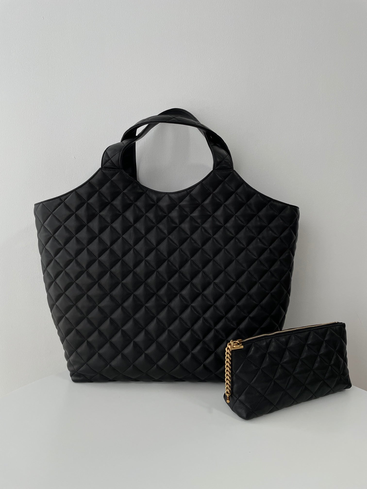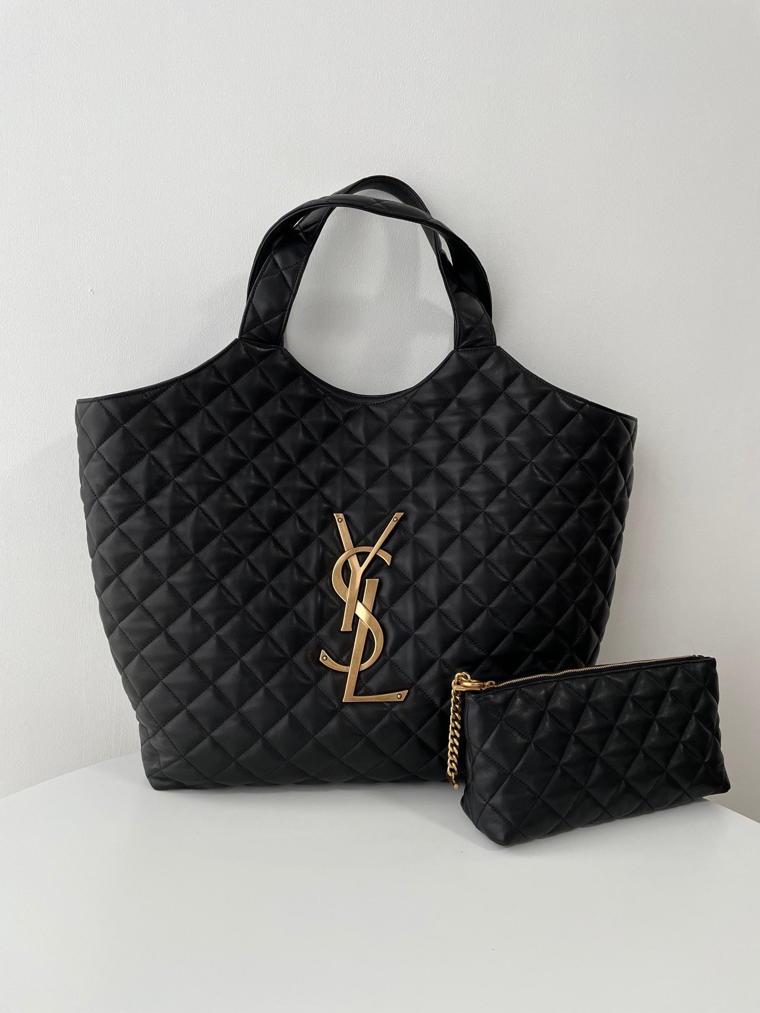 생로랑 이카르 맥시 쇼퍼백 램스킨(Saint Laurent Icare Maxi Shopping Tote in Lambskin)은 부드럽고 고급스러운 램스킨에 Carré 퀼팅 패턴이 더해진 대형 토트백입니다. 넉넉한 수납 공간, 탈착 가능한 지퍼 파우치, 시그니처 CASSANDRE 로고와 토글 클로저 디테일이 특징이며, 실용성과 럭셔리를 모두 갖춘 아이템입니다.