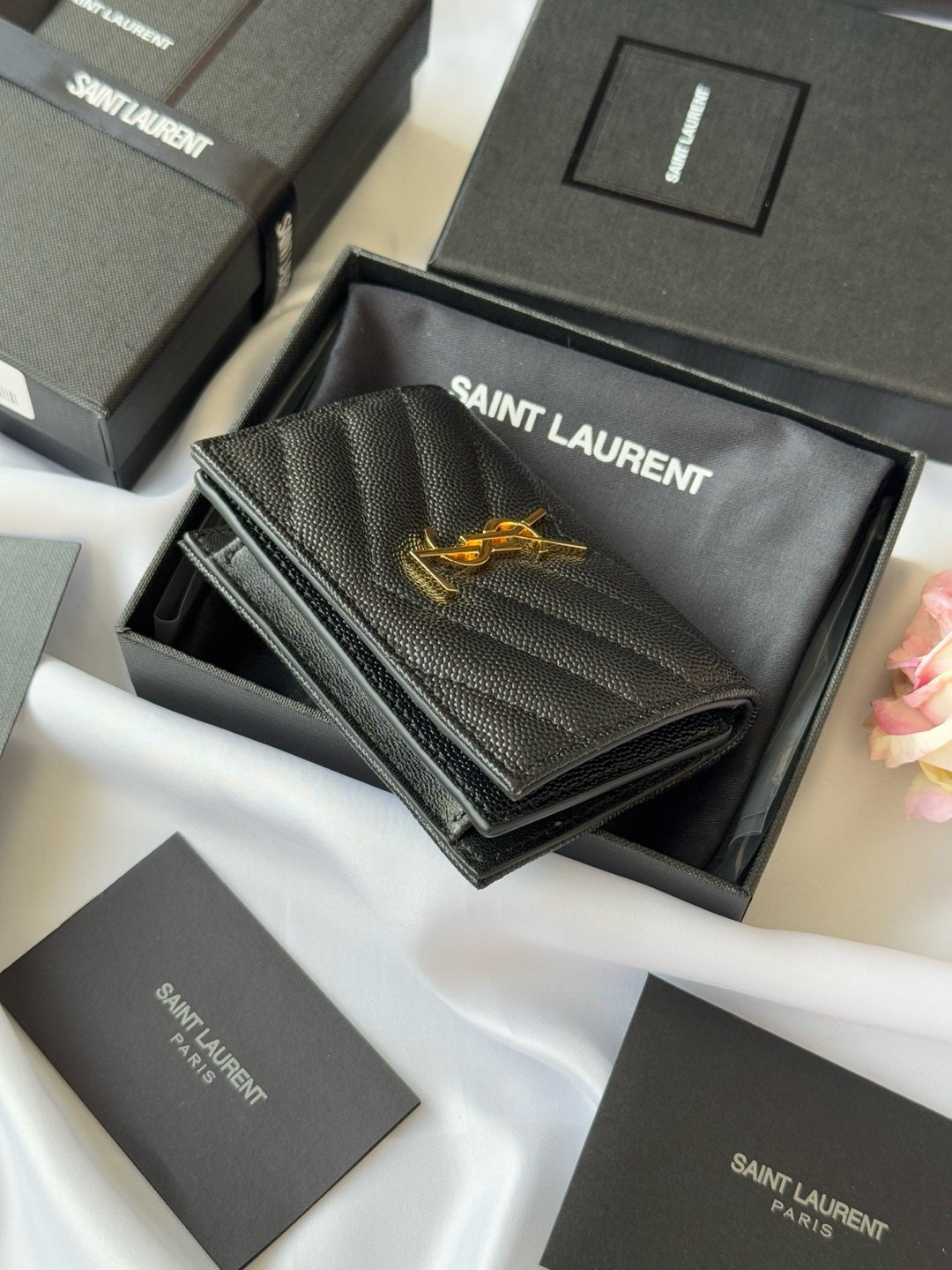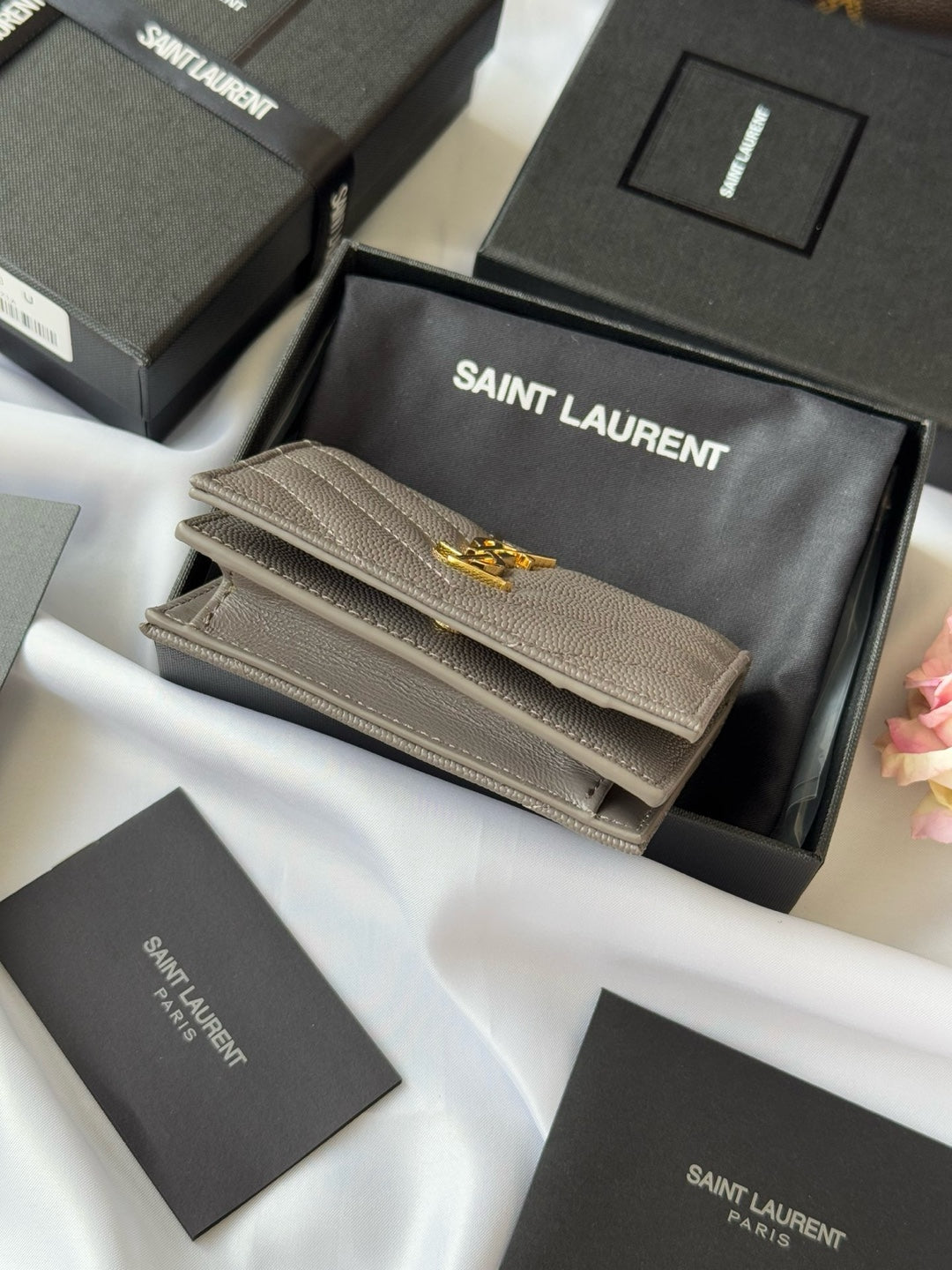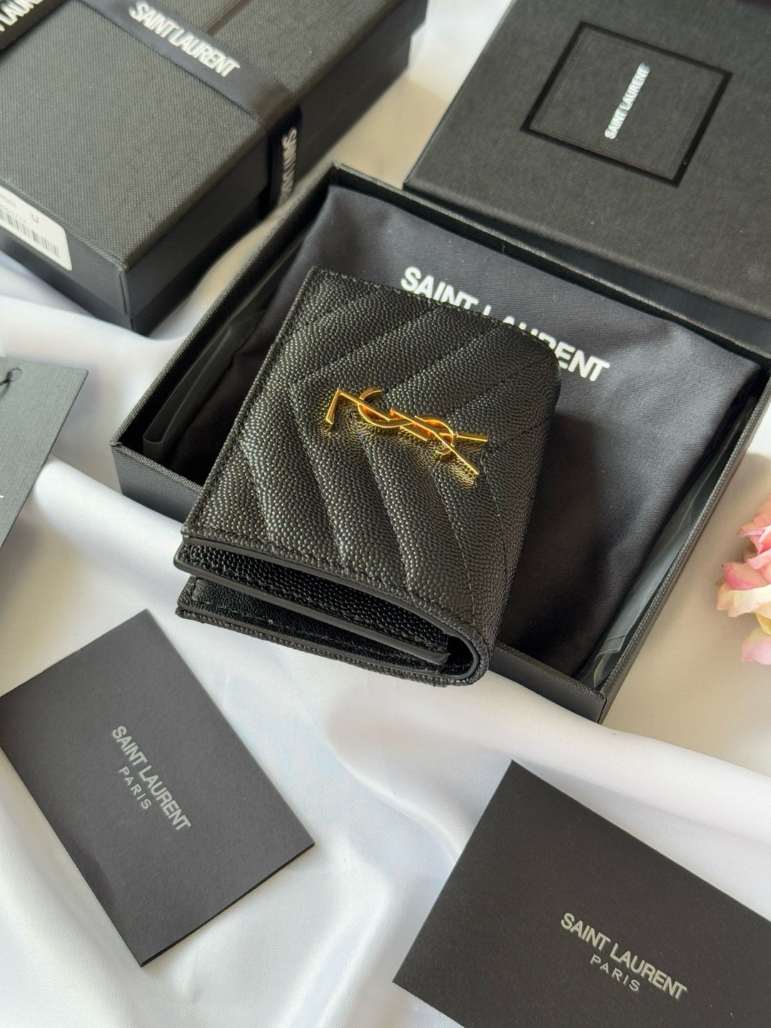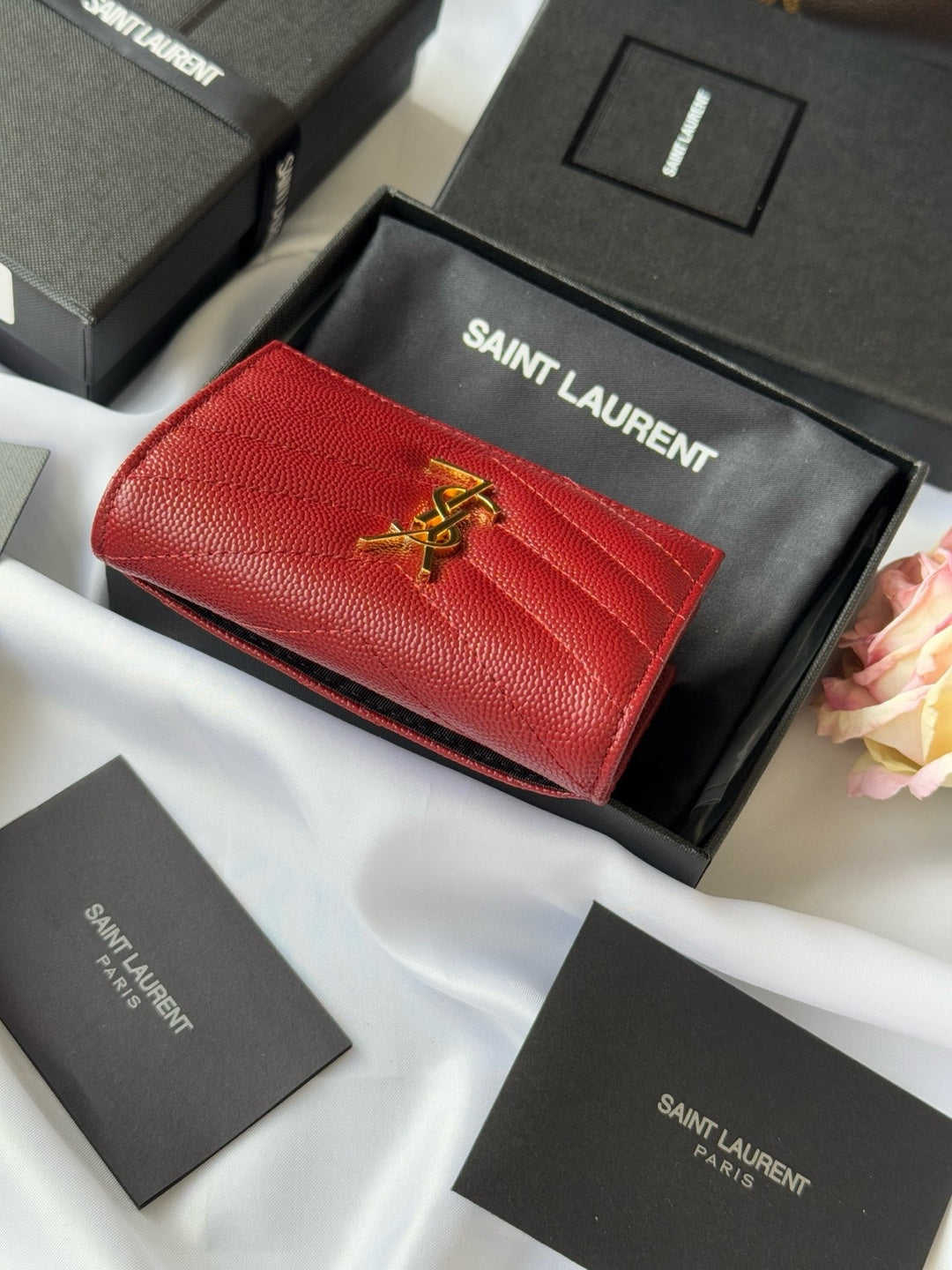 고급 송아지 가죽에 마테라쎄 퀼팅 처리가 되어 있으며, YSL 로고는 금속 디테일로 마감되어 있습니다.