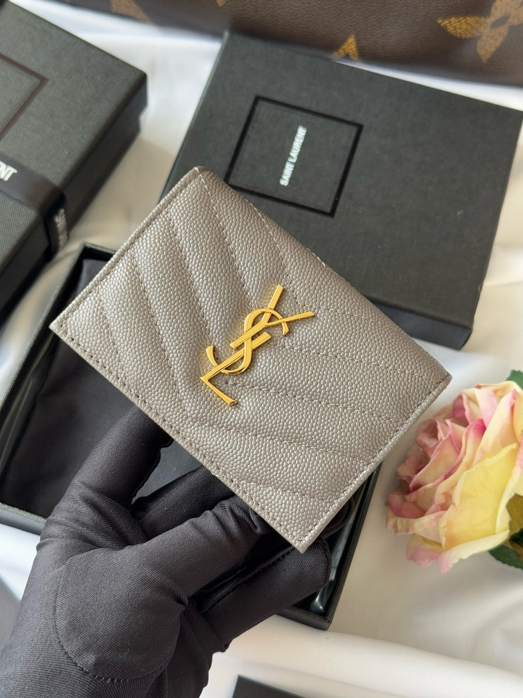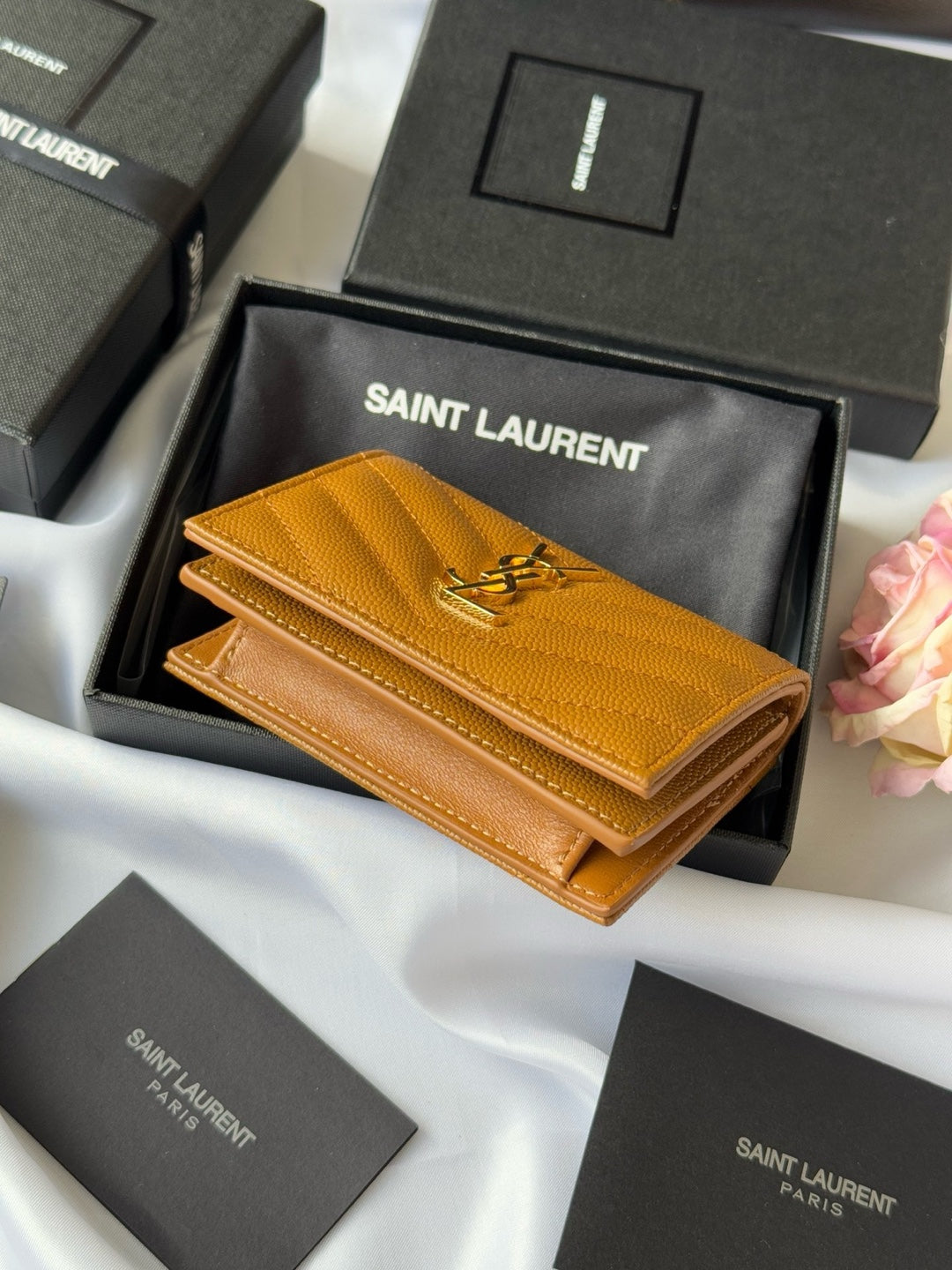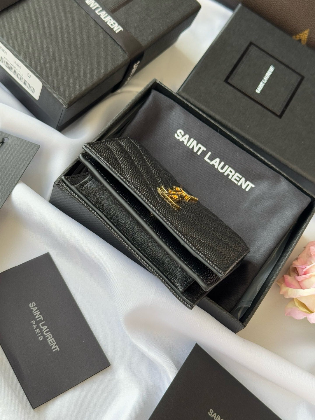 고급 송아지 가죽에 마테라쎄 퀼팅 처리가 되어 있으며, YSL 로고는 금속 디테일로 마감되어 있습니다.