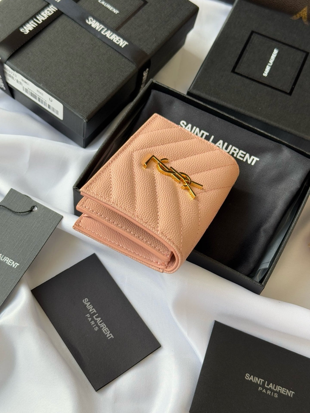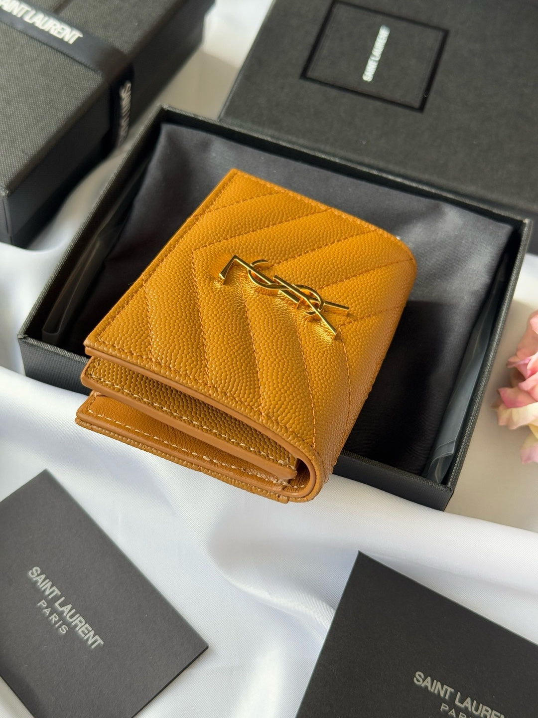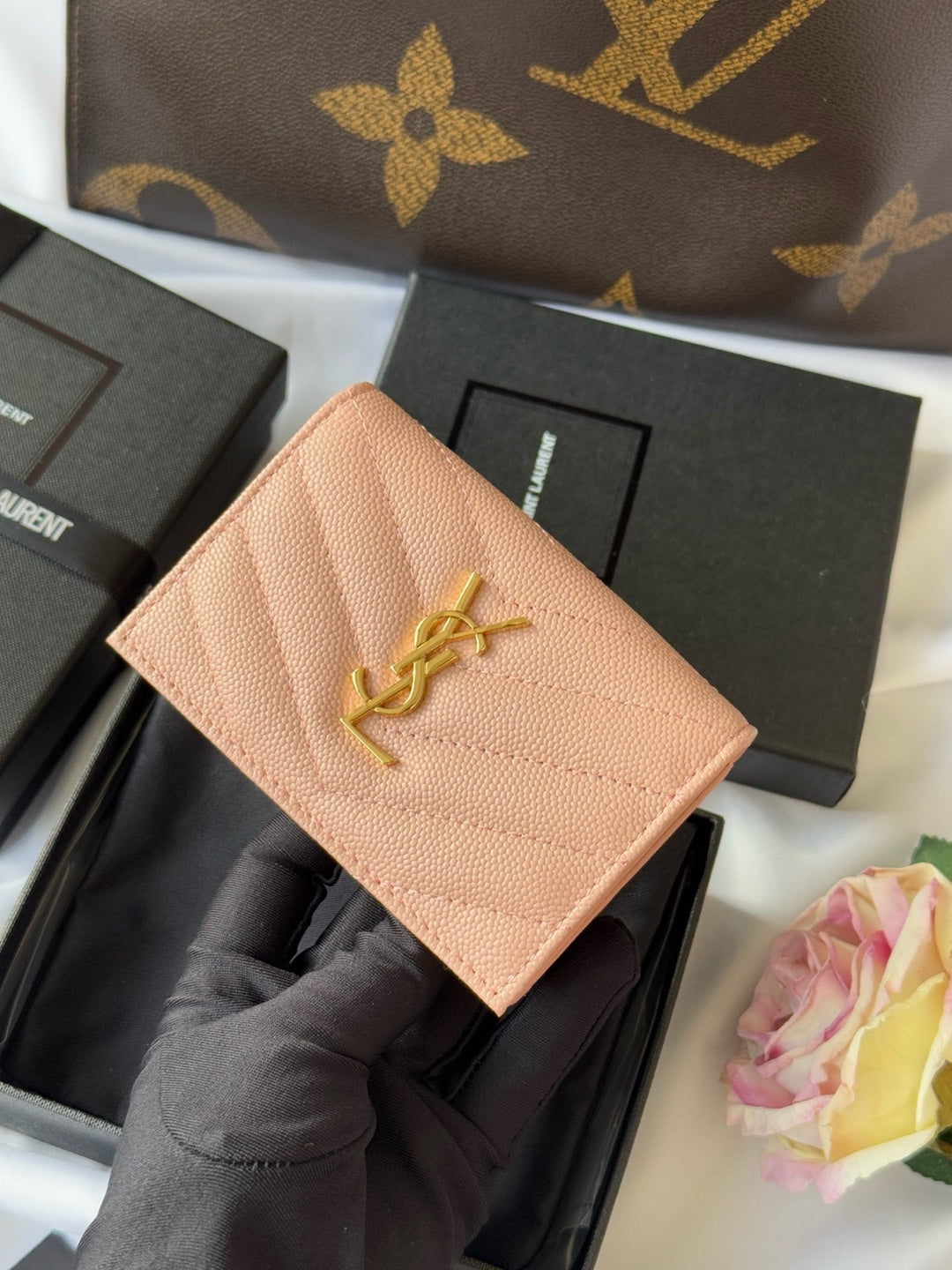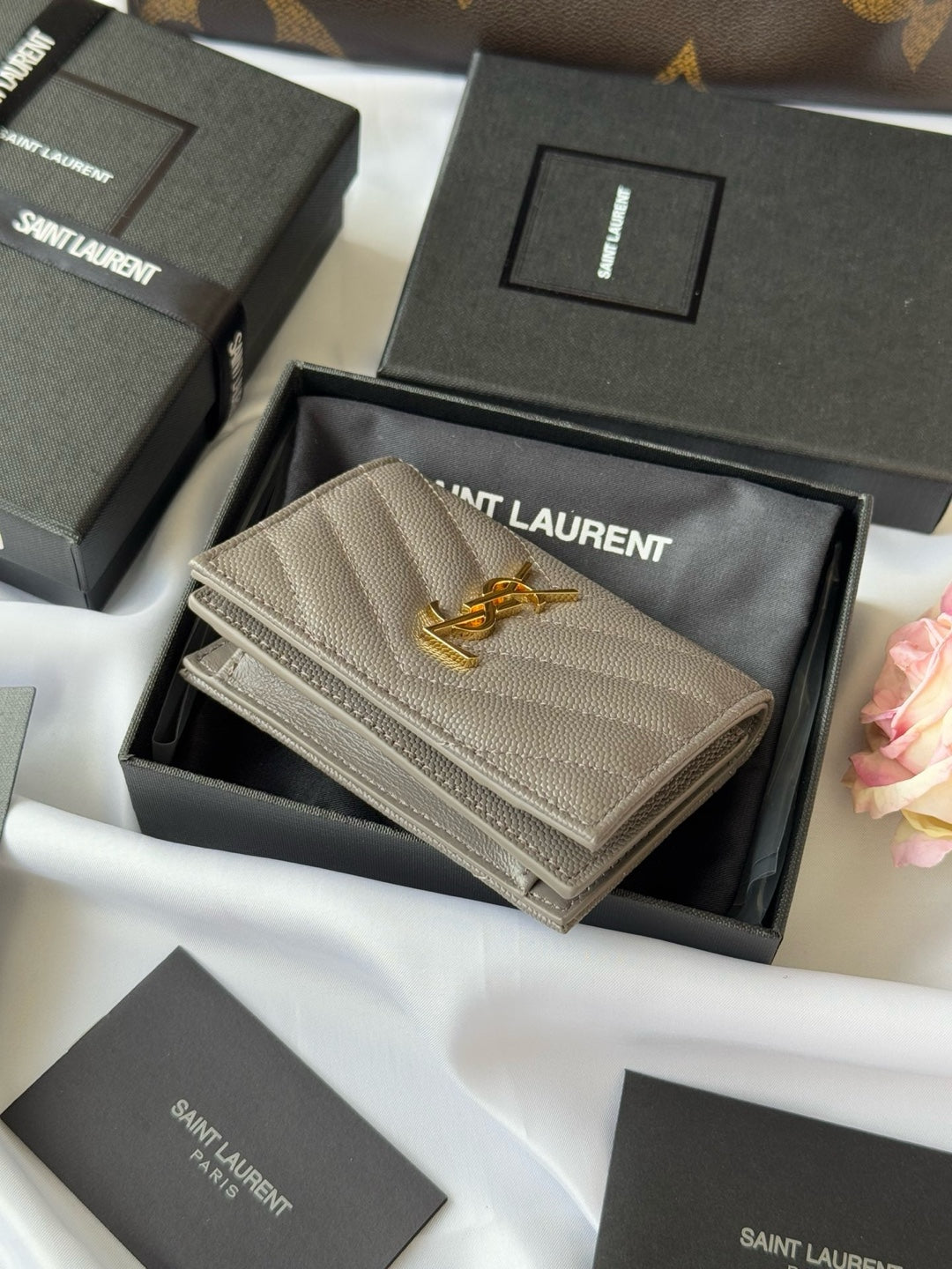 고급 송아지 가죽에 마테라쎄 퀼팅 처리가 되어 있으며, YSL 로고는 금속 디테일로 마감되어 있습니다.