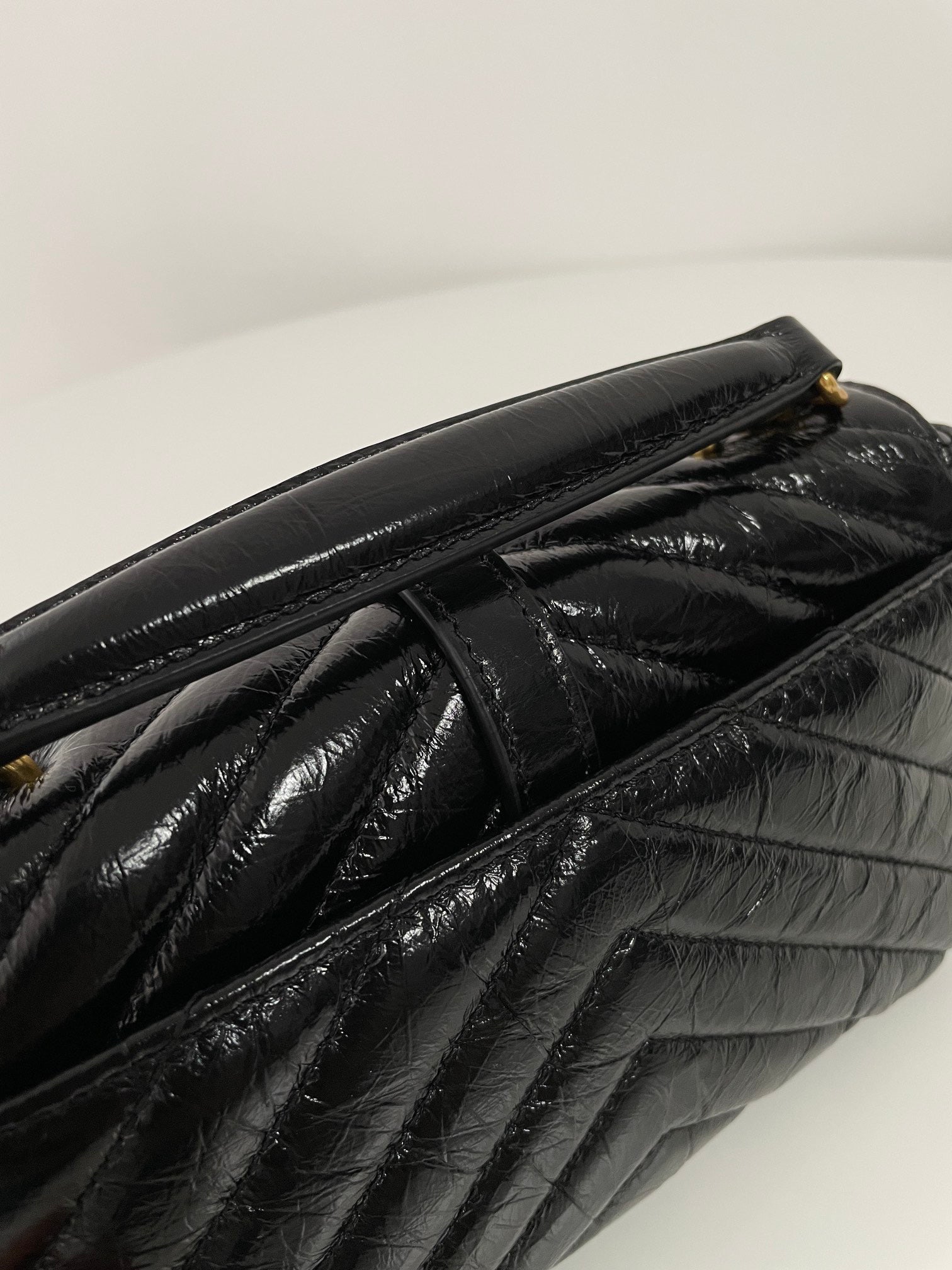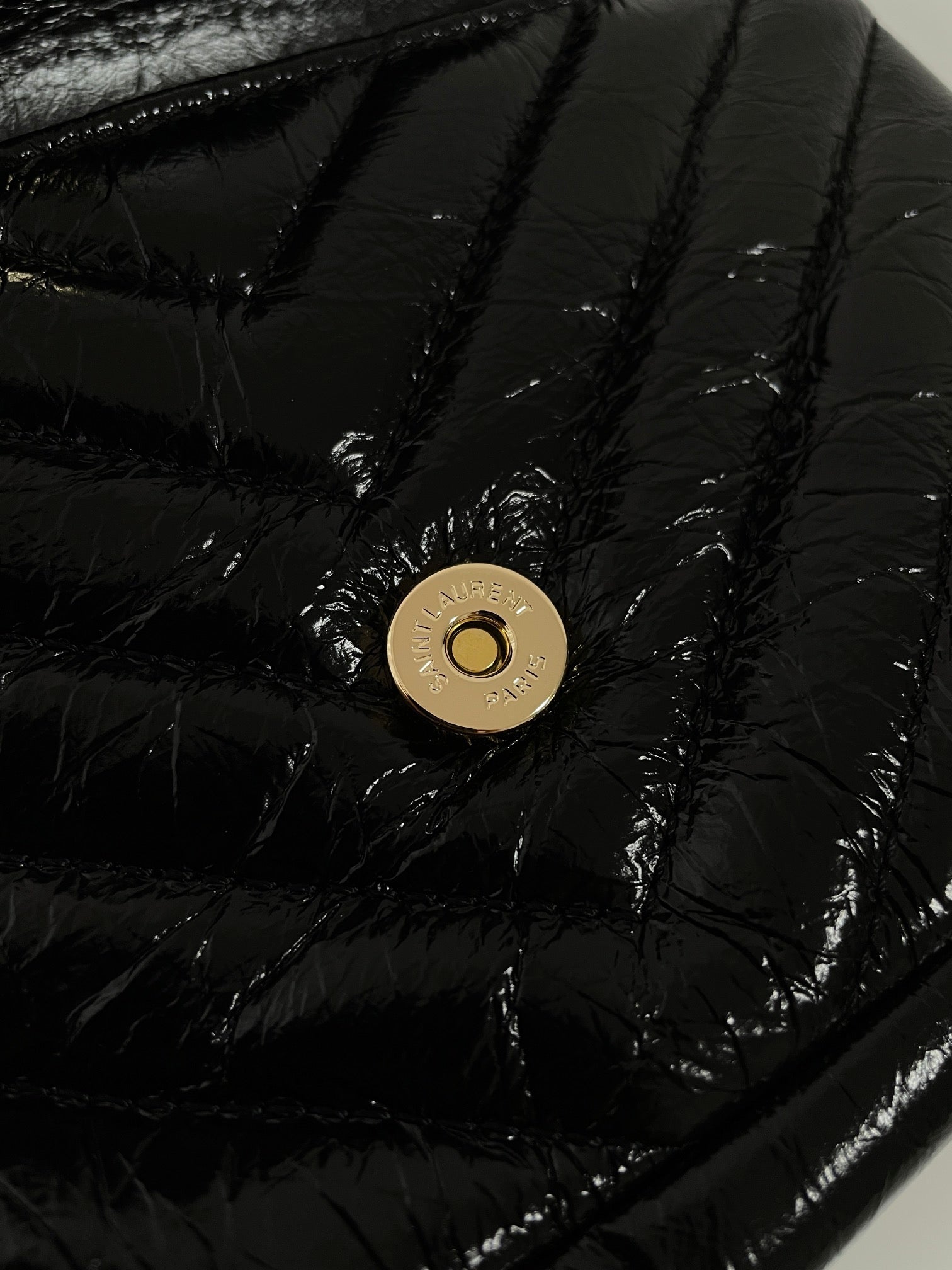 Chevron 퀼팅 디테일이 돋보이는 광택감 있는 크랙 가죽 또는 스무스 송아지 가죽 소재로 제작되었으며, 전면에는 골드 톤의 CASSANDRE 로고가 생로랑의 아이덴티티를 강하게 드러냅니다. 토트와 숄더, 크로스바디로 모두 활용 가능하여 실용적인 디자인입니다.