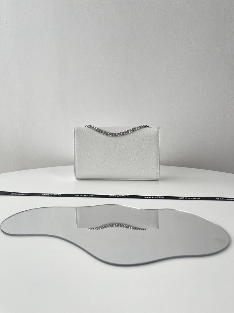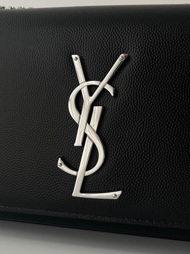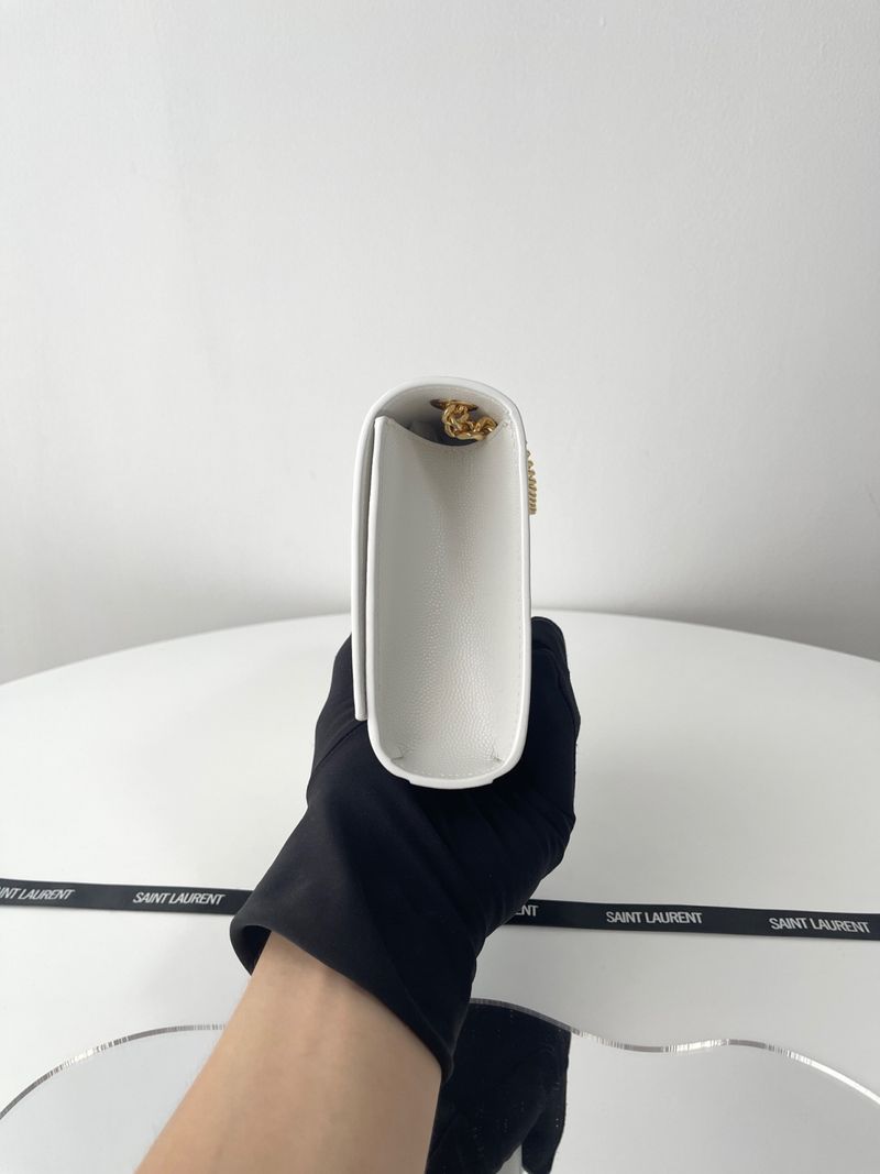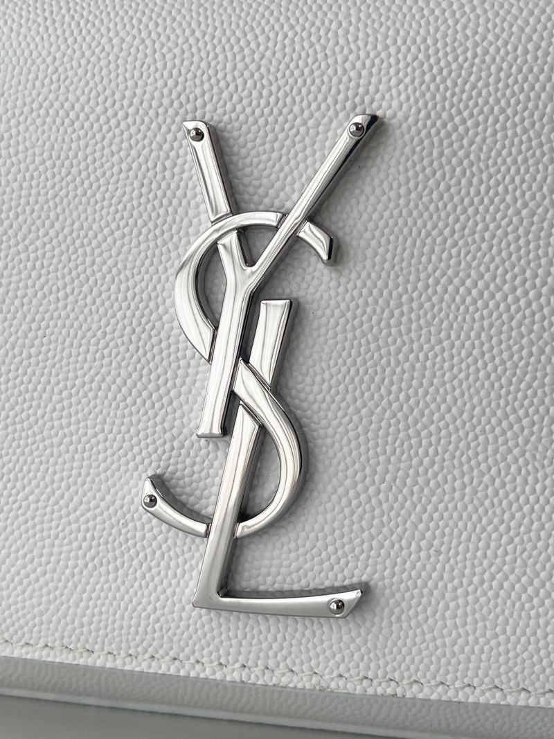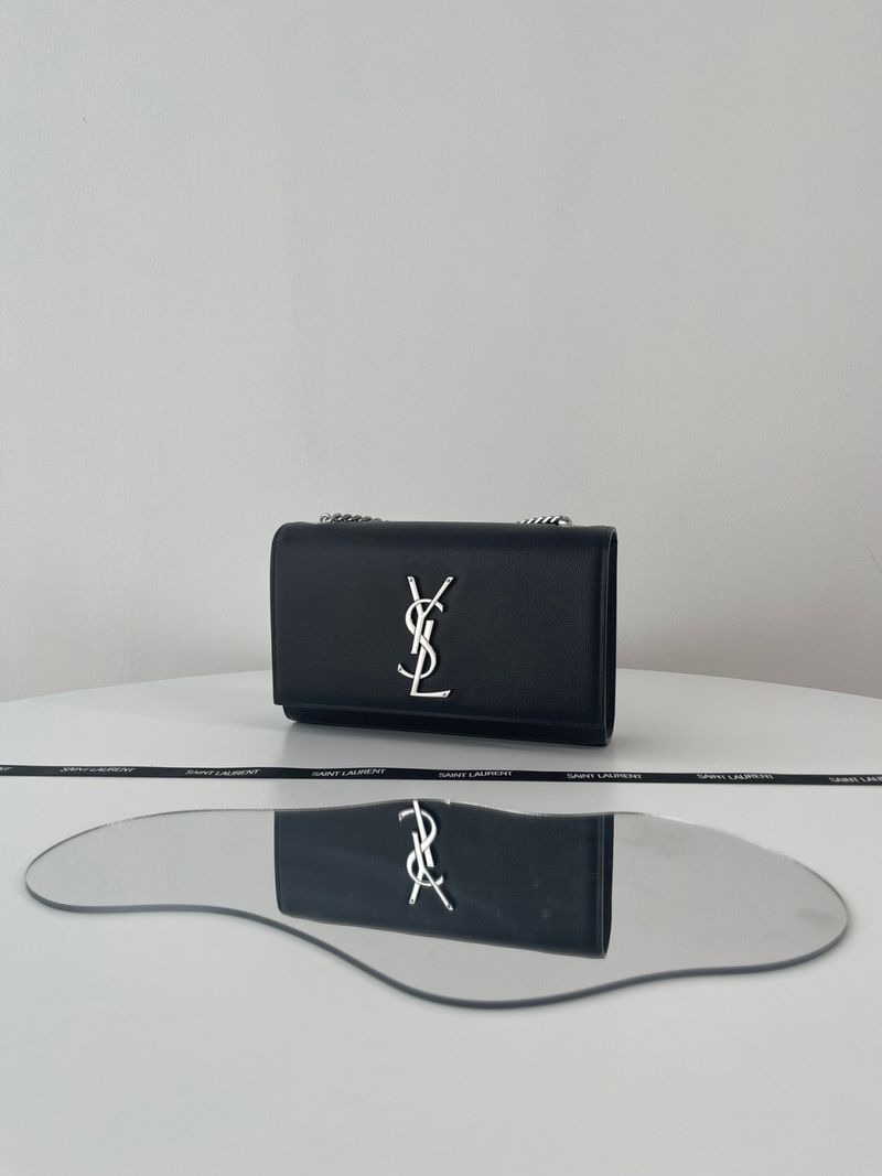 케이트 백은 직사각형 구조에 플랩 클로저 디자인으로 구성되어 있으며, 전면에는 생로랑의 시그니처인 YSL 메탈 로고가 자리잡고 있습니다. 스몰 사이즈는 작고 단정한 비율로 데일리나 이브닝 룩에 잘 어울리며, 롱 체인 스트랩은 숄더 또는 크로스바디로 다양하게 연출할 수 있습니다.