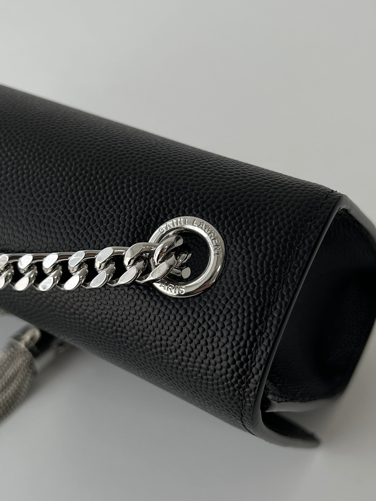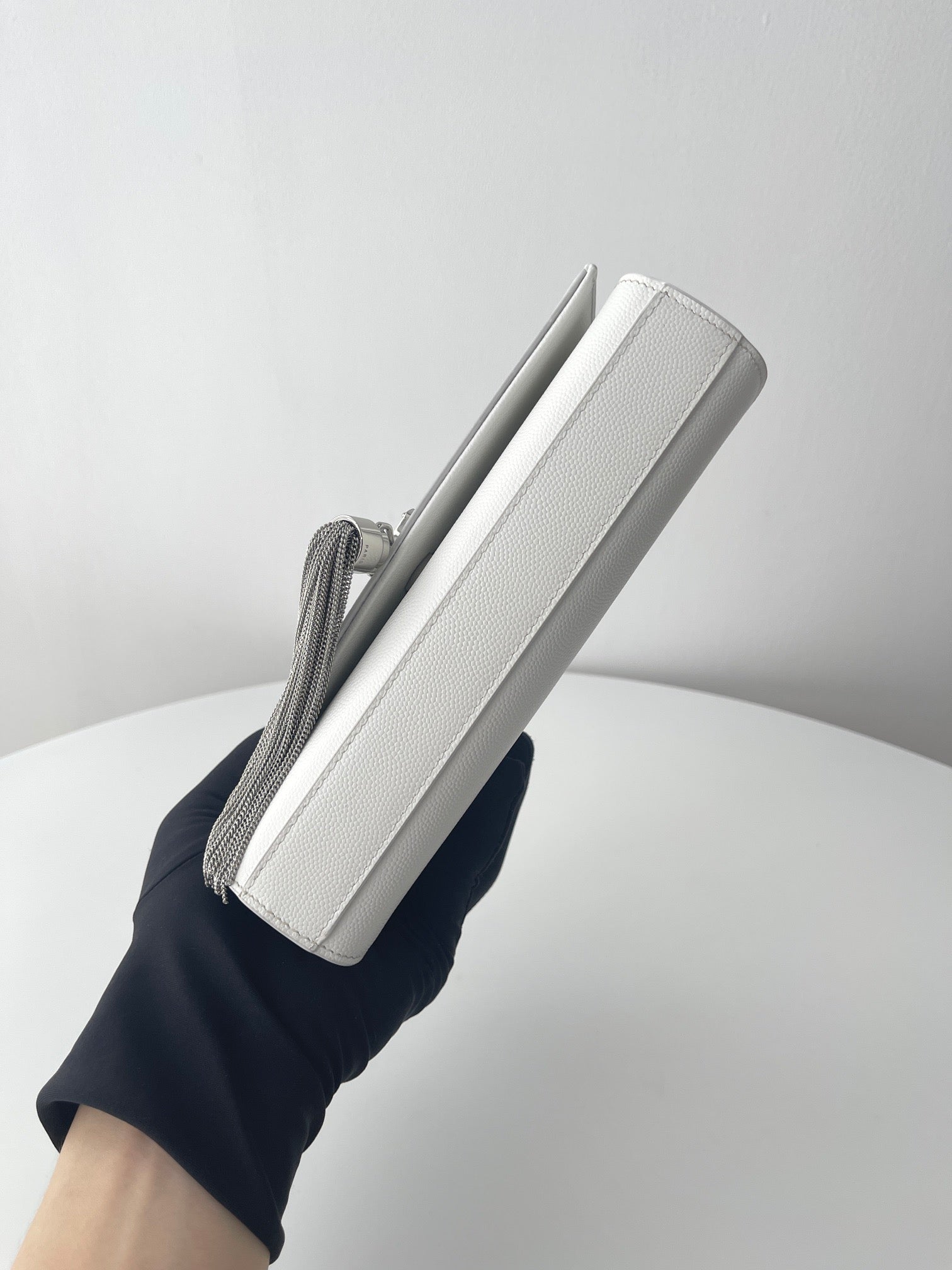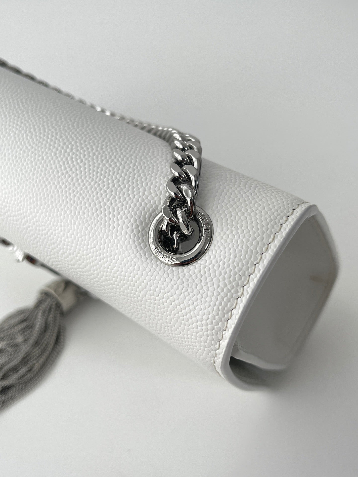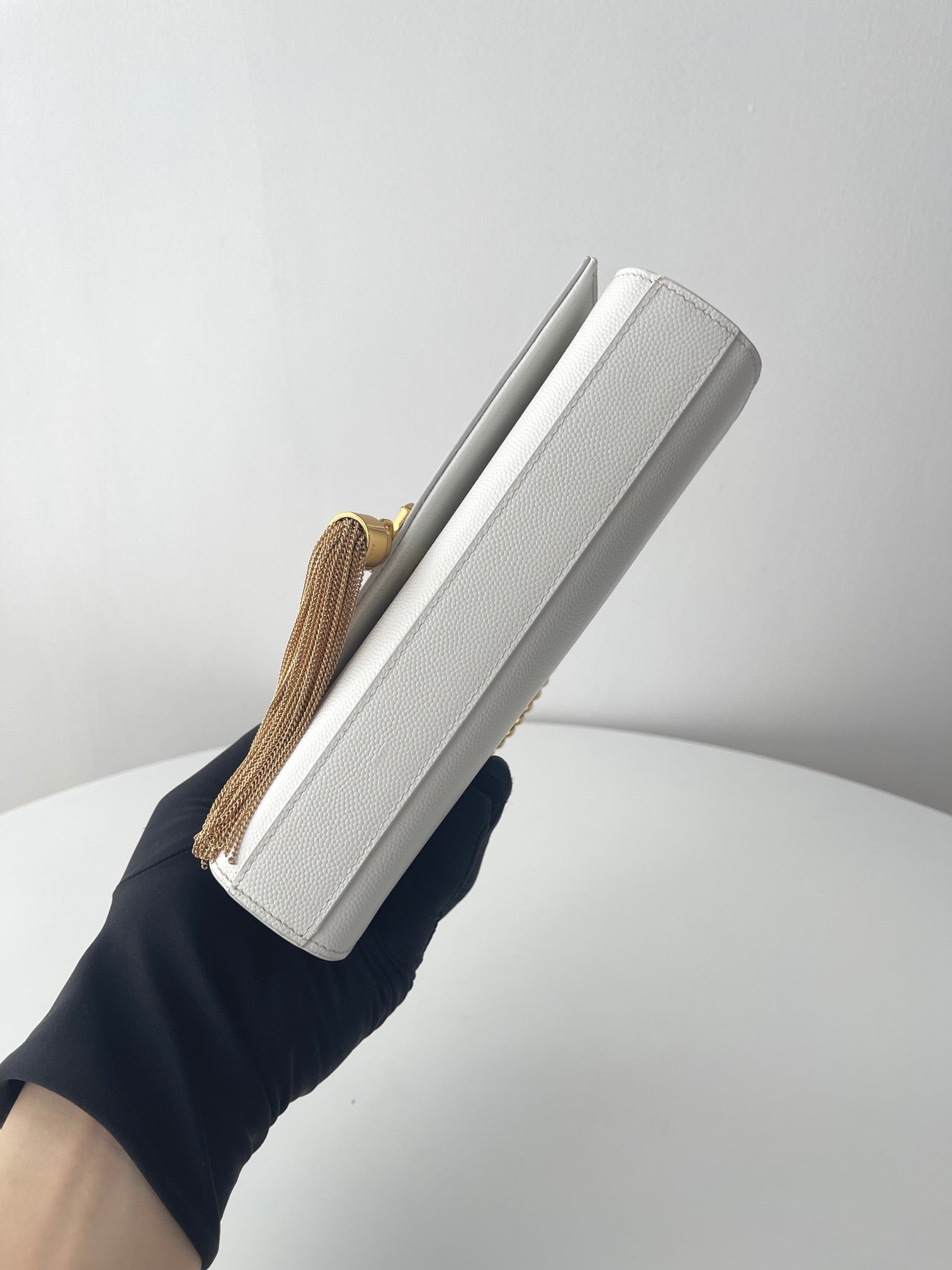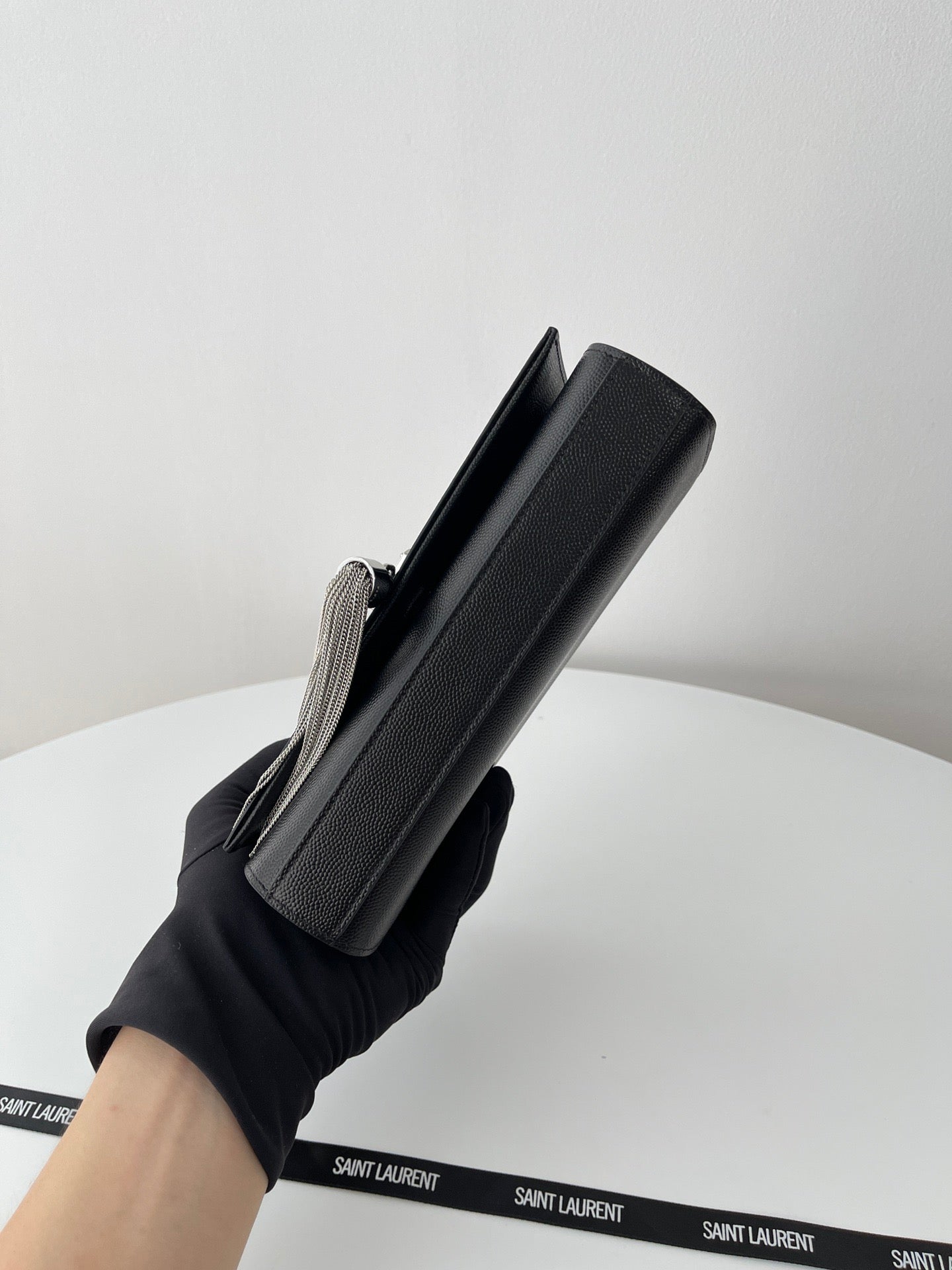 디테일: YSL 메탈 로고, 체인 스트랩, 메탈 테슬 장식, 마그네틱 플랩 클로저