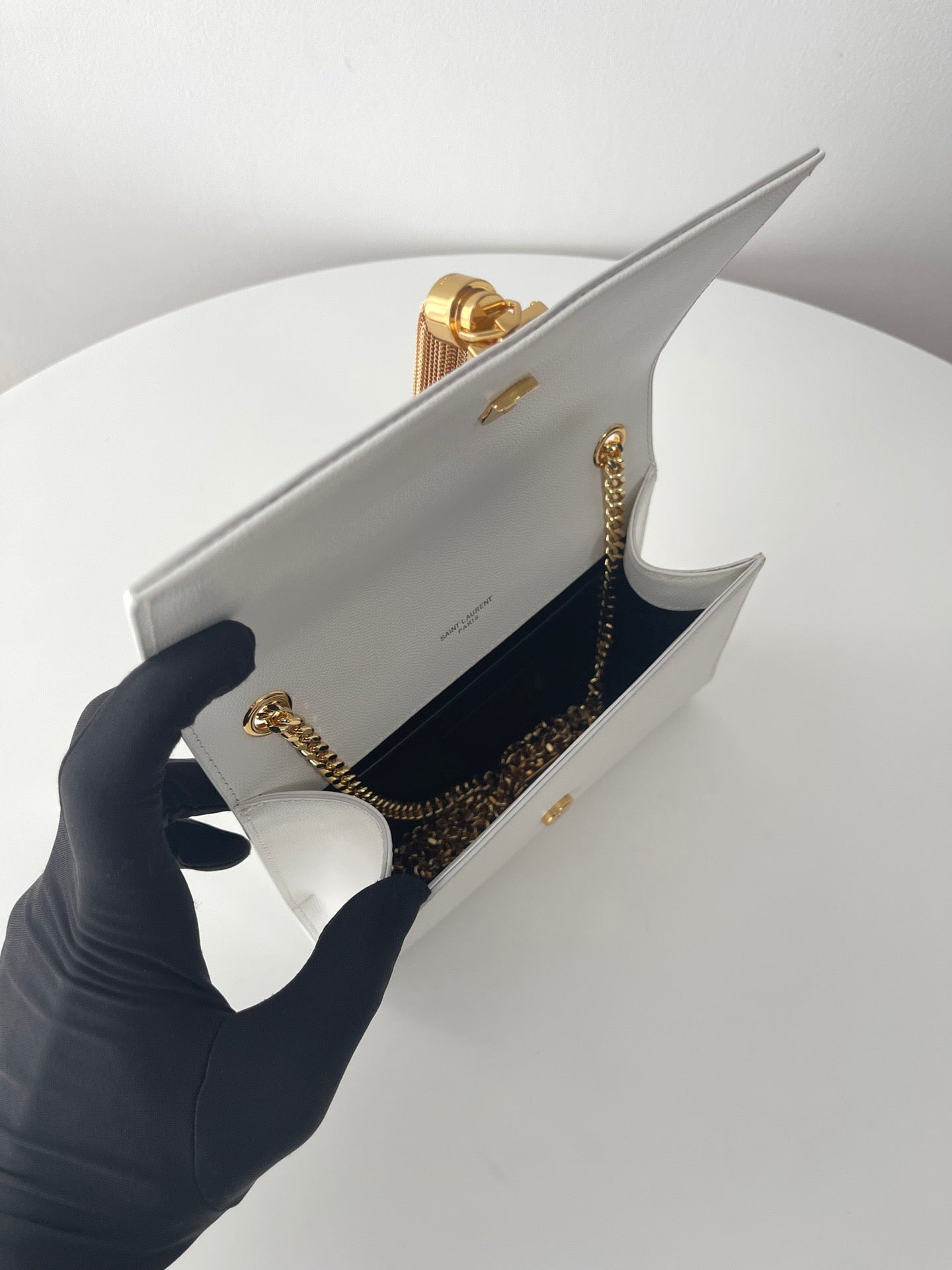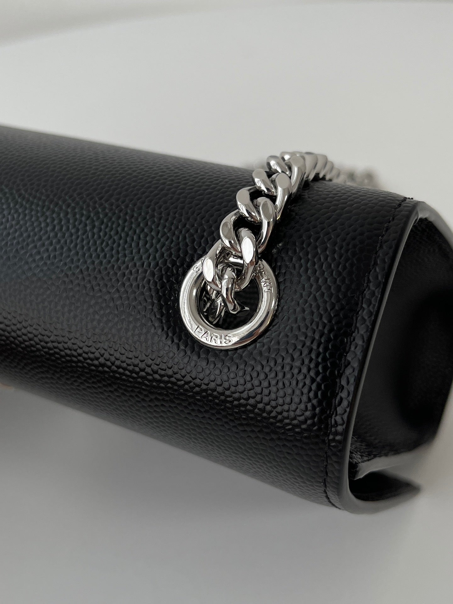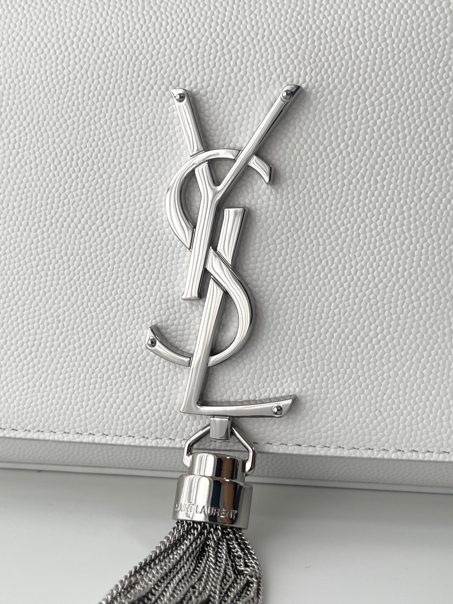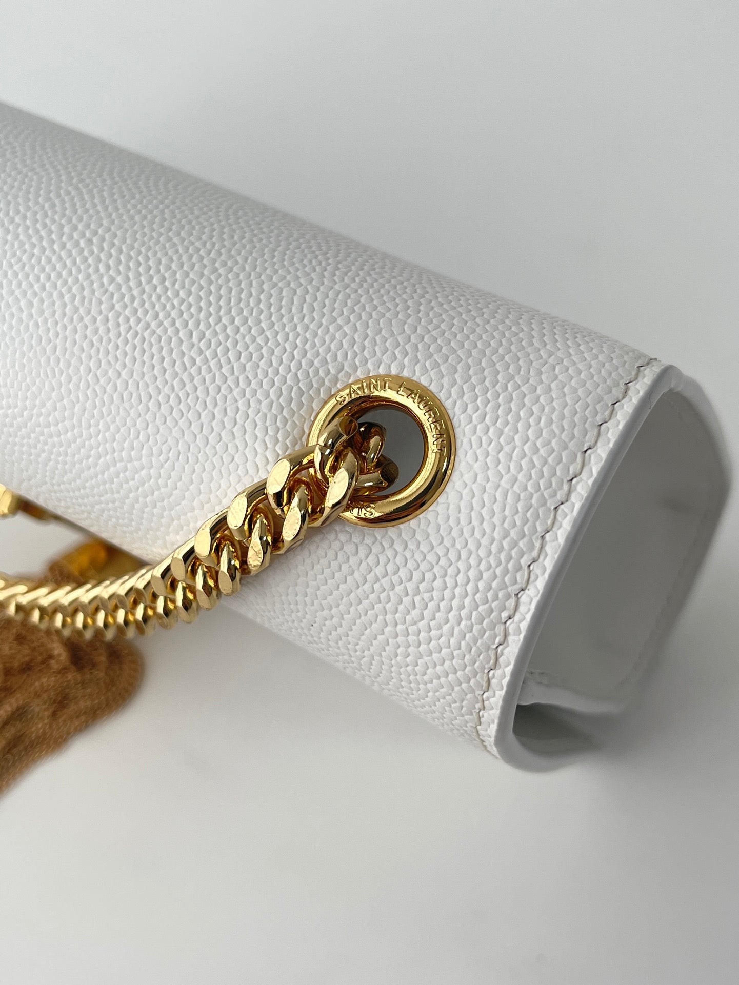 디테일: YSL 메탈 로고, 체인 스트랩, 메탈 테슬 장식, 마그네틱 플랩 클로저