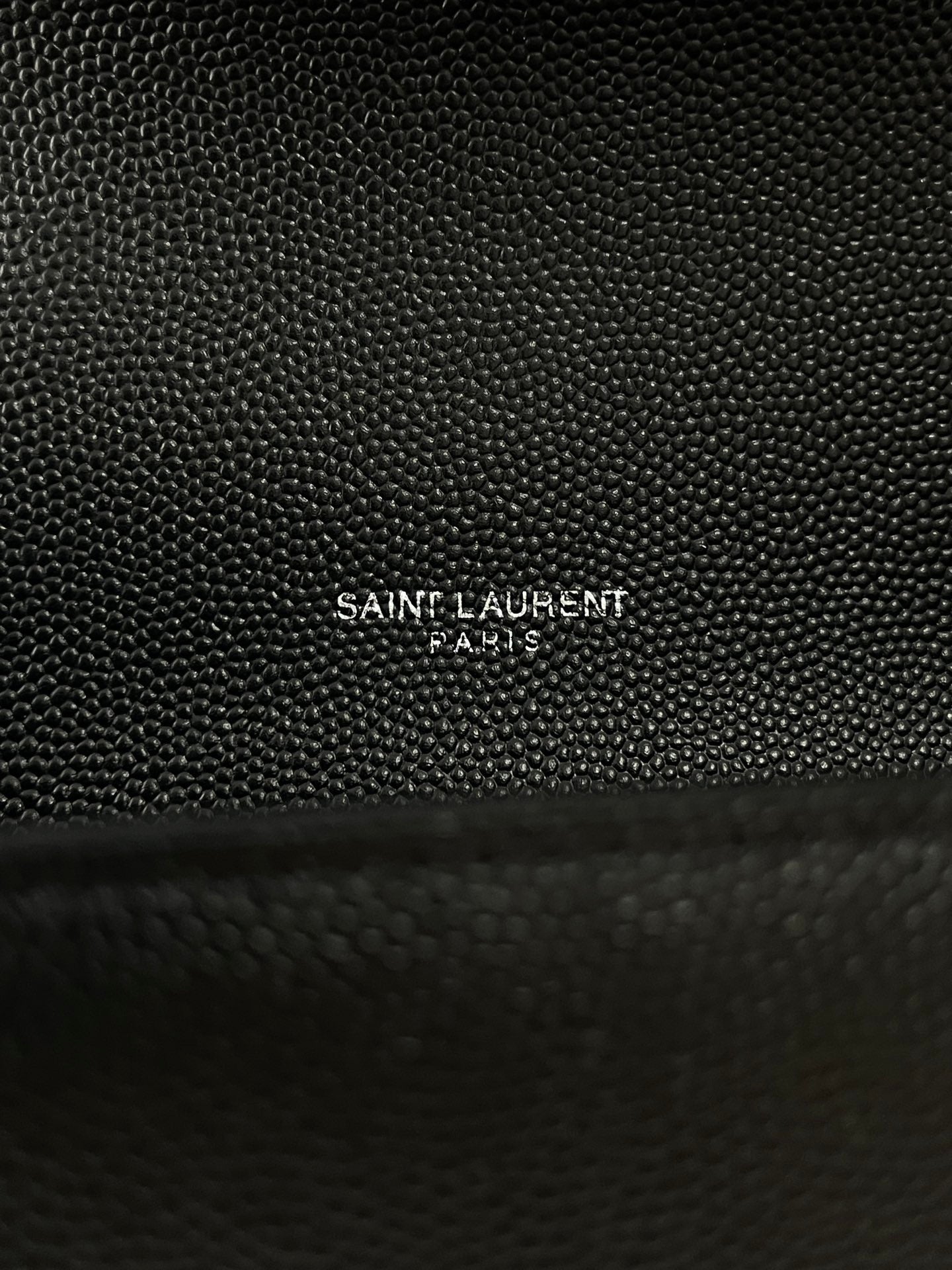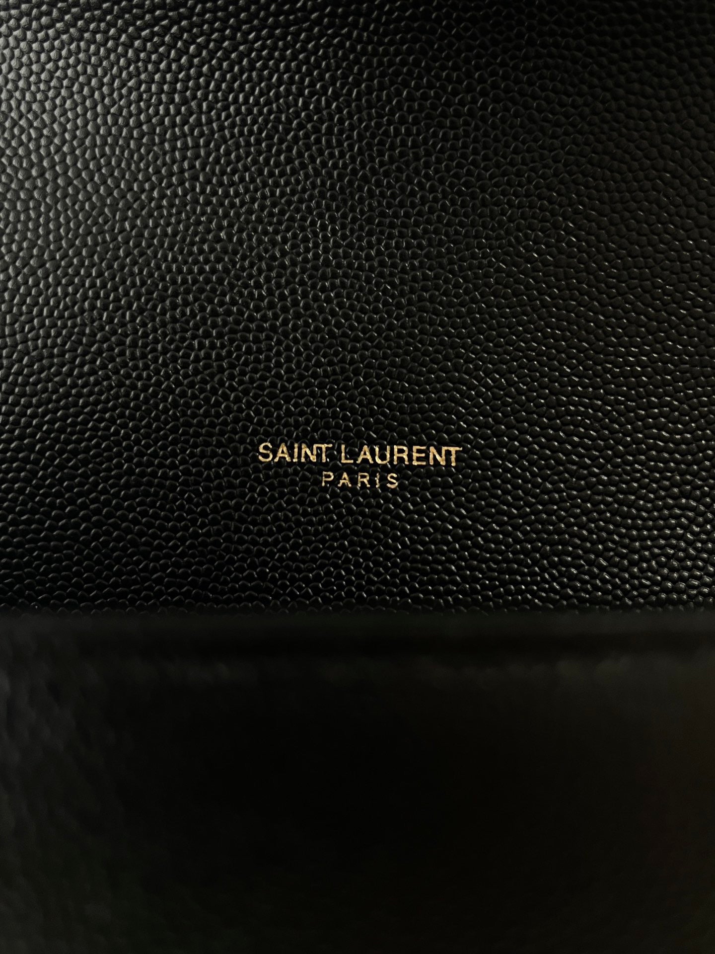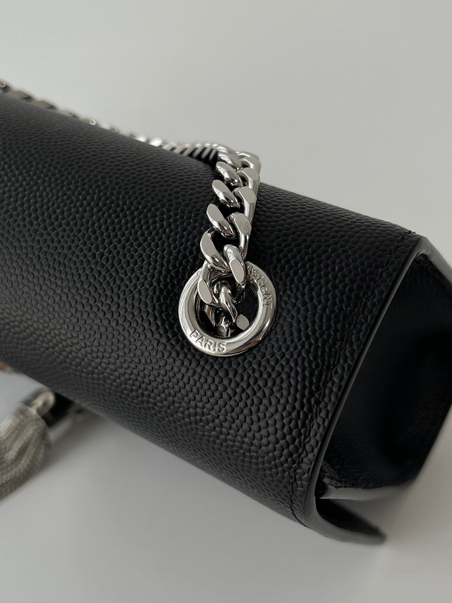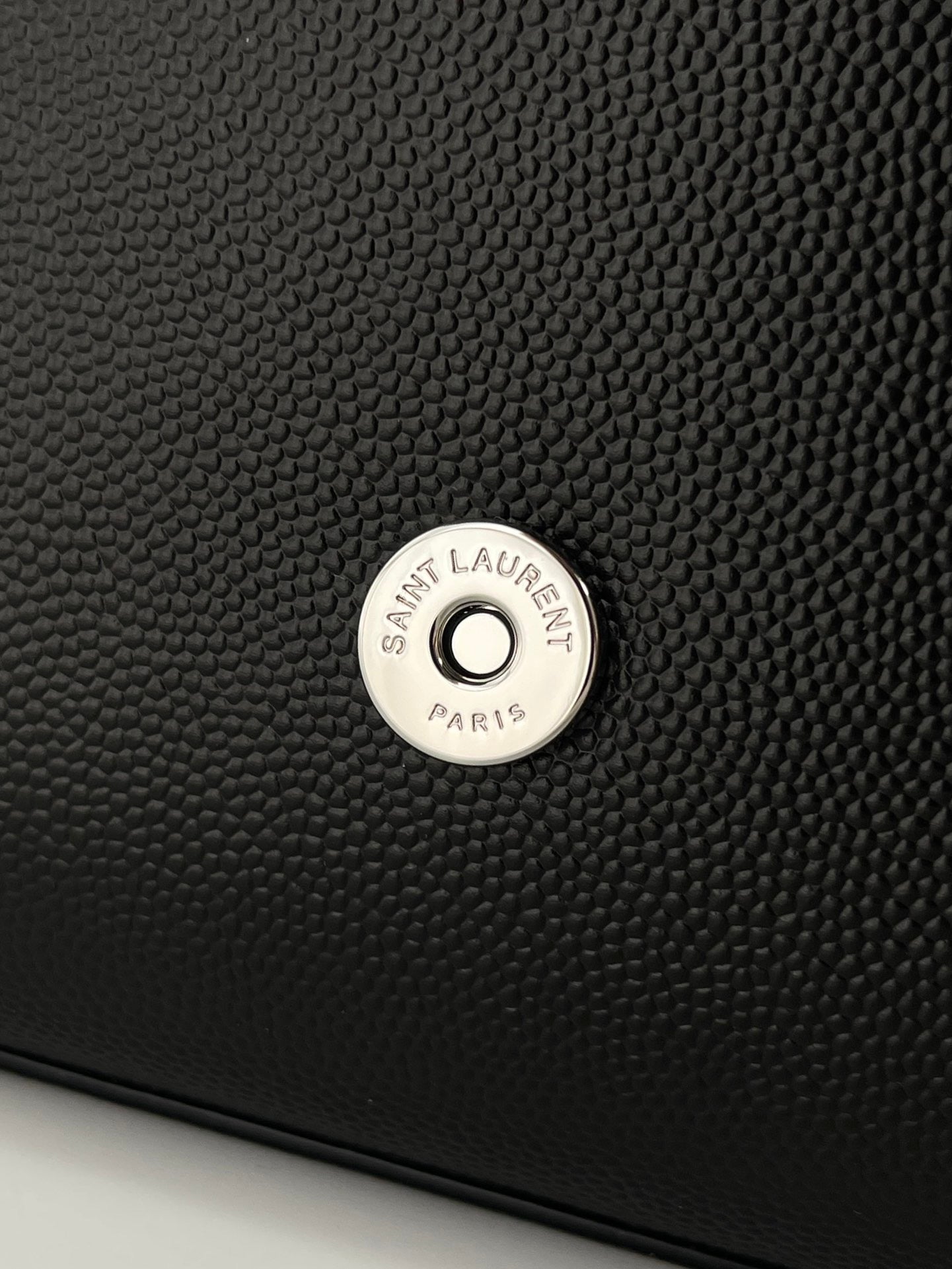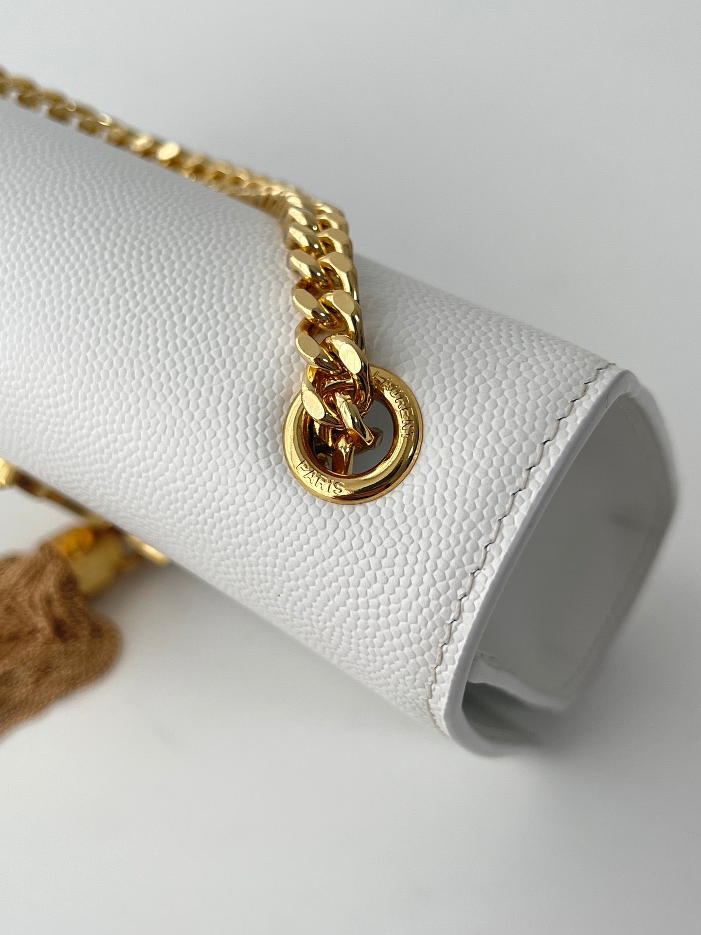 디테일: YSL 메탈 로고, 체인 스트랩, 메탈 테슬 장식, 마그네틱 플랩 클로저
