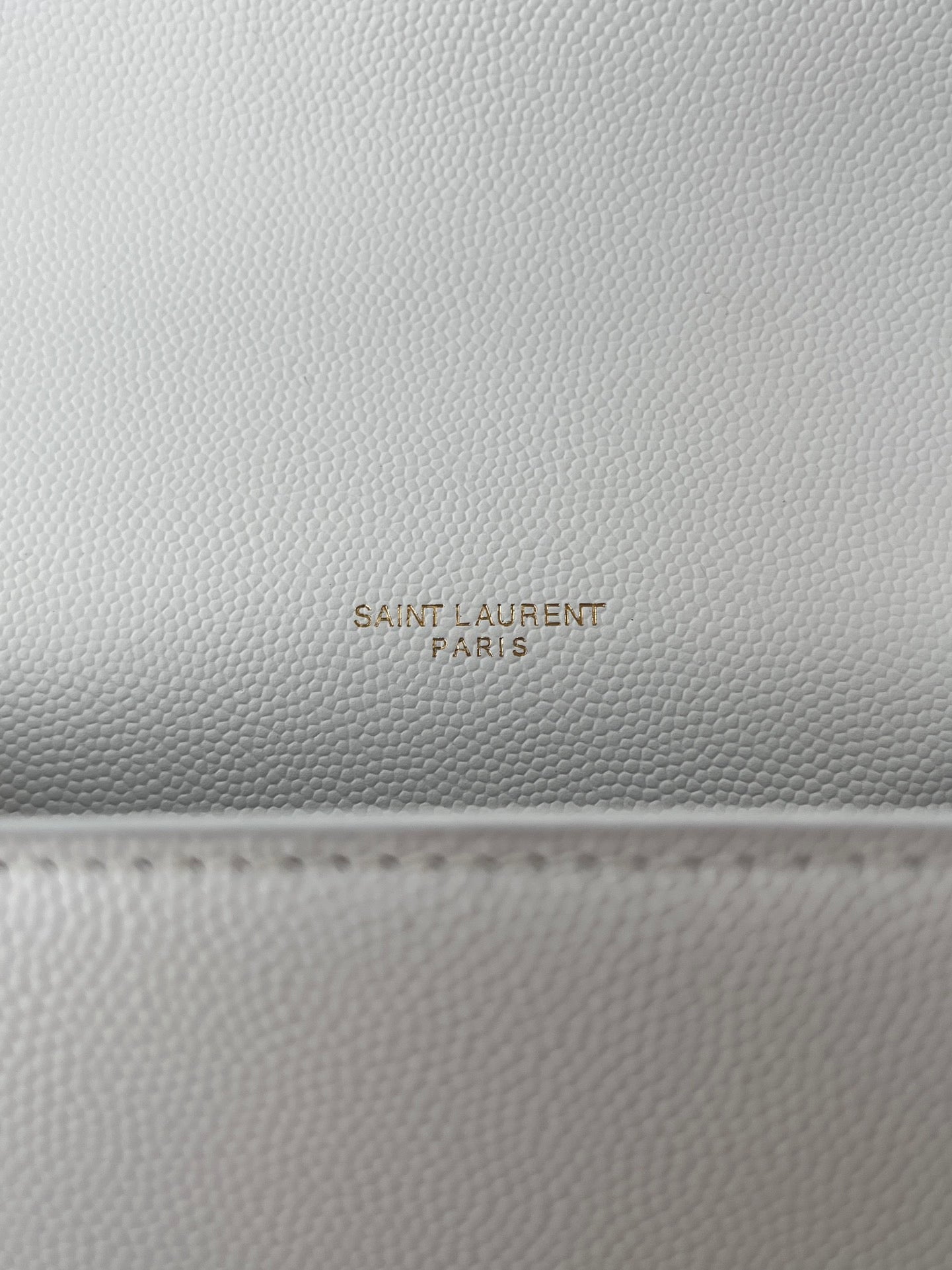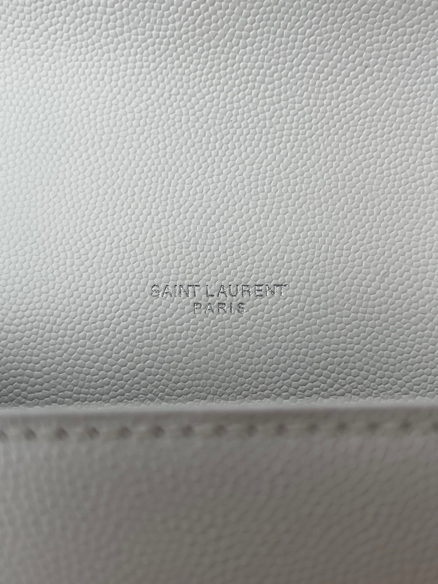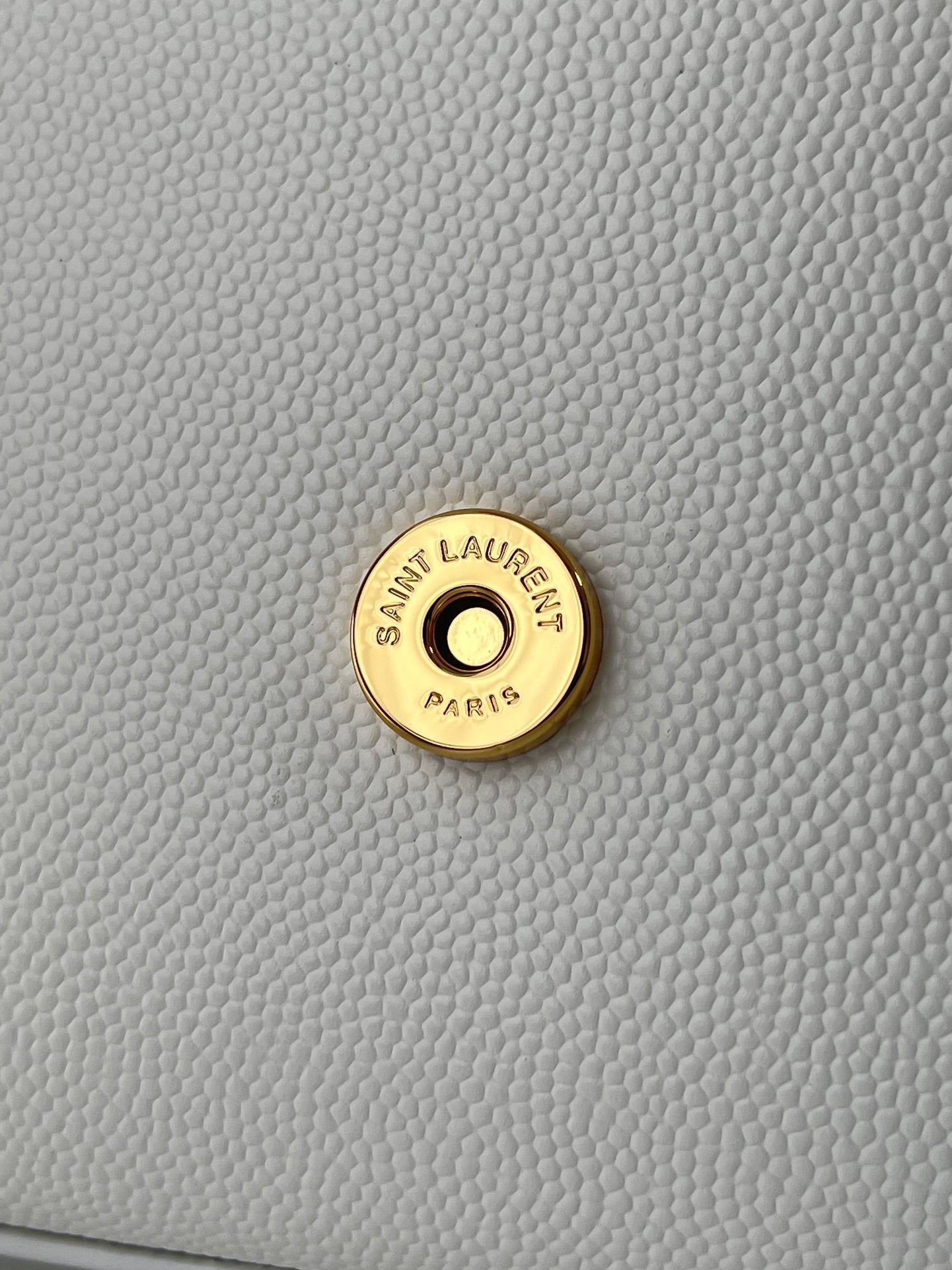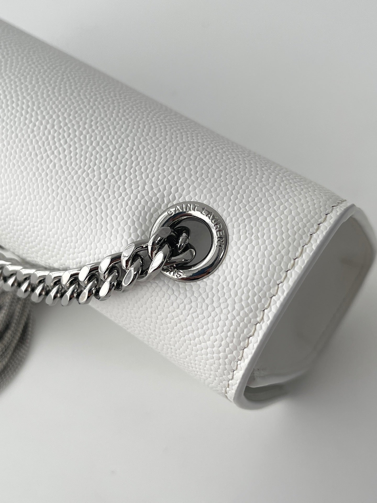 디테일: YSL 메탈 로고, 체인 스트랩, 메탈 테슬 장식, 마그네틱 플랩 클로저