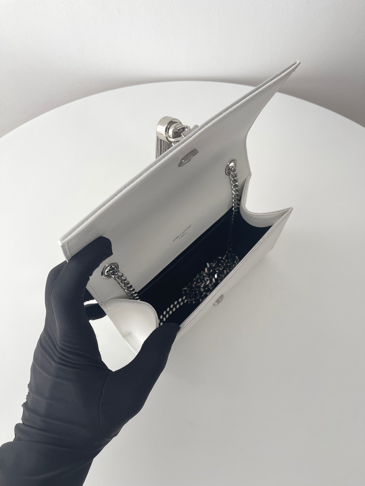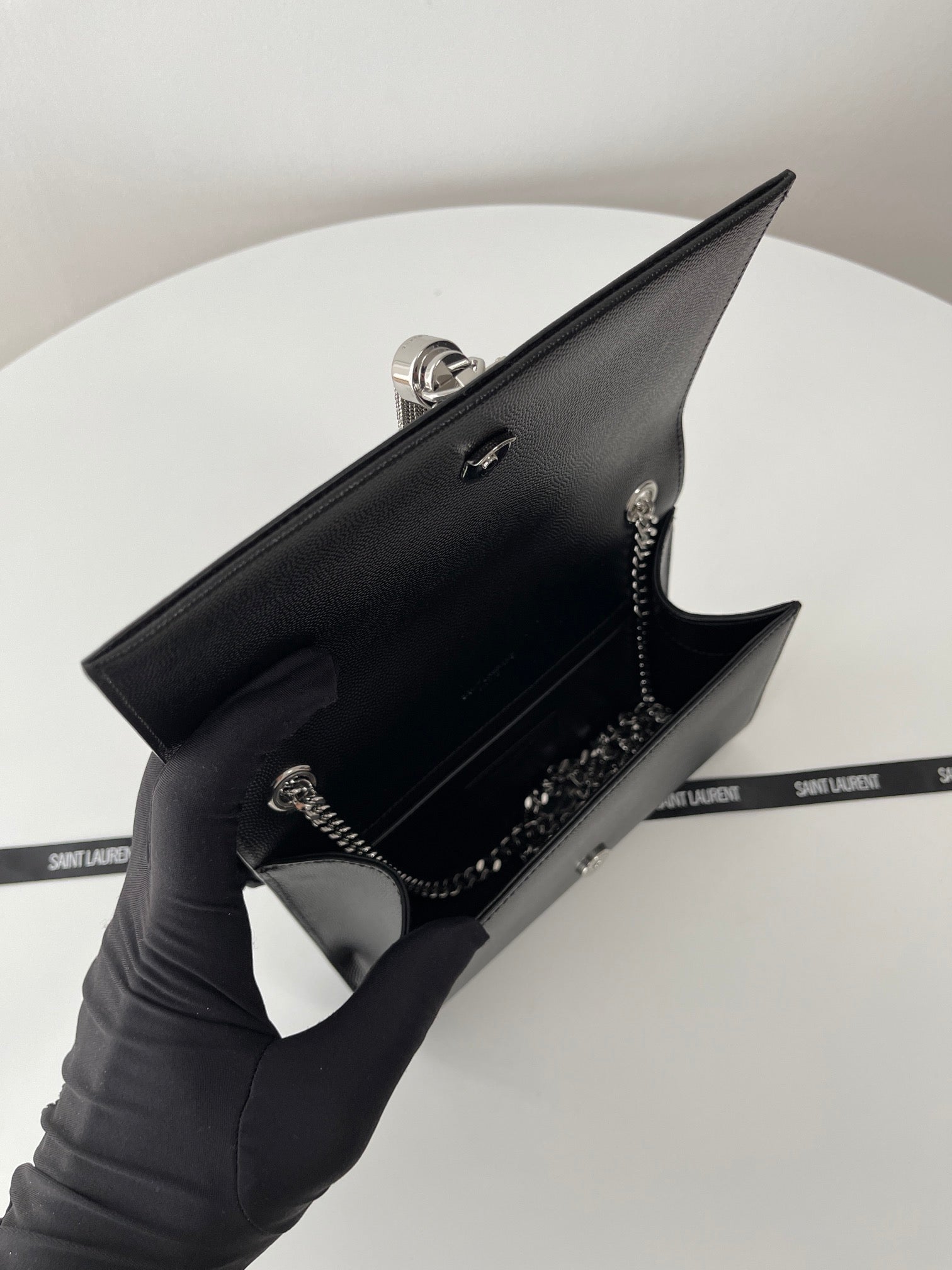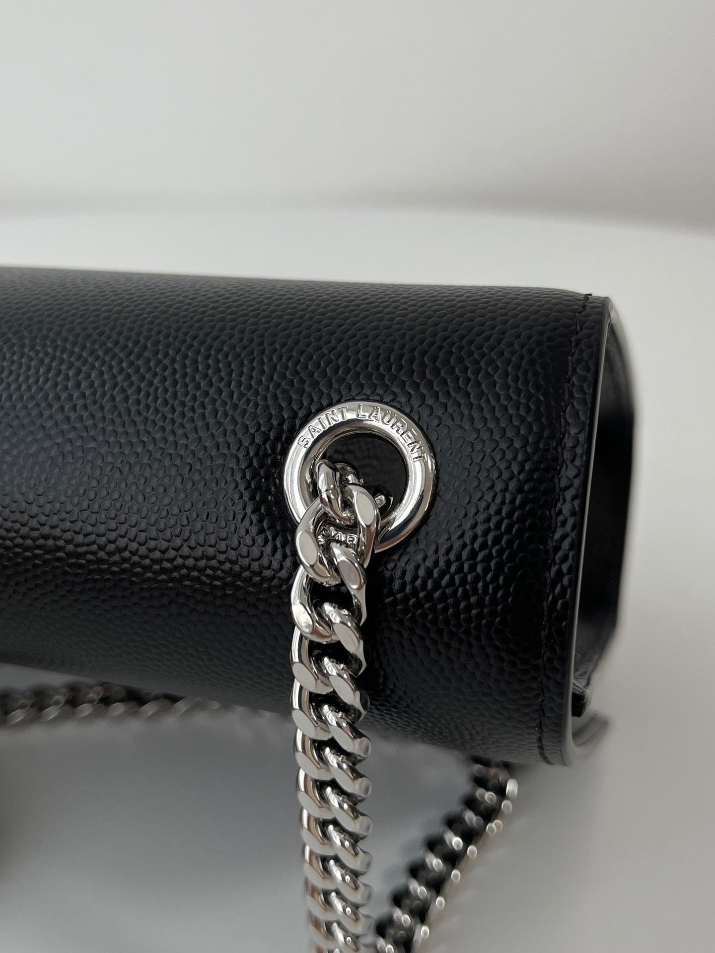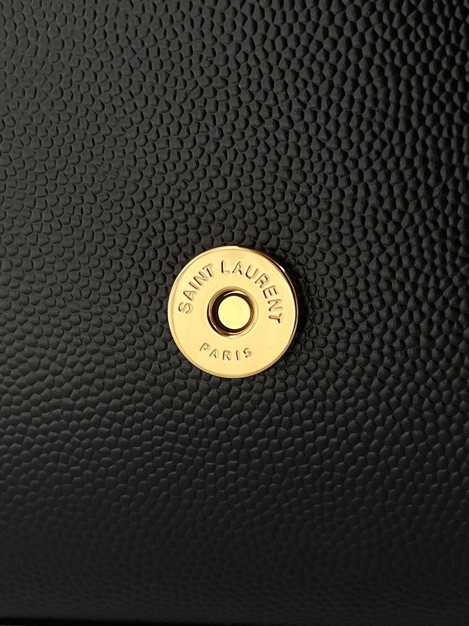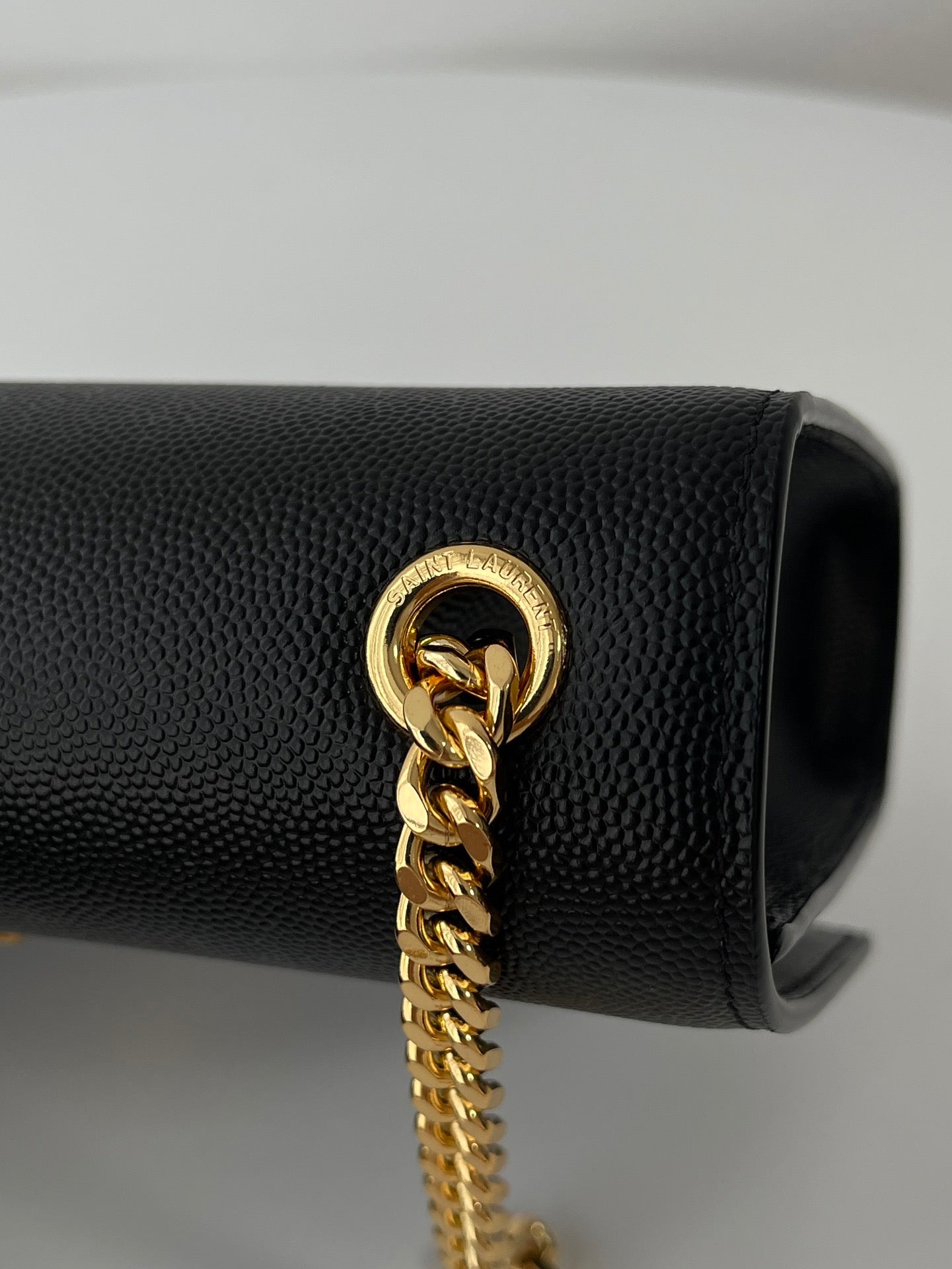 디테일: YSL 메탈 로고, 체인 스트랩, 메탈 테슬 장식, 마그네틱 플랩 클로저