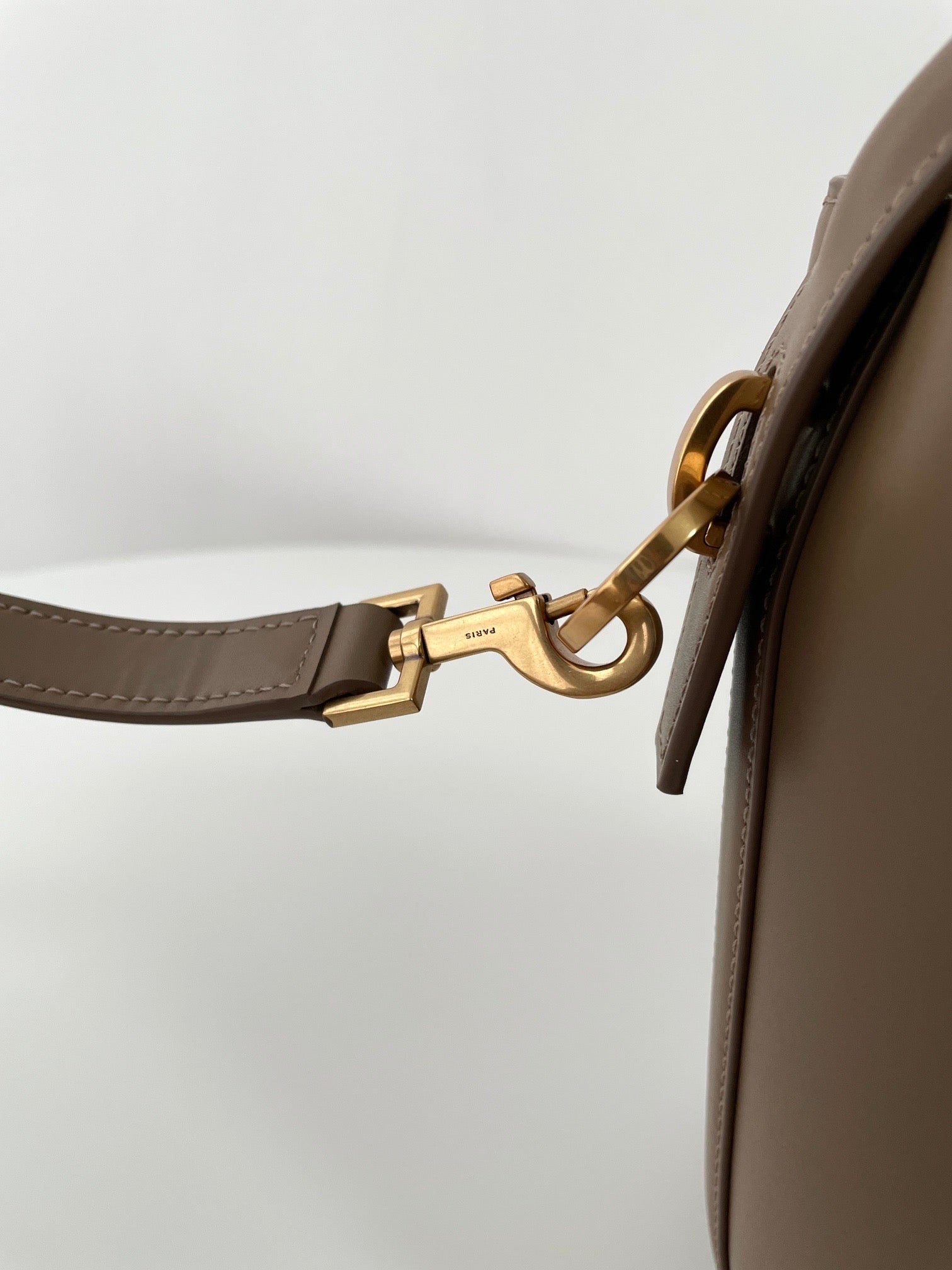 컴팩트한 실루엣임에도 곡선과 각의 조화가 돋보이며, 스트링 클로저와 실버 톤 YSL 로고 장식이 심플하면서도 세련된 인상을 줍니다. 내부에는 소지품을 효율적으로 수납할 수 있는 파우치가 포함되어 실용성도 우수합니다.