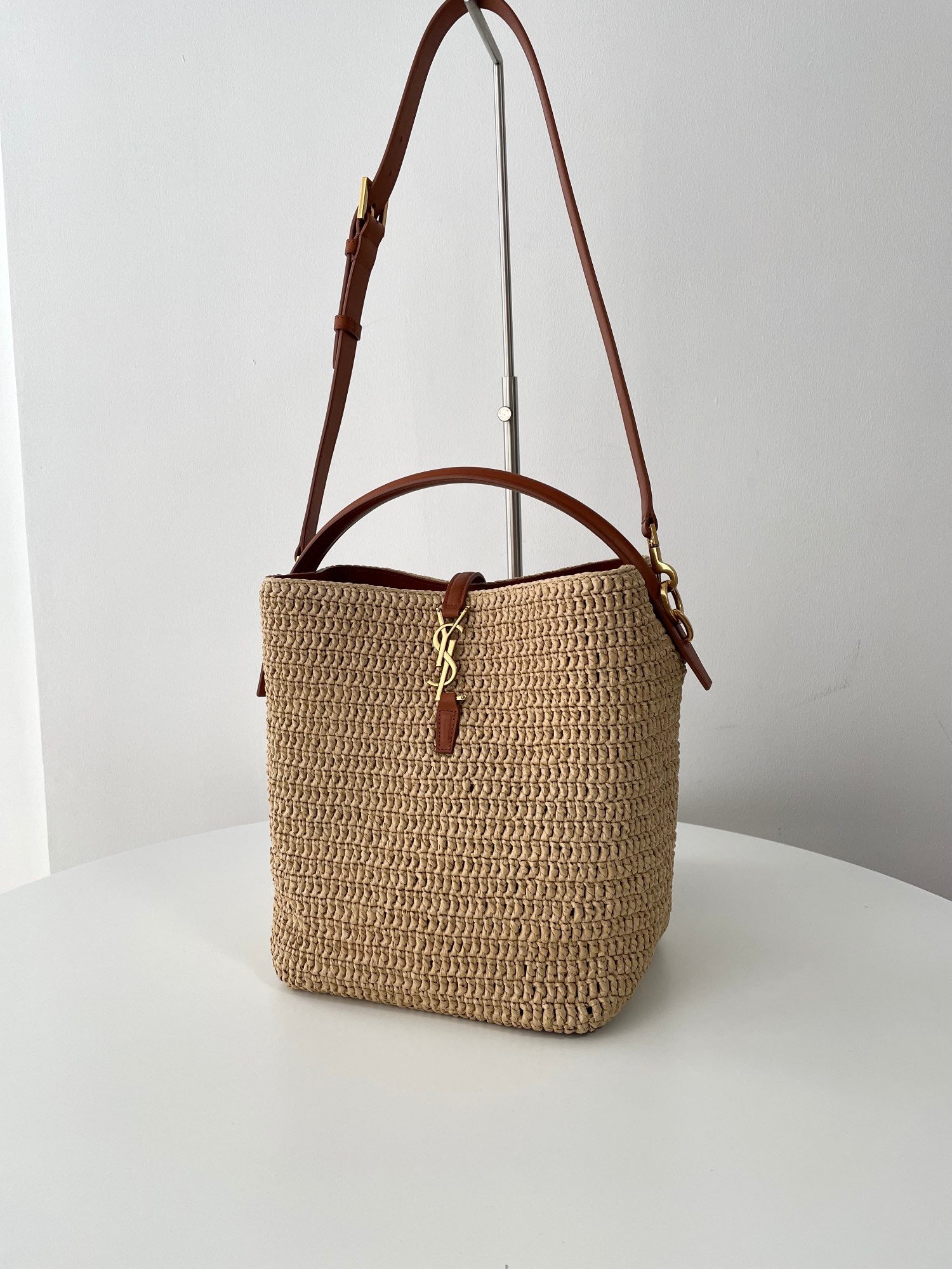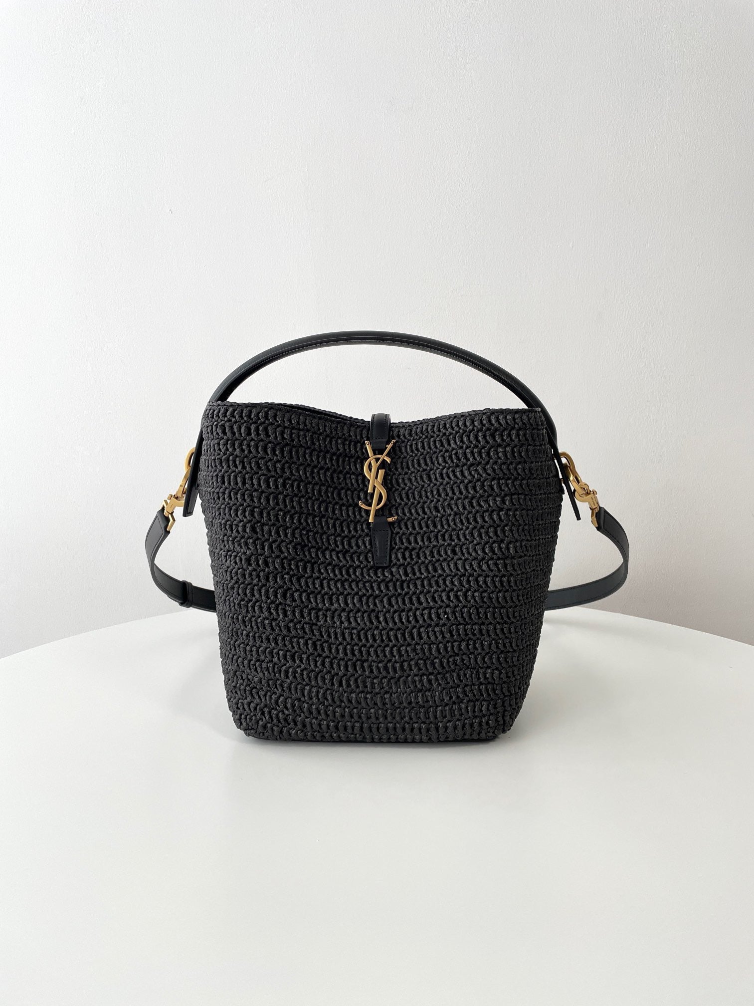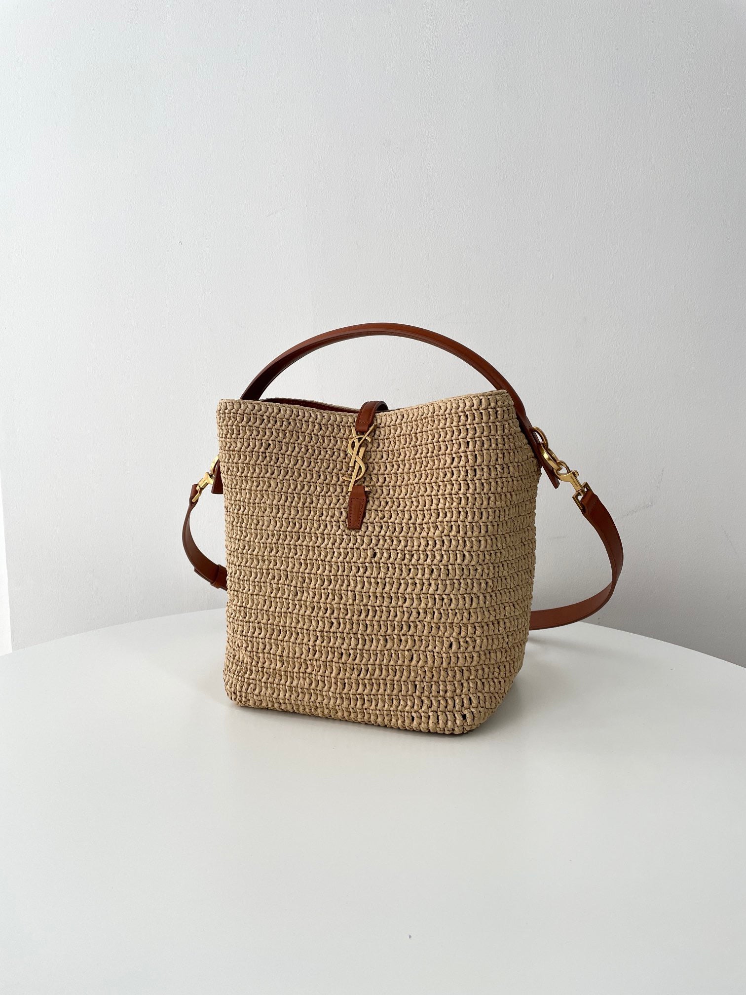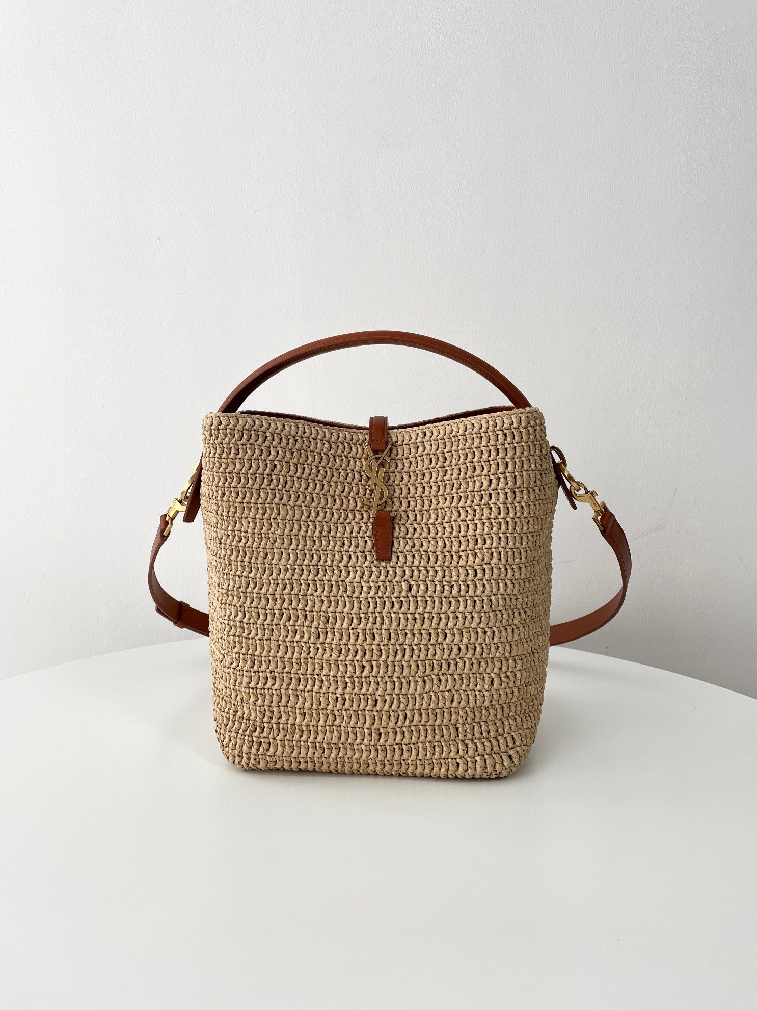 천연 라피아 소재로 짜여진 바디에 가죽 트리밍과 금속 YSL 로고 장식이 더해져 내추럴하면서도 고급스러운 분위기를 연출합니다. 구조감 있는 버킷형 실루엣과 스트링 클로저가 특징이며, 내부에 소지품을 넉넉히 수납할 수 있습니다.
