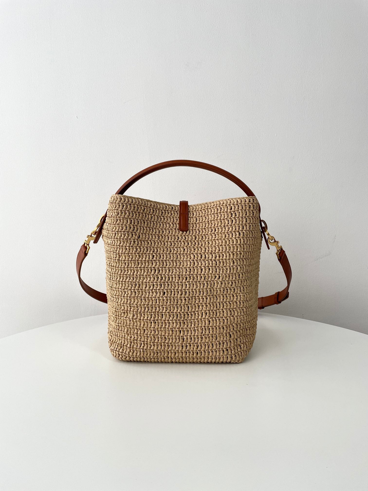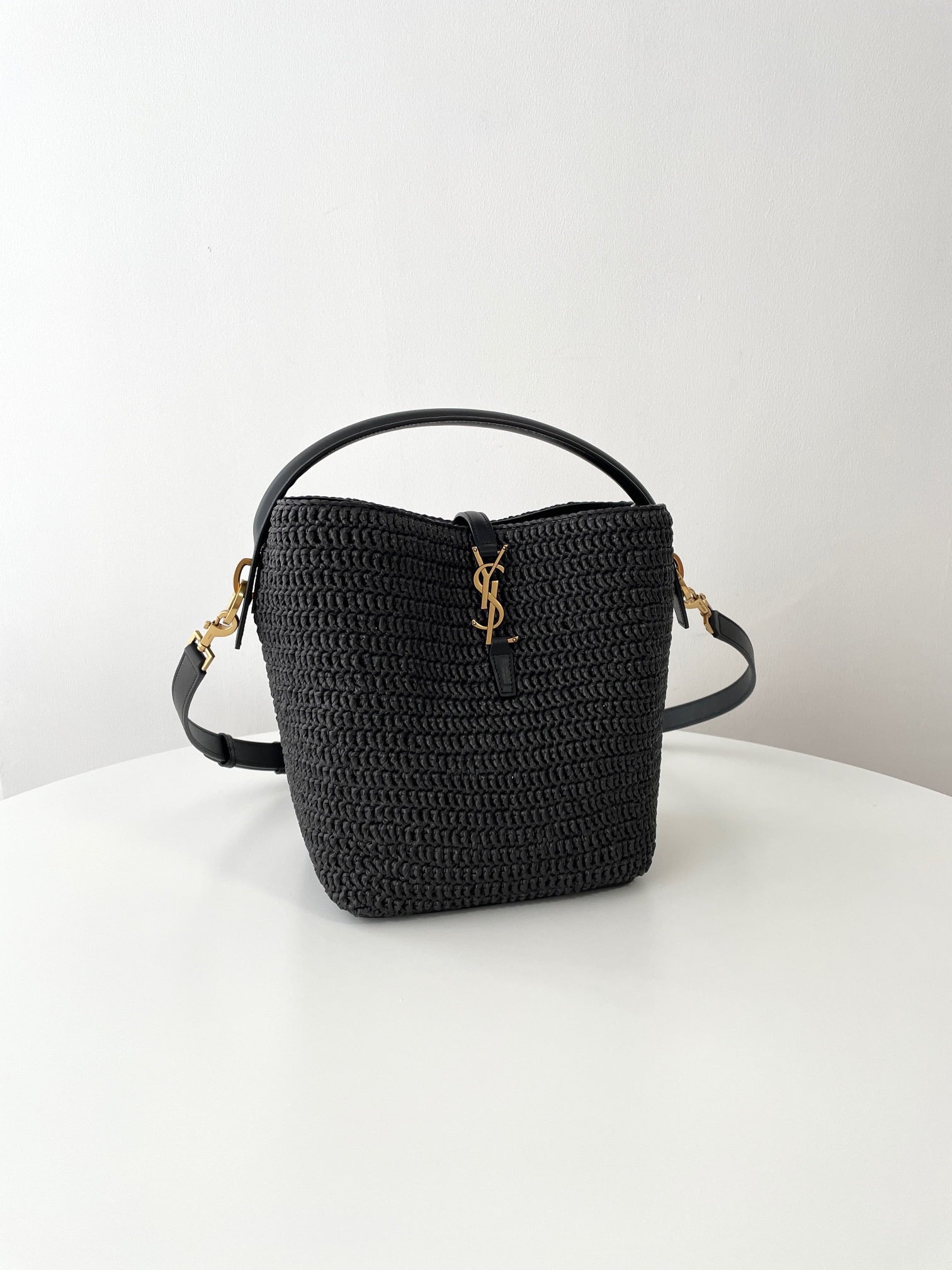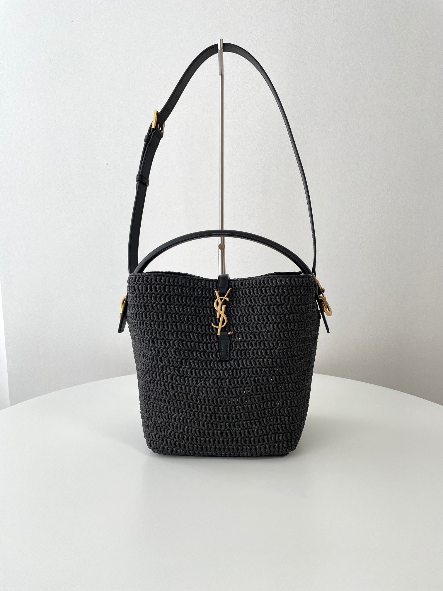 천연 라피아 소재로 짜여진 바디에 가죽 트리밍과 금속 YSL 로고 장식이 더해져 내추럴하면서도 고급스러운 분위기를 연출합니다. 구조감 있는 버킷형 실루엣과 스트링 클로저가 특징이며, 내부에 소지품을 넉넉히 수납할 수 있습니다.