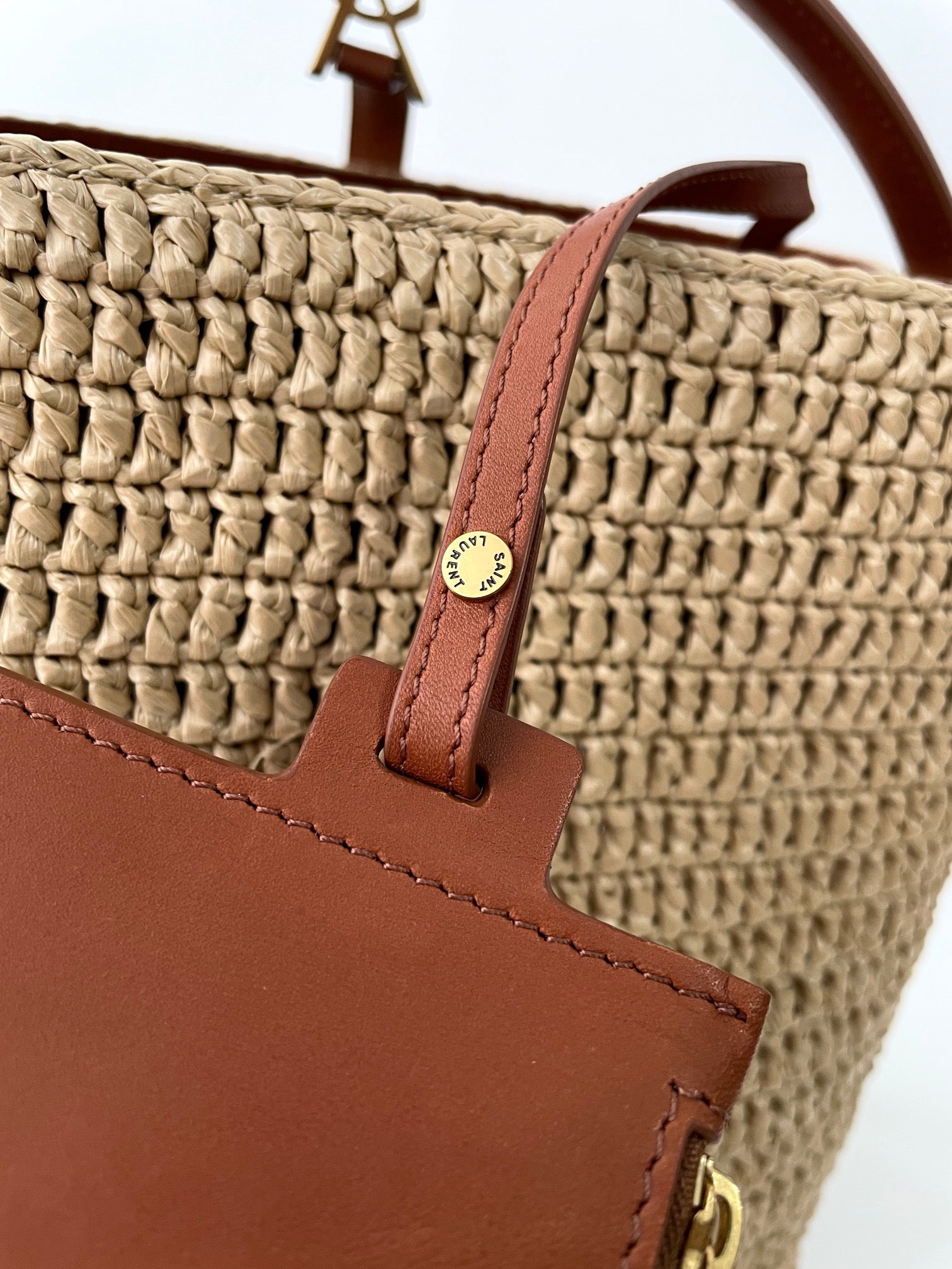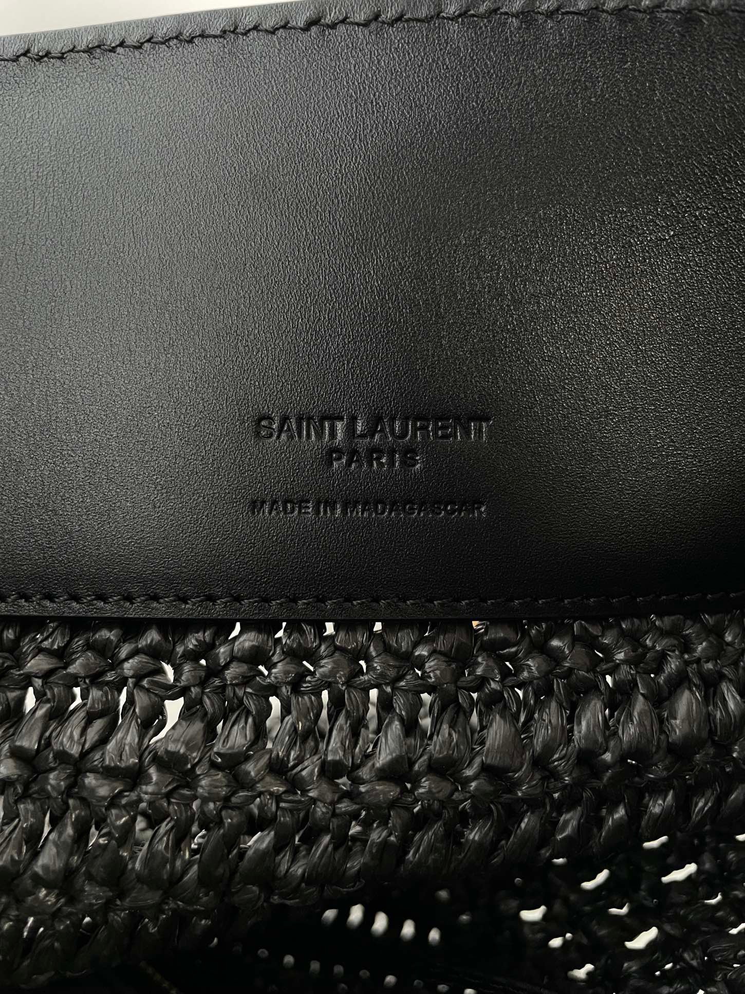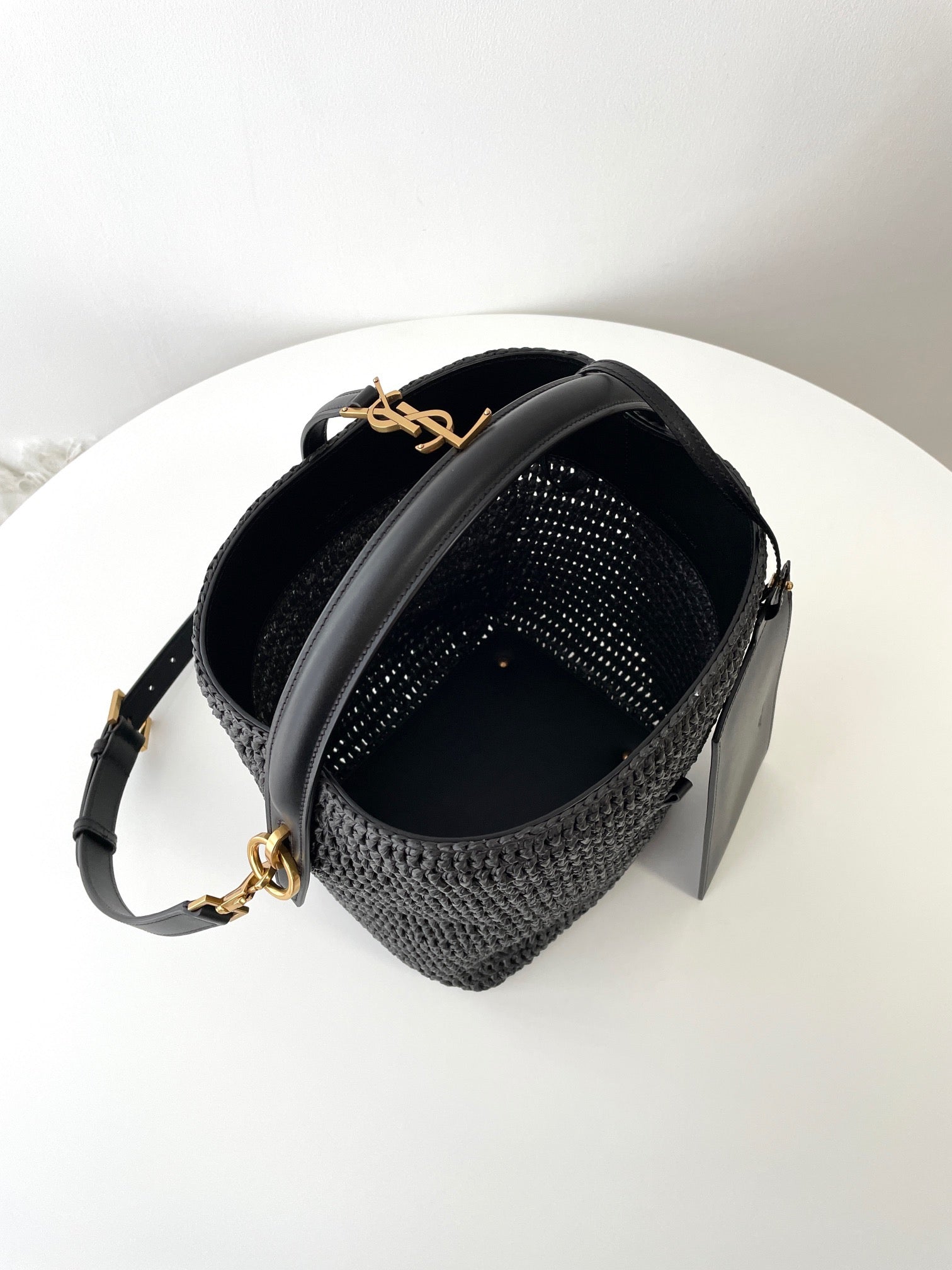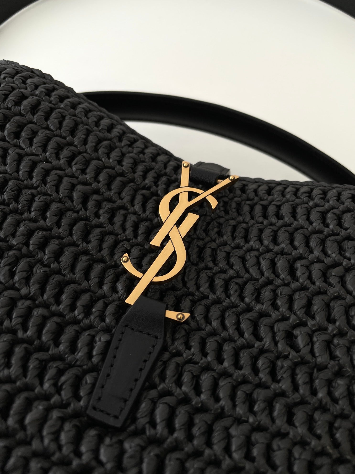 천연 라피아 소재로 짜여진 바디에 가죽 트리밍과 금속 YSL 로고 장식이 더해져 내추럴하면서도 고급스러운 분위기를 연출합니다. 구조감 있는 버킷형 실루엣과 스트링 클로저가 특징이며, 내부에 소지품을 넉넉히 수납할 수 있습니다.