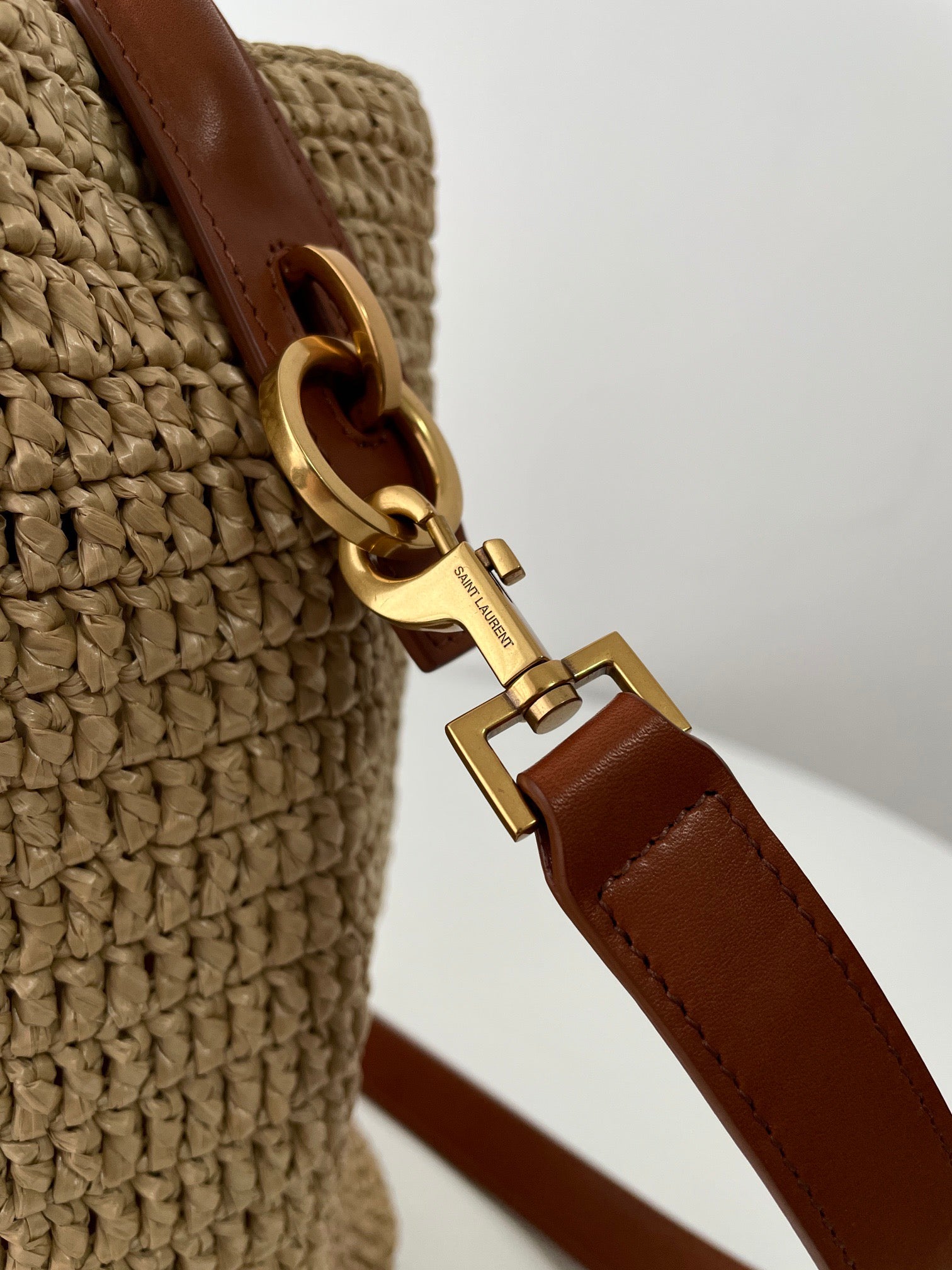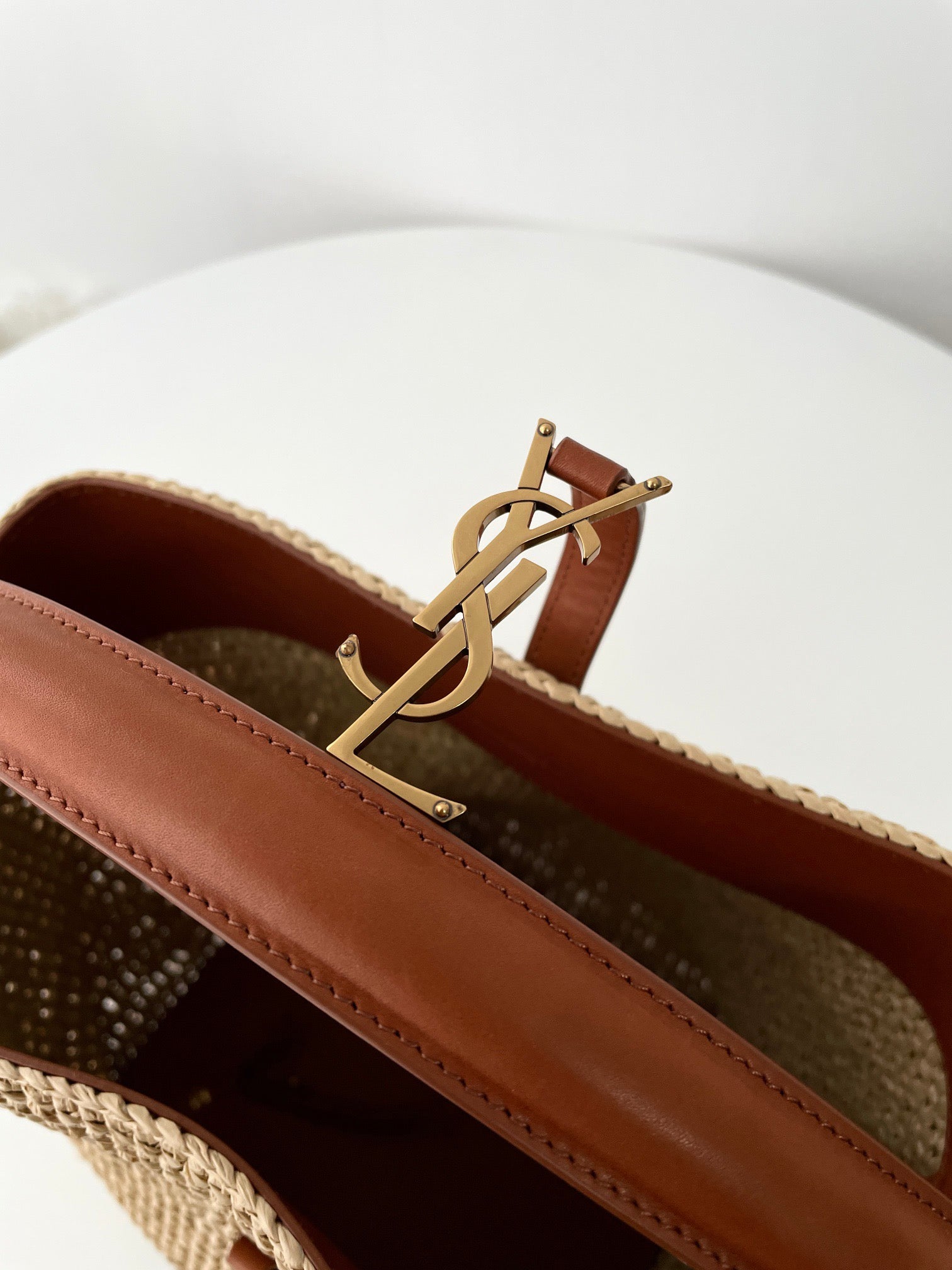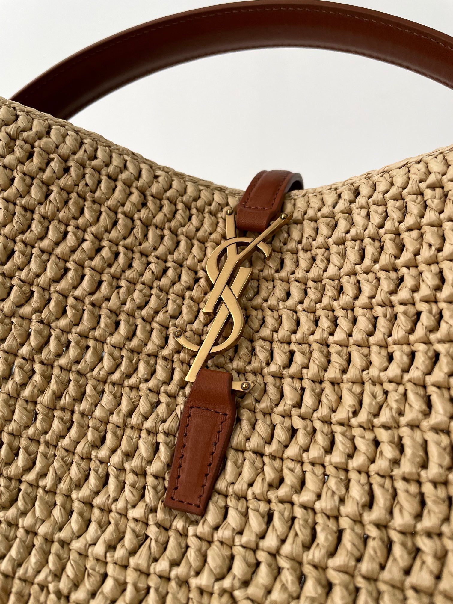 자연스러운 라피아 소재와 구조적인 버킷 디자인, YSL 로고가 어우러져 세련된 리조트 감성을 연출합니다.