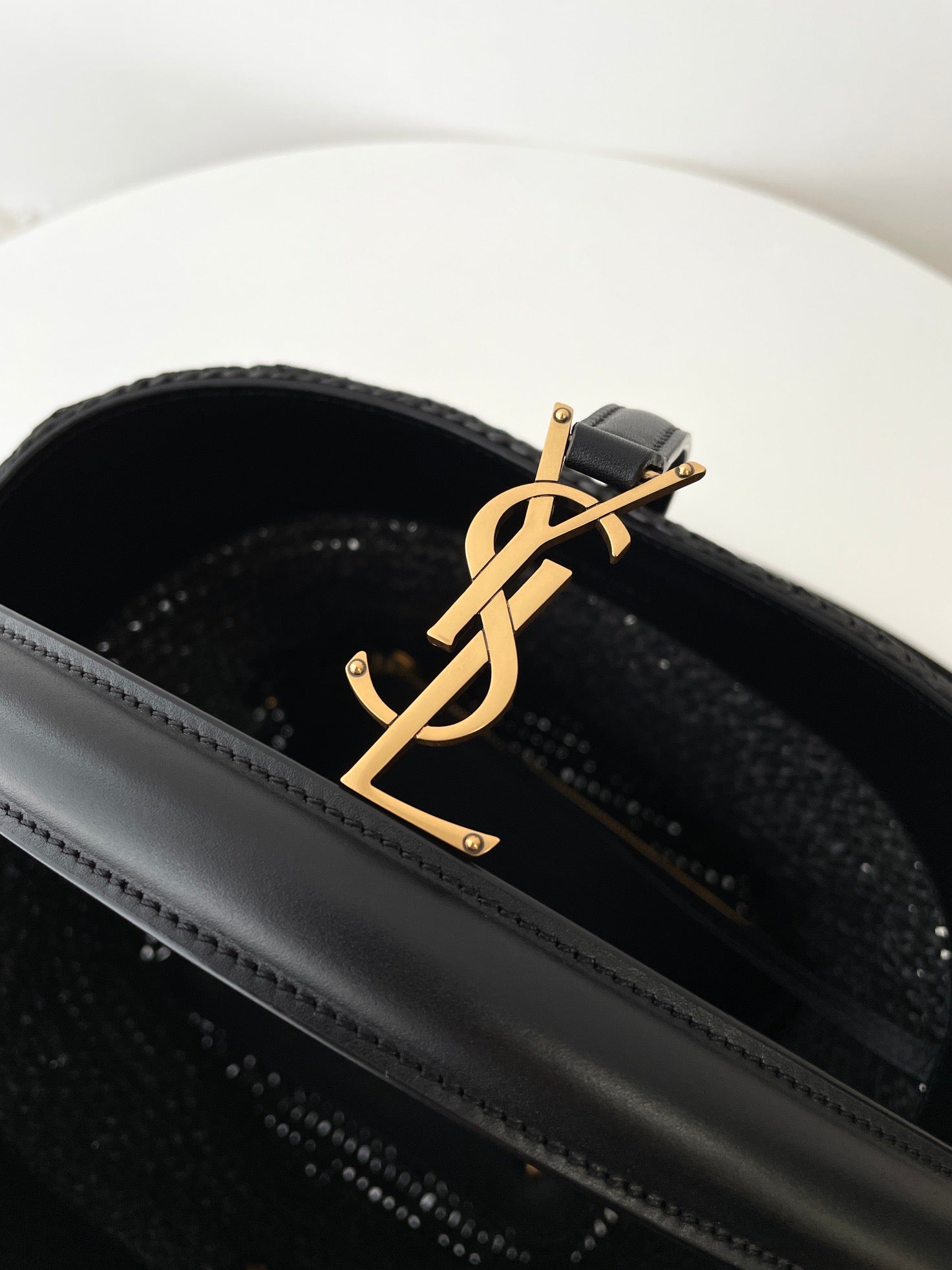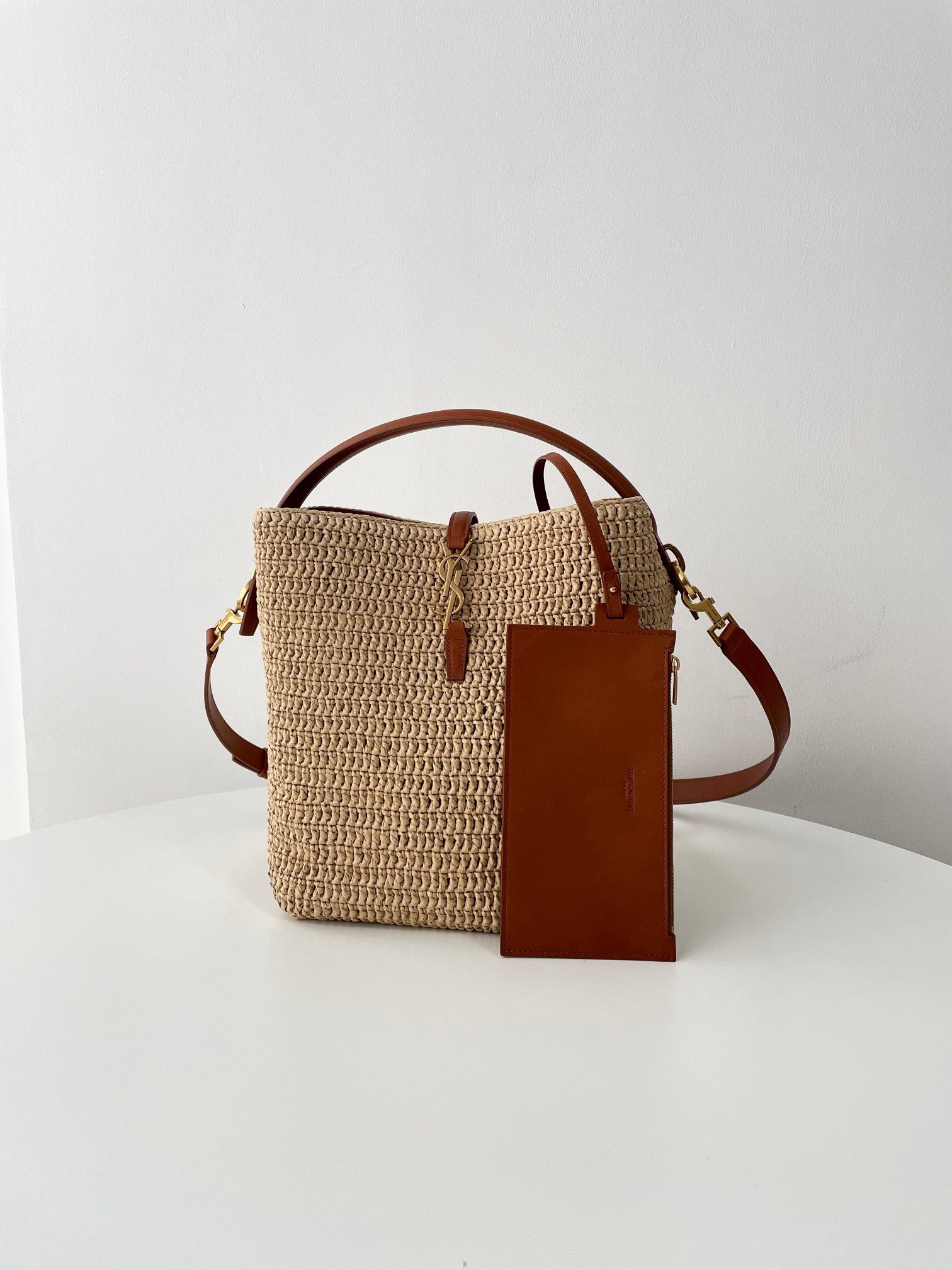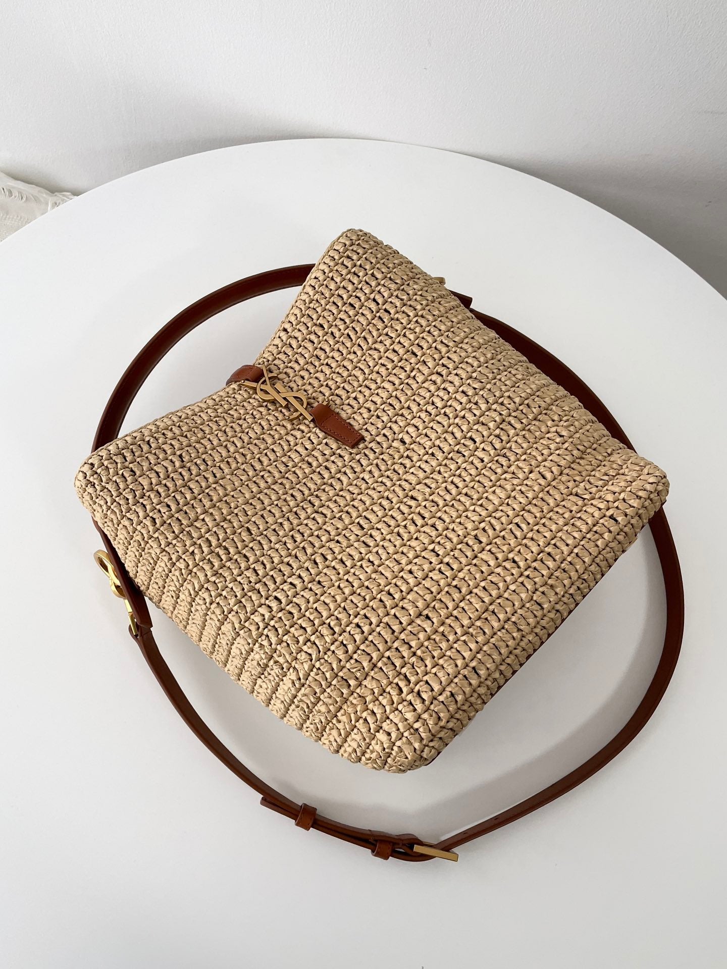 자연스러운 라피아 소재와 구조적인 버킷 디자인, YSL 로고가 어우러져 세련된 리조트 감성을 연출합니다.