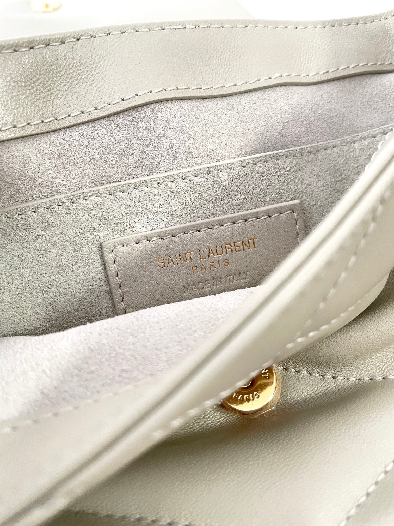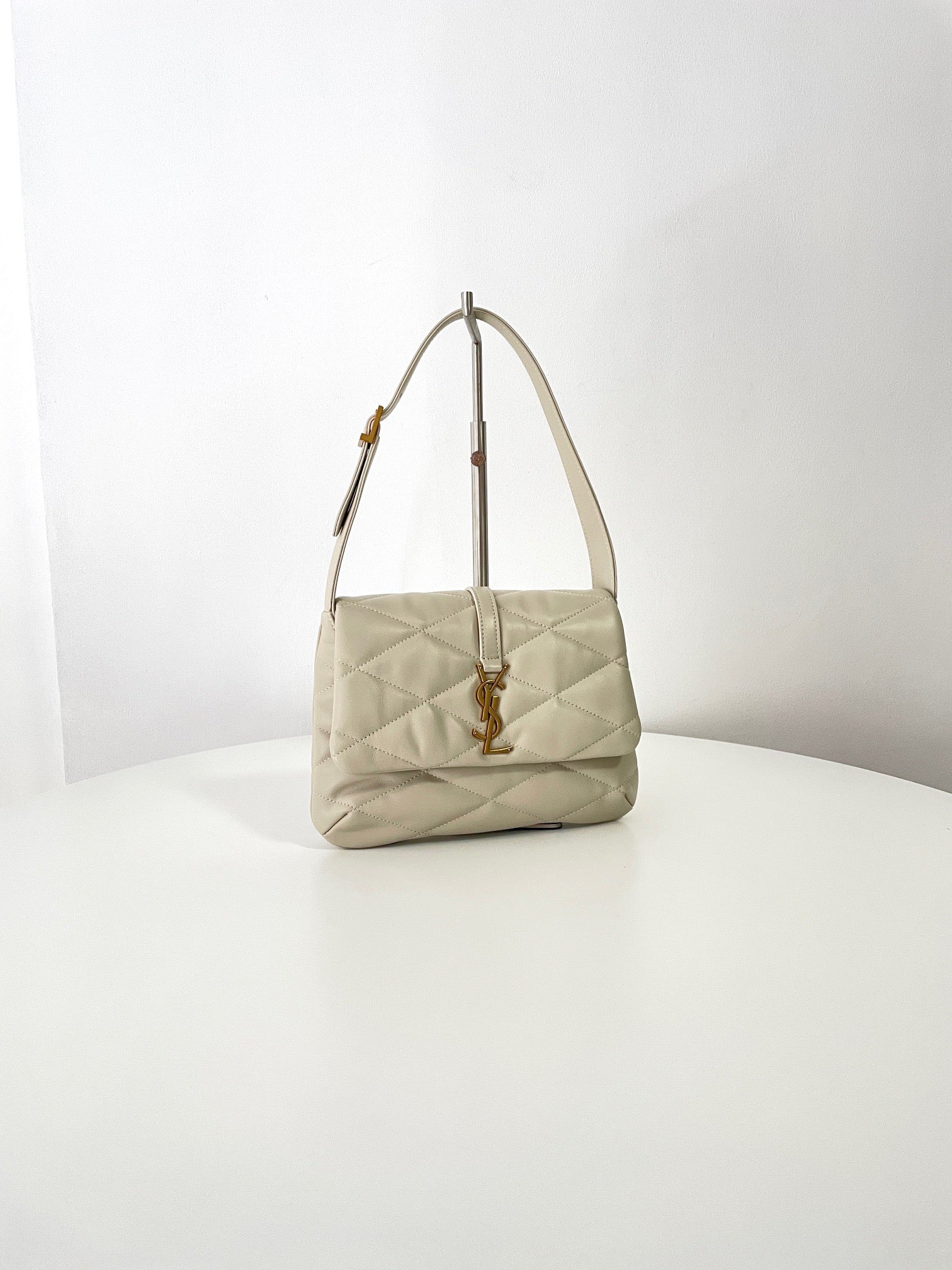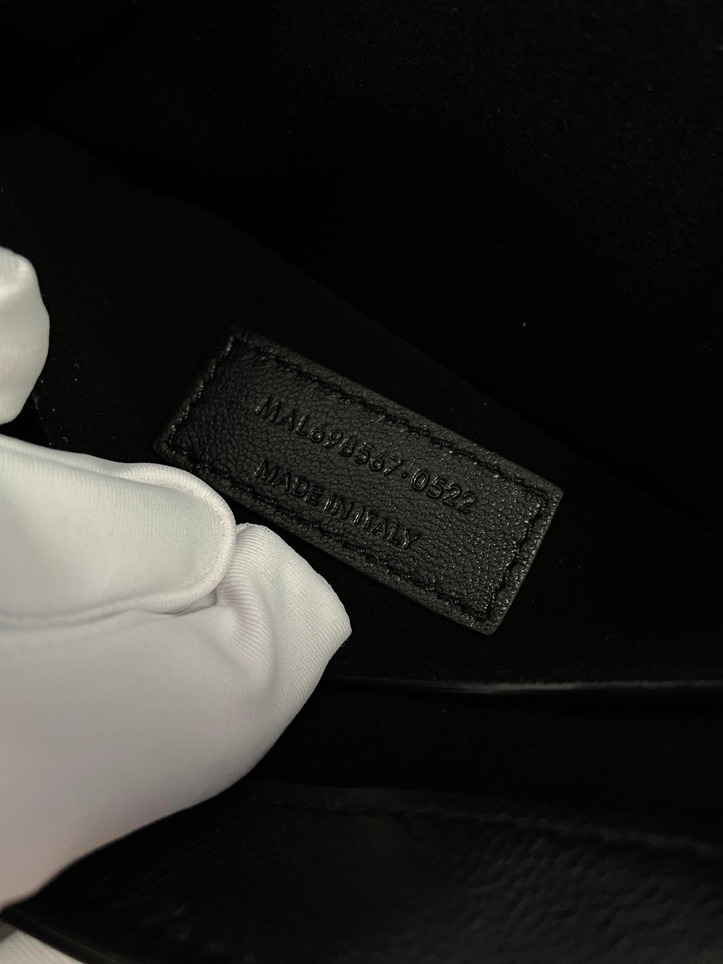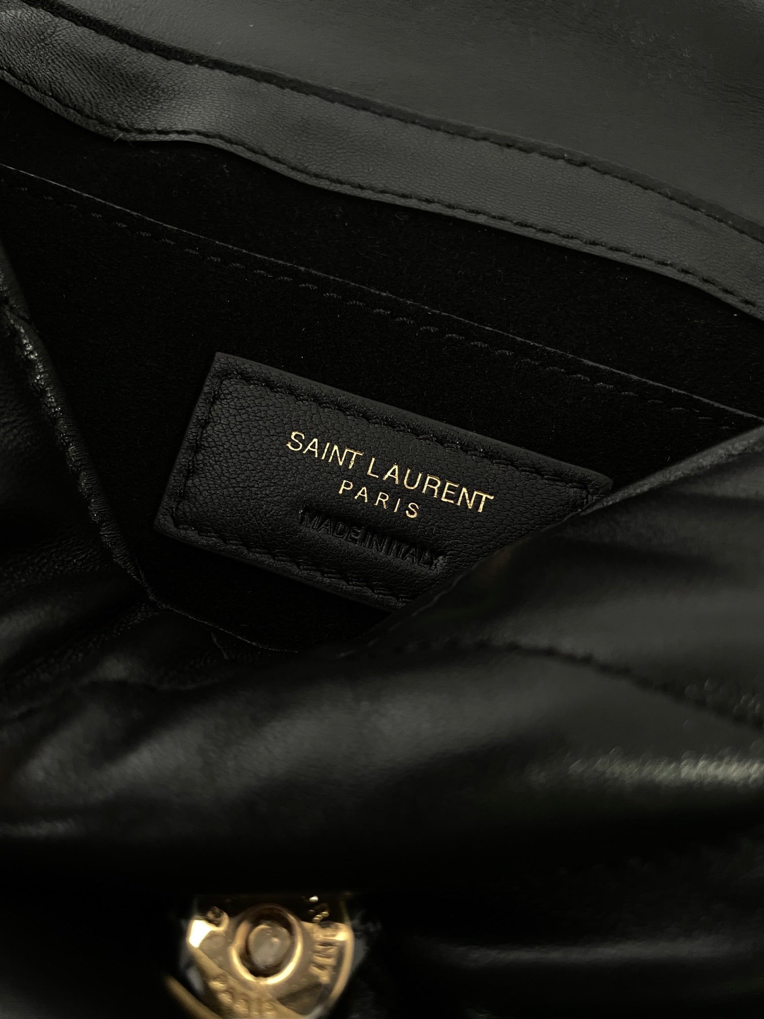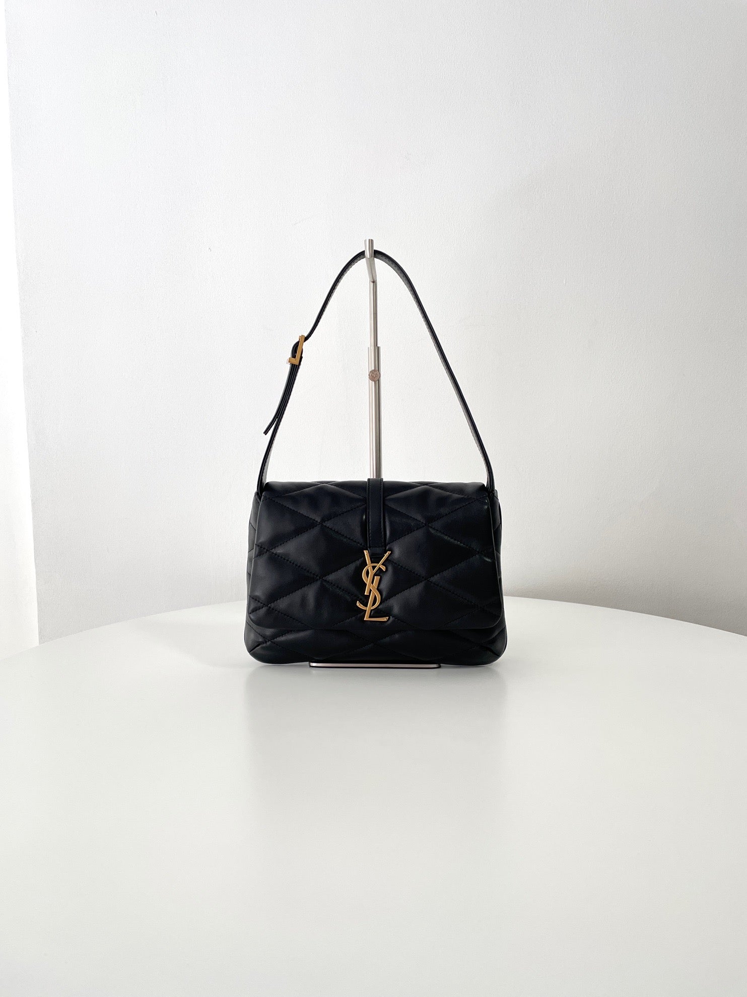 특징: 수직 퀼팅, YSL 로고, 플랩 마그네틱 클로저, 내부 포켓, 조절 가능한 스트랩